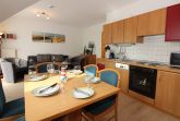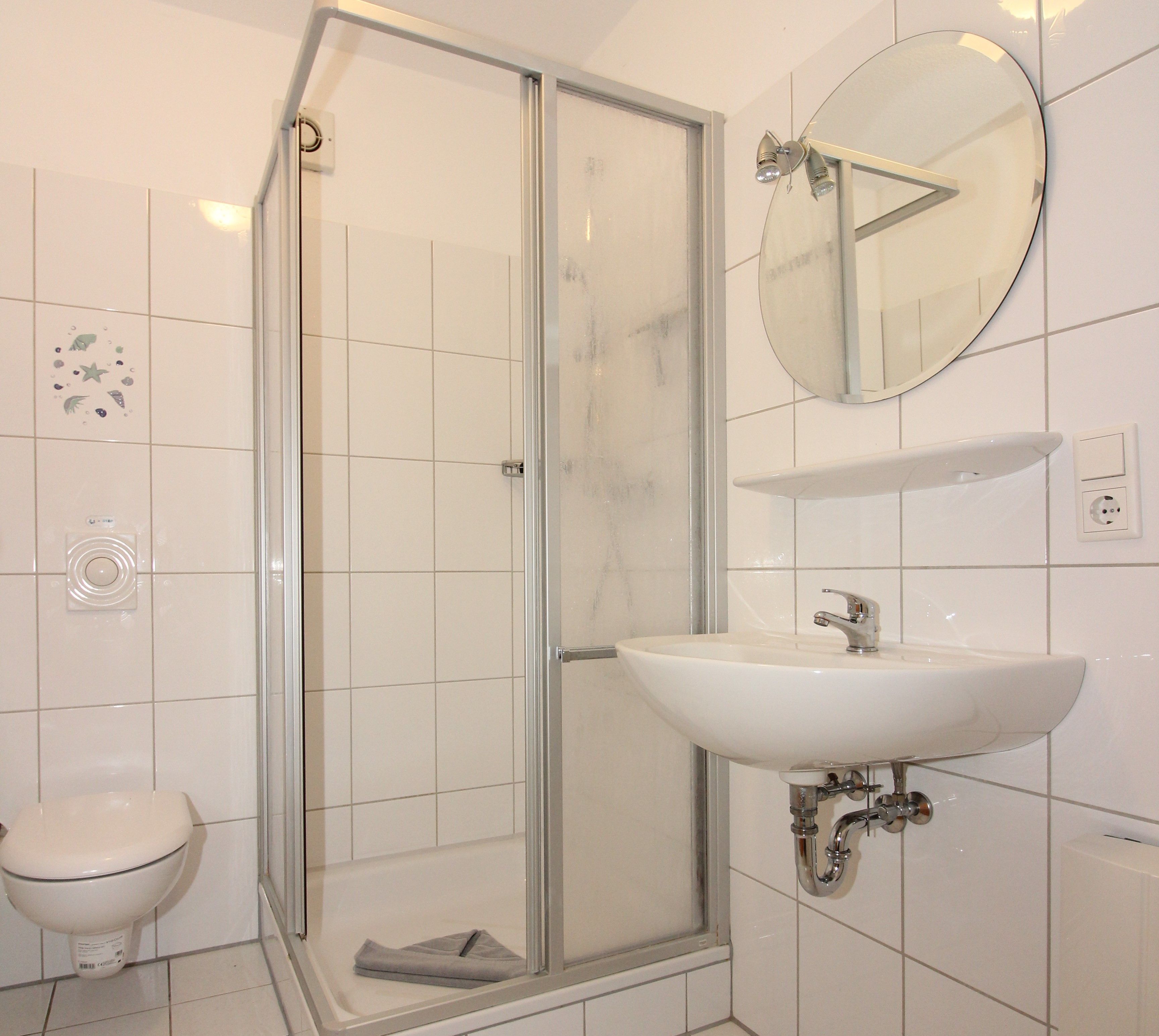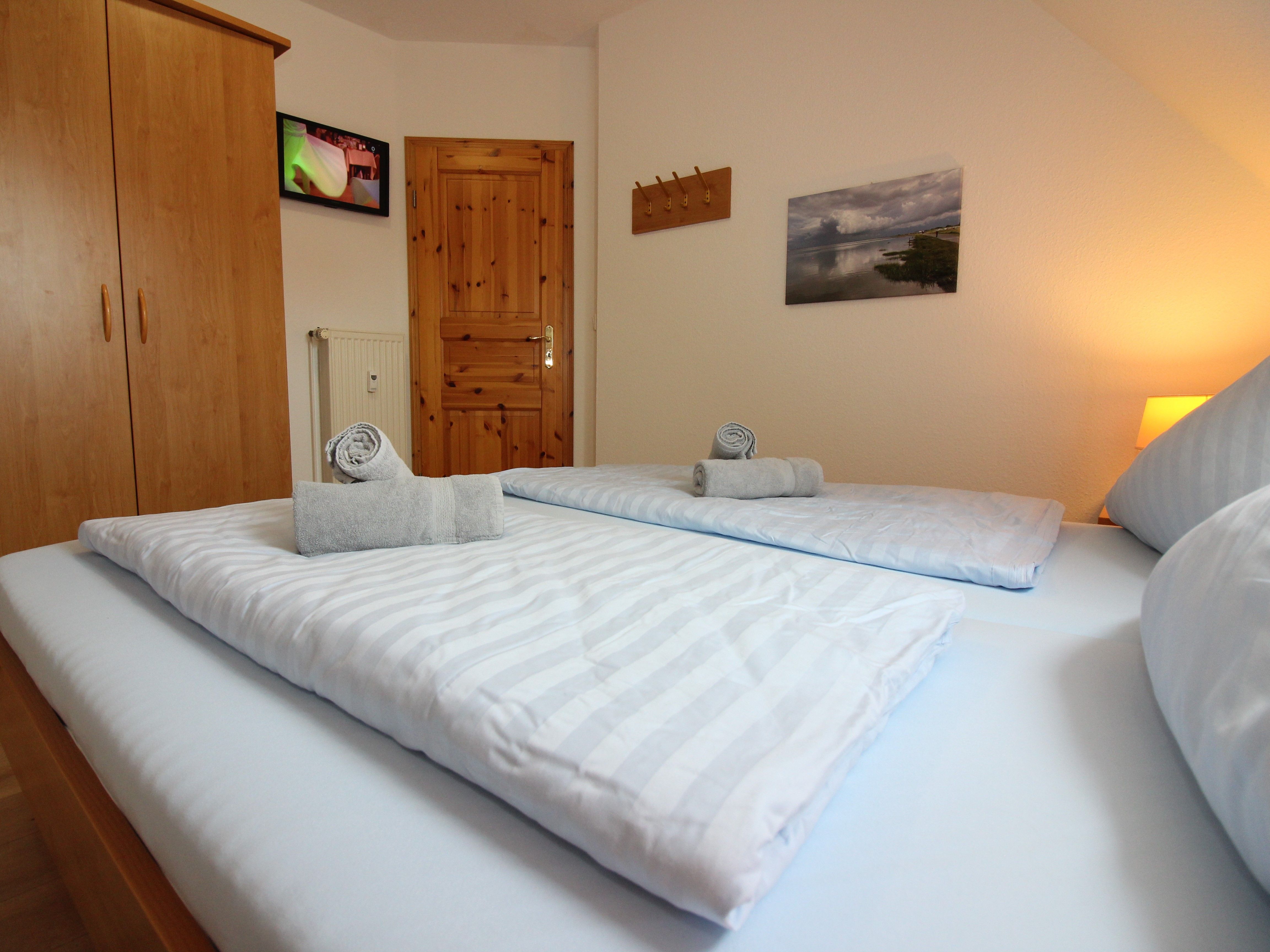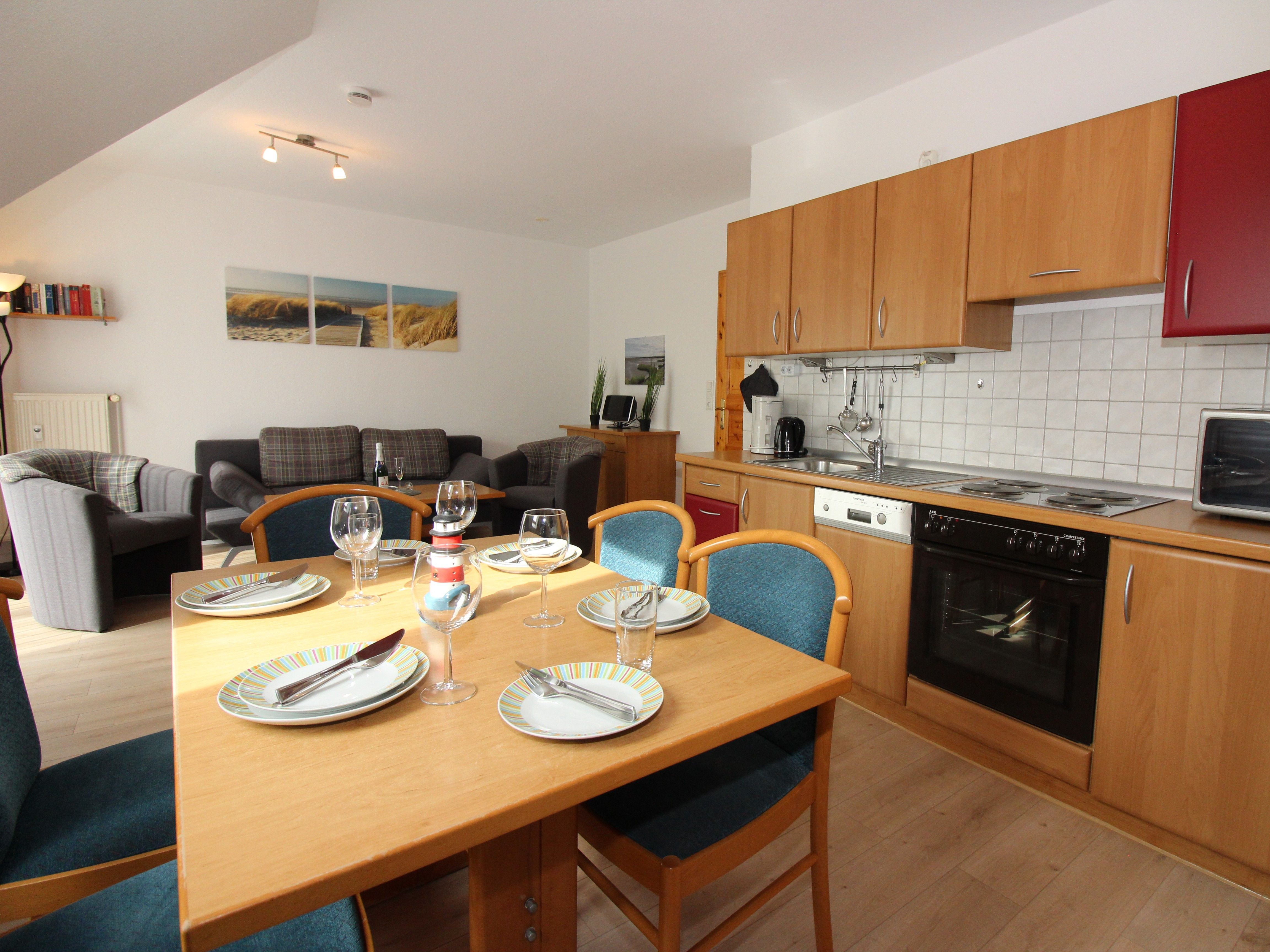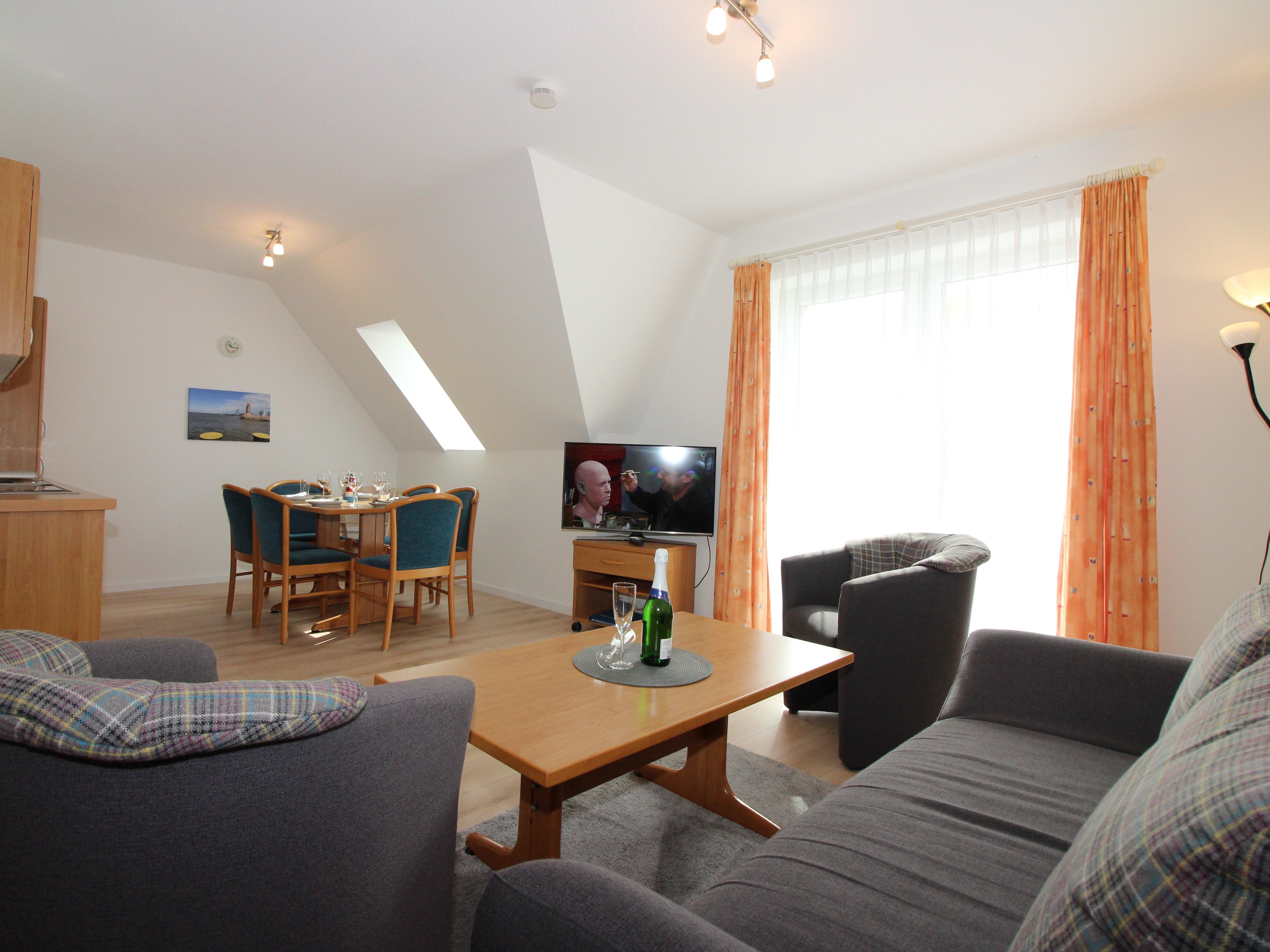 Sie wohnen in einem 3-Raum-Appartement im Obergeschoss für bis zu 6 Personen auf ca. 50 m² Wohnfläche. Die Wohnung verfügt über einen Schlafraum mit Doppelbett und einem LCD Flachbild-TV, ein Kinderzimmer mit zwei einzeln stehende Betten, einen hellen Wohn- Schlafraum mit bequemer Doppelbettcouch nebst voll ausgestattetem Küchenbereich mit Geschirrspüler und Mikrowelle, einem separaten Essplatz sowie Bad mit Dusche/WC und Föhn. Moderner Linoleumboden im Schlafzimmer, im Kinderzimmer und im Wohnbereich.