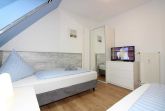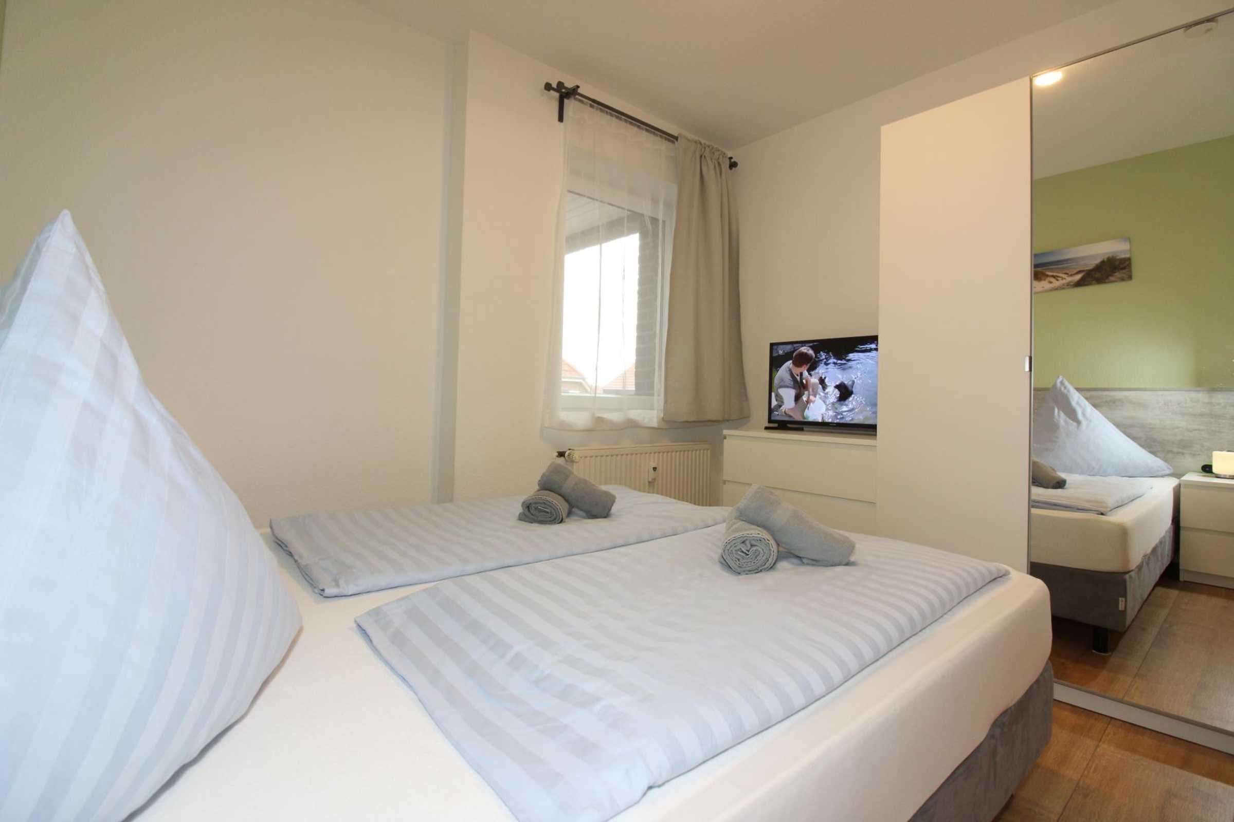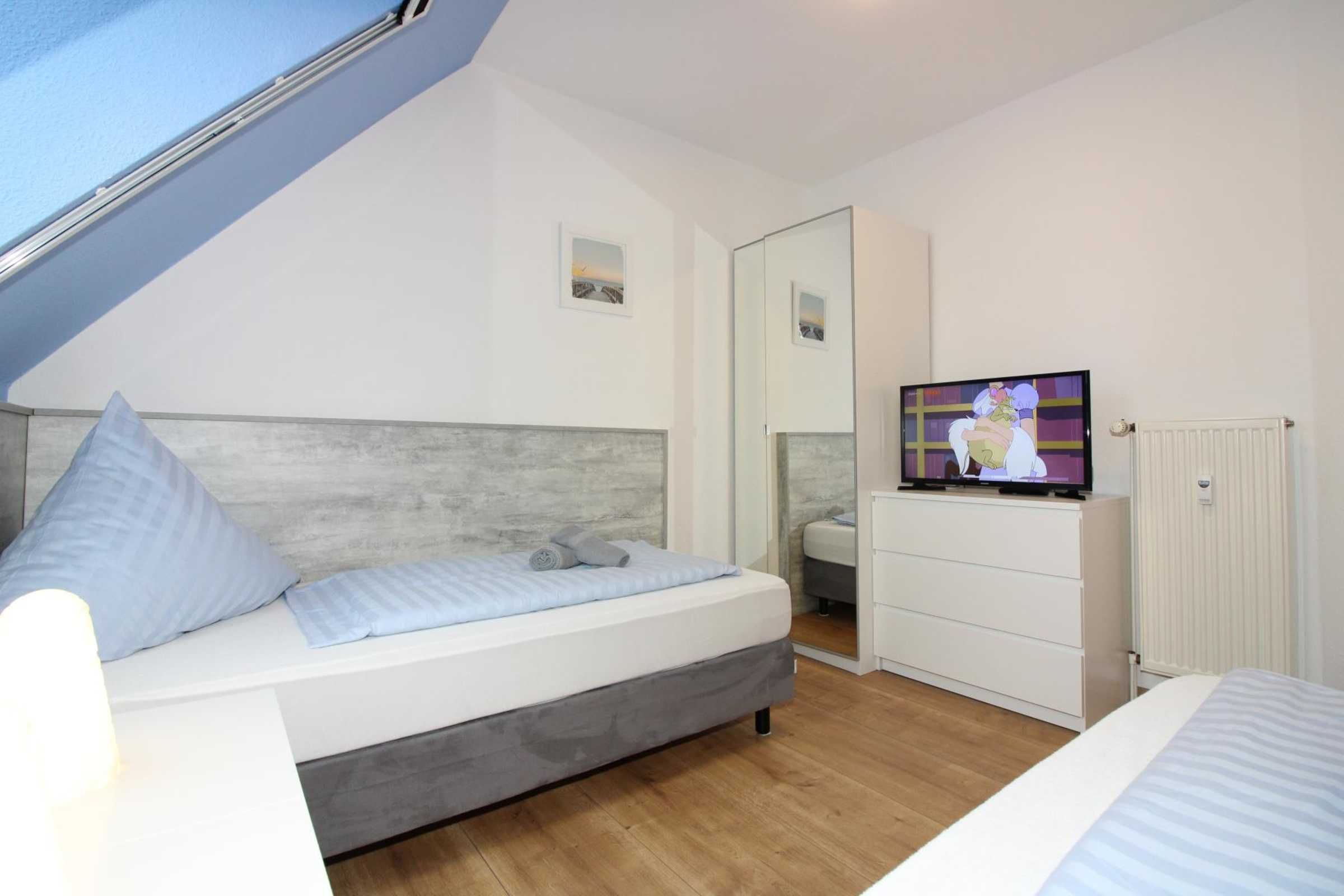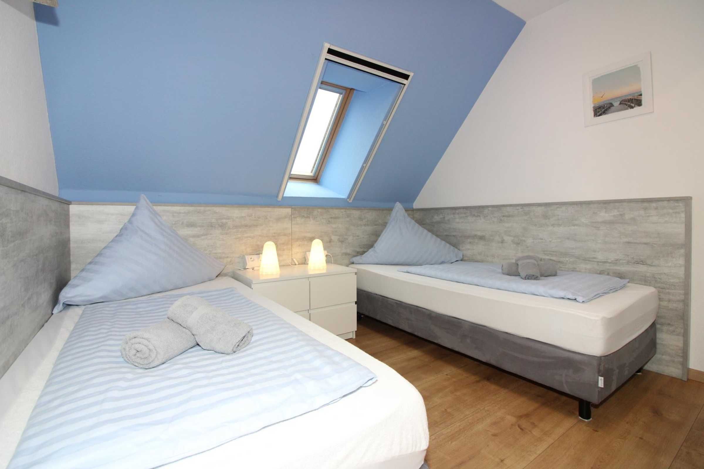 Im zweiten Schlafzimmer gibt es zwei Einzelbetten (Boxspringbett 90 cm x 200 cm), LED-Fernseher (32 Zoll), Schrank und Kommode. Das Dachfenster ist mit einem Verdunklungsrollo sowie einem separaten Insektenschutzrollo ausgerüstet.