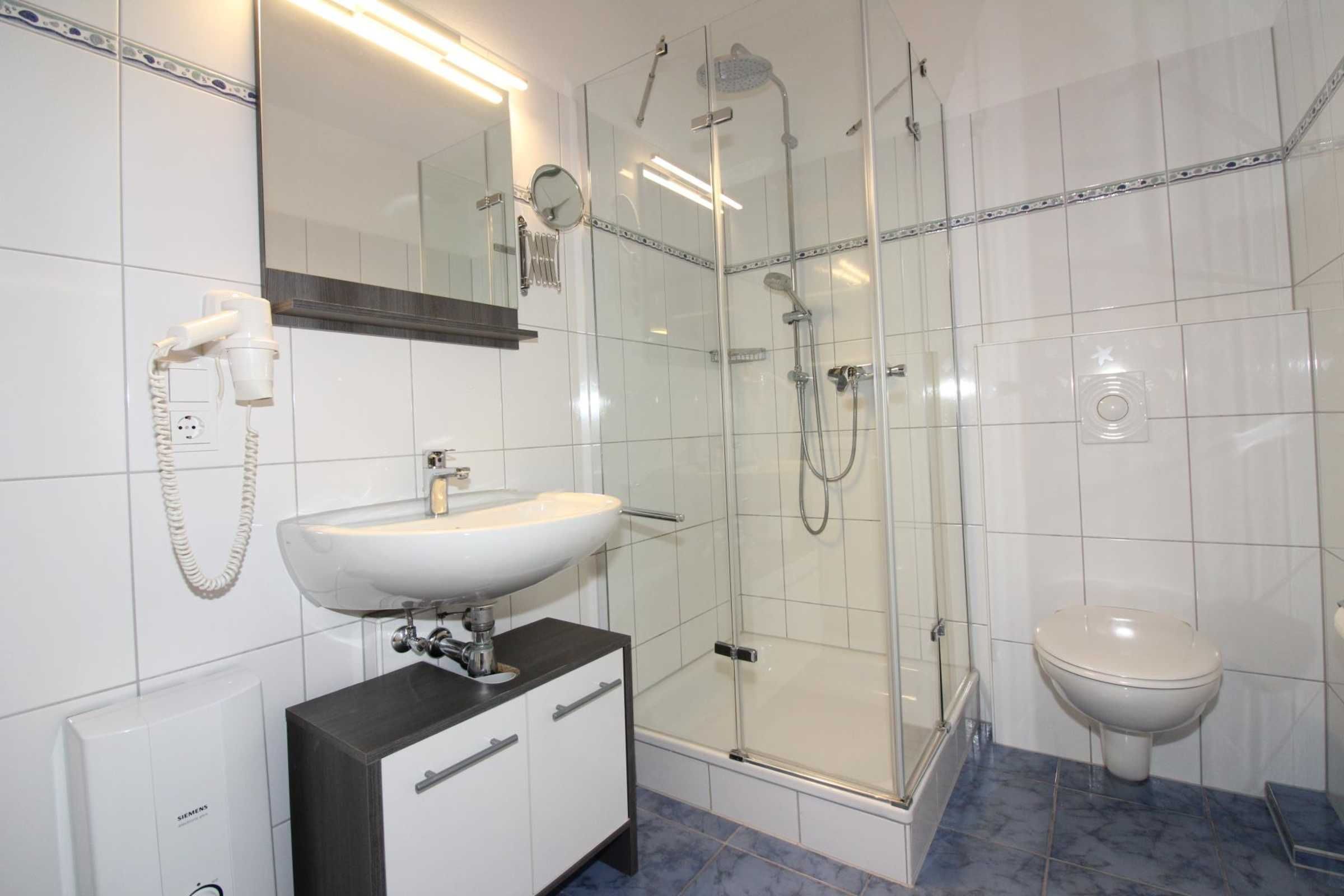 Im Bad finden Sie eine Rainshowerdusche mit Glaskabine, Föhn, Schminkspiegel und diverse Ablagemöglichkeiten in Schränkchen.