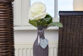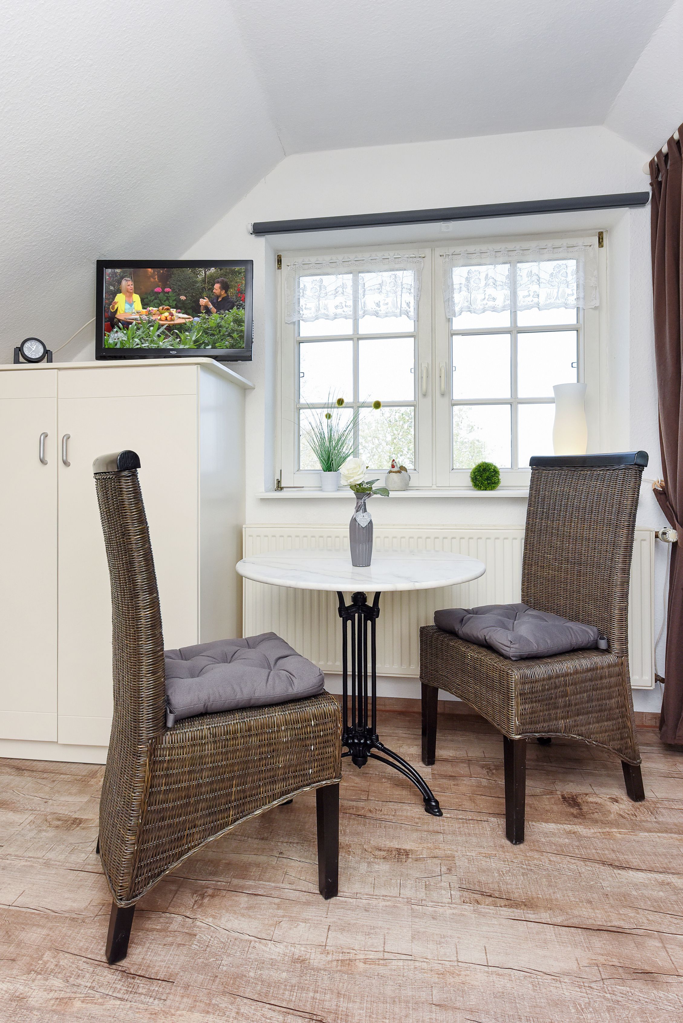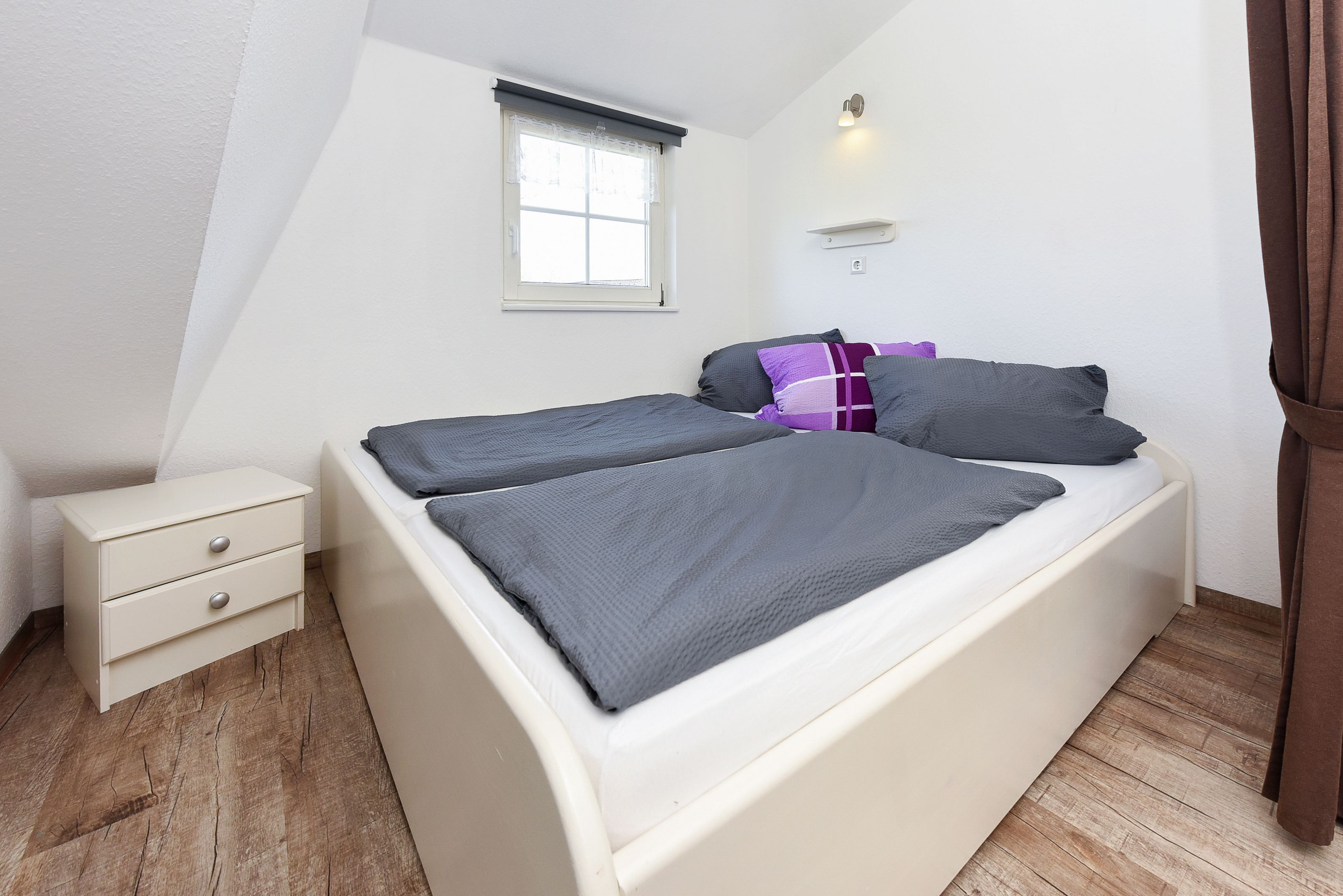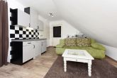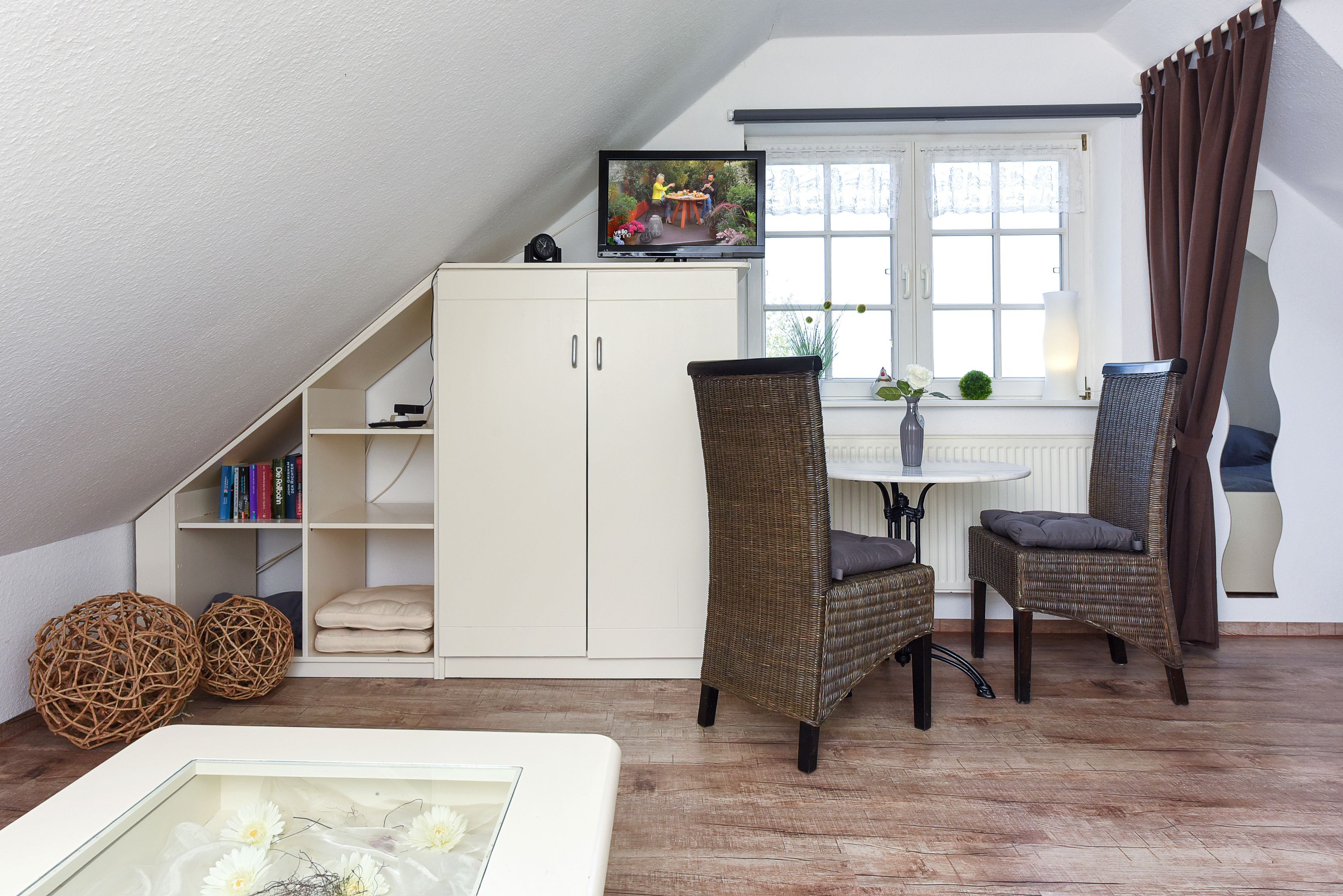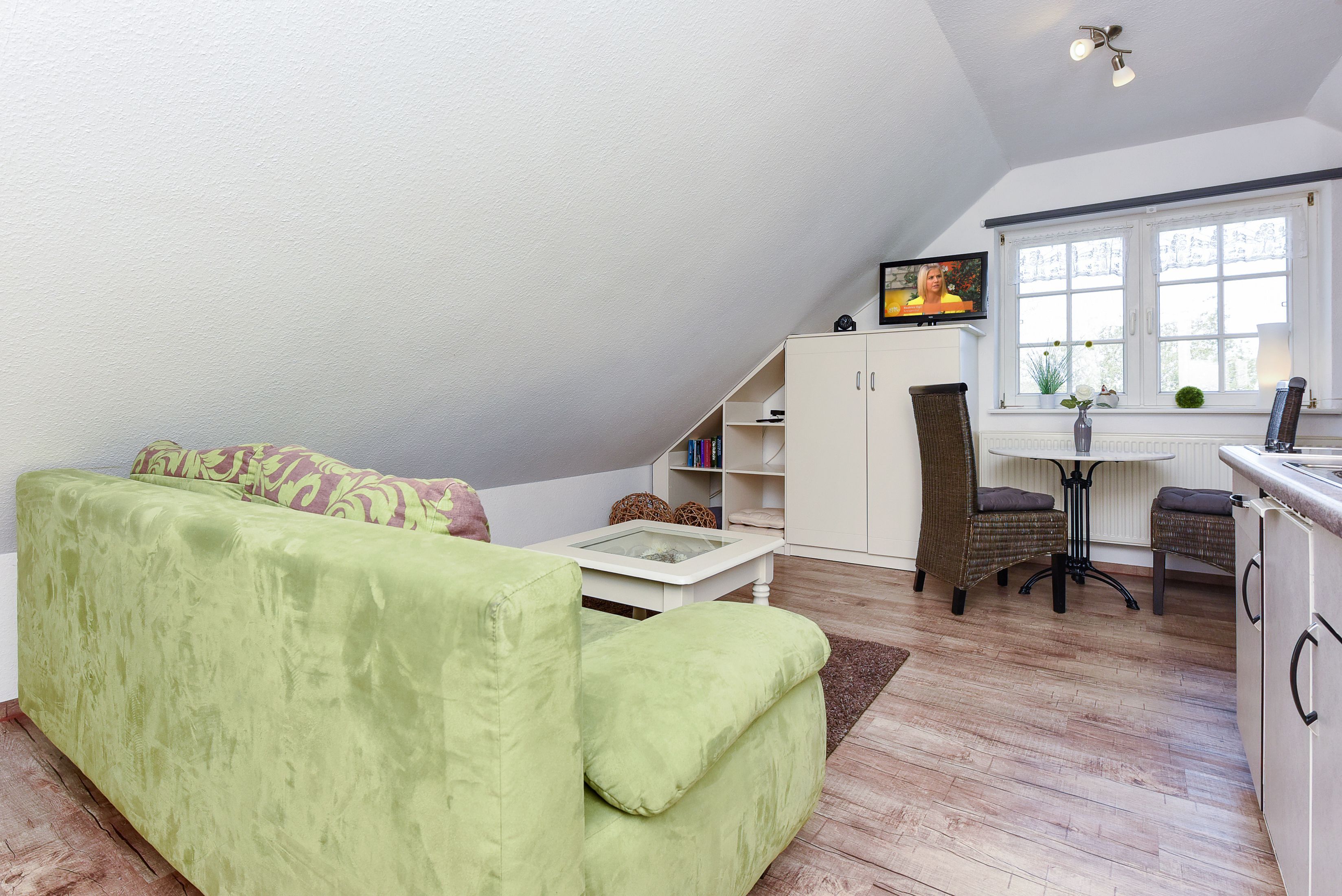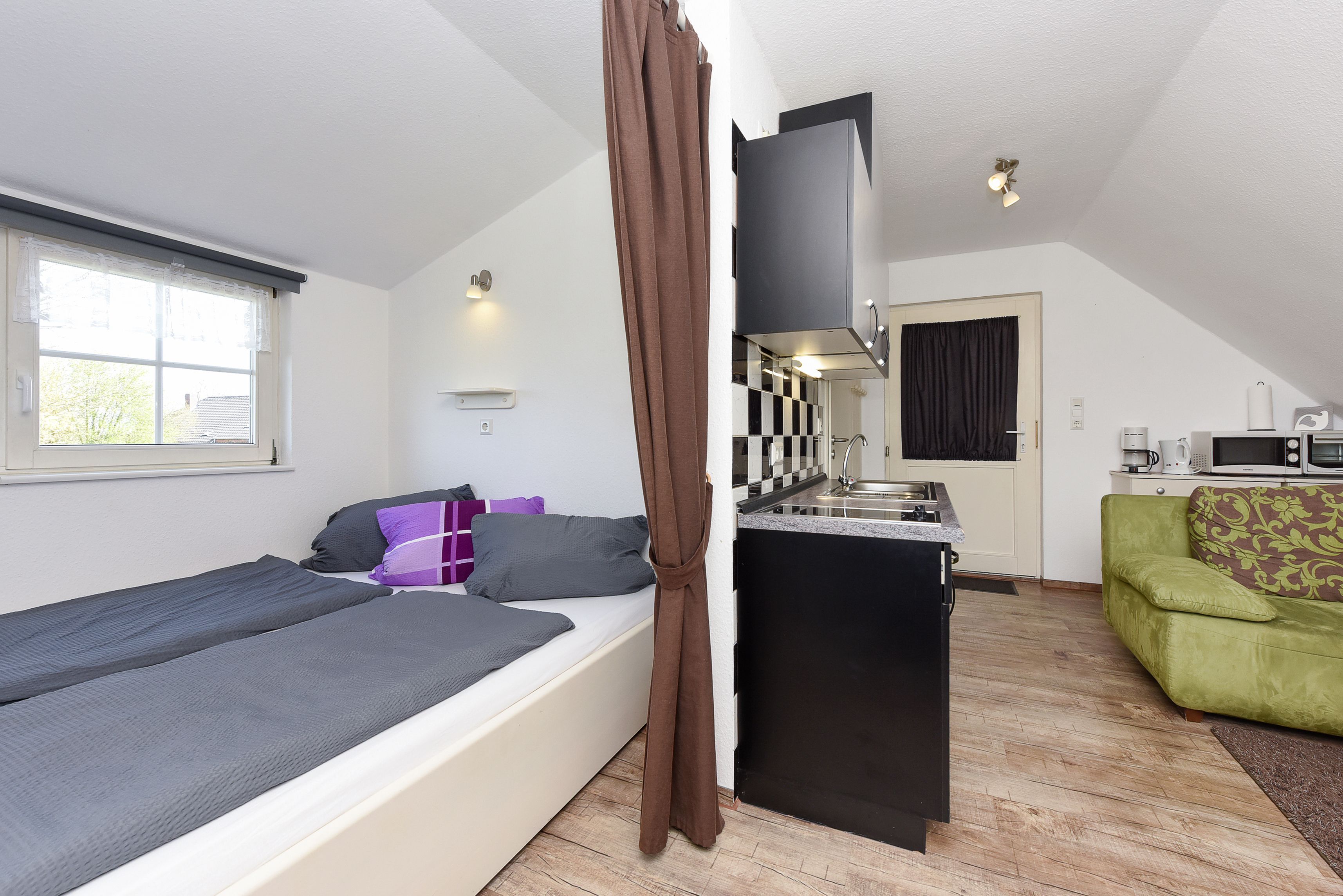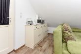 Größe ca. 30 Quadratmeter, Wohnraum mit integrierter Küche, Schlafzimmer, Badezimmer mit Dusche, Waschtisch und WC, Obergeschoss, Gartennutzung, optimal für 1 bis 2 Personen.