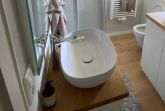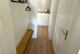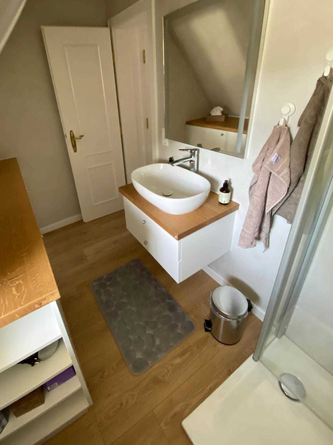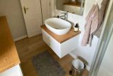 Sanitär: bodenebene Dusche, Föhn, Handtuchheizkörper, Schminkspiegel.