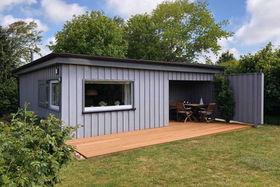 400 qm Garten in geschützter Lage mit Sonnenterrasse. 2, 5 Zimmer mit Wohnküche und Duschbad auf 65 qm Grundfläche. 4 Schlafplätze (Doppel- und Etagenbett) ideal für die 3 bis 4-köpfige Familie.