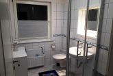 Sanitär: bodenebene Dusche, Föhn, Schminkspiegel.