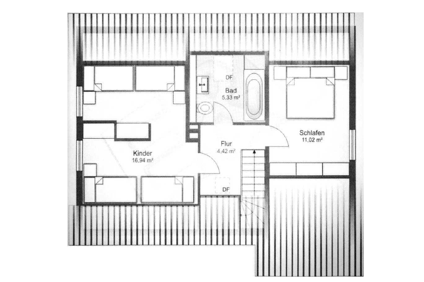 Raumaufteilung: 1 Schlafraum (3 Einzelbetten), 1 Schlafraum (1 Doppelbett), 1 Schlafraum (1 Doppelbett), 1 Wohnraum, 2 Flure, 1 separate Küche, 1 Badezimmer mit Dusche, 1 Badezimmer mit Badewanne.
