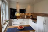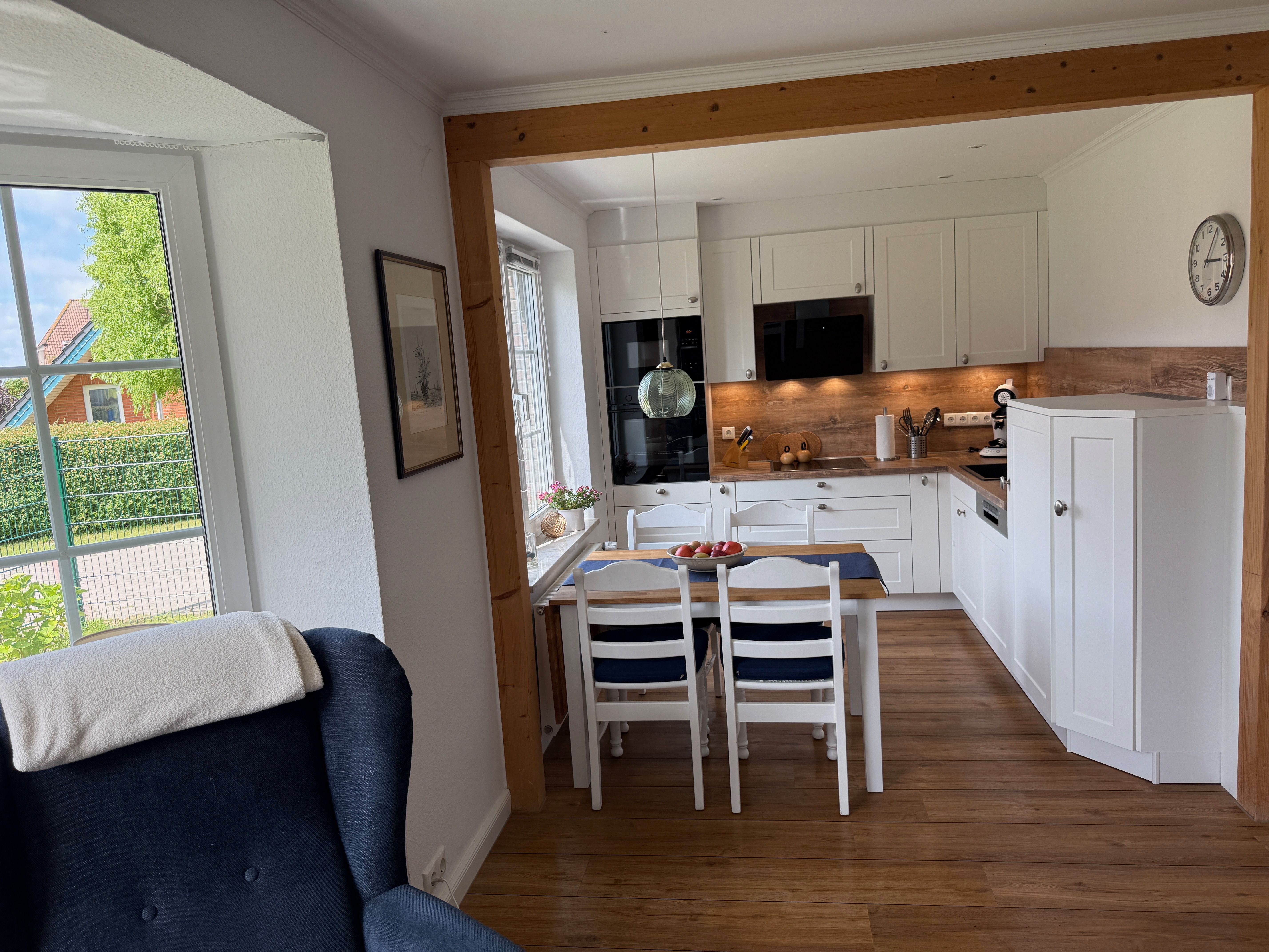 Wohn-Esszimmer: Geschirrspüler, Kühlschrank mit 3-Sterne-Gefrierfach, Umluft-Backofen, 4-Platten-Cerankochfeld, Mikrowelle