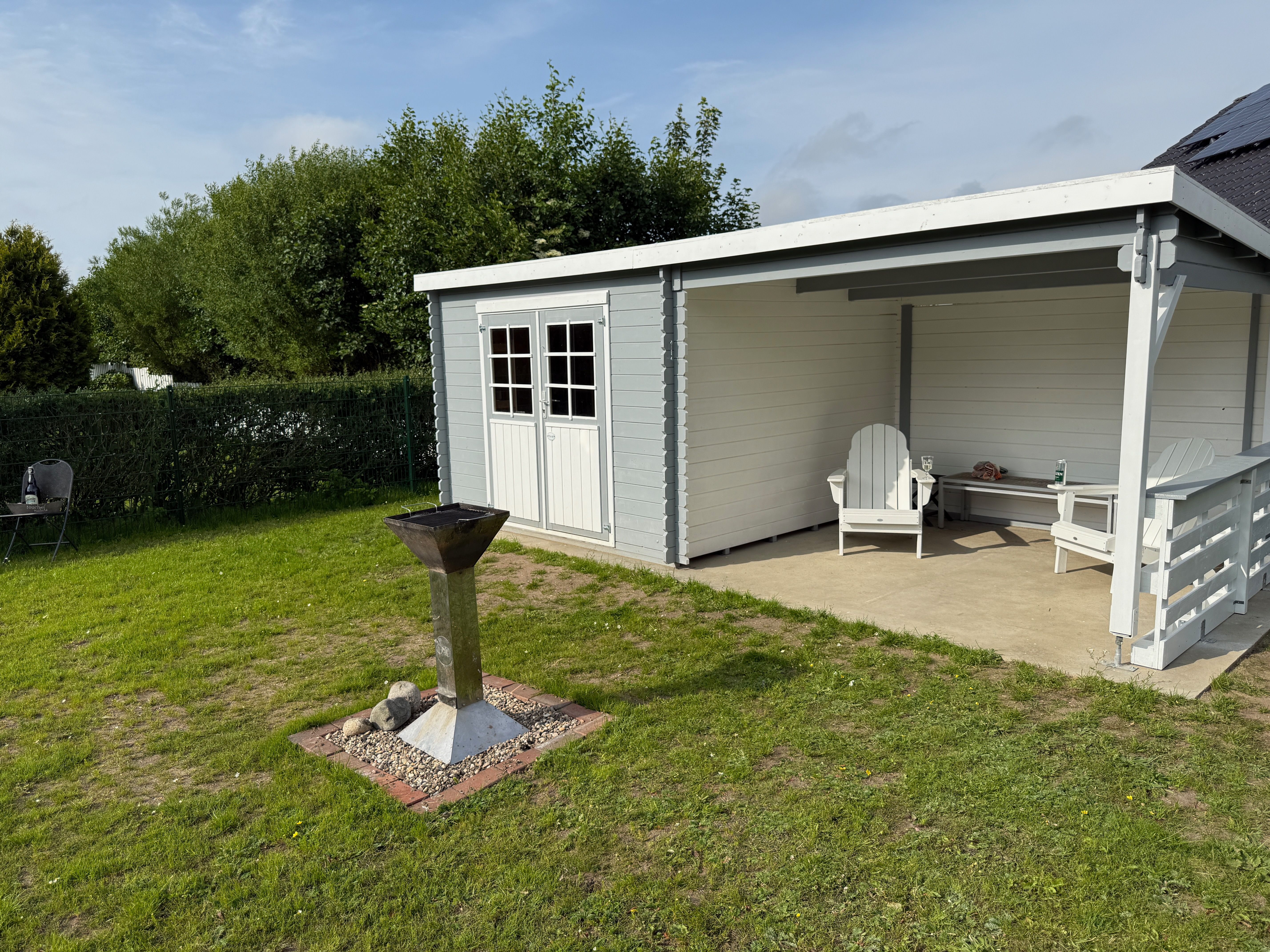 schöne überdachte Terrasse, Grill, Gartenmöbel,
