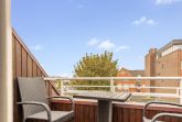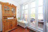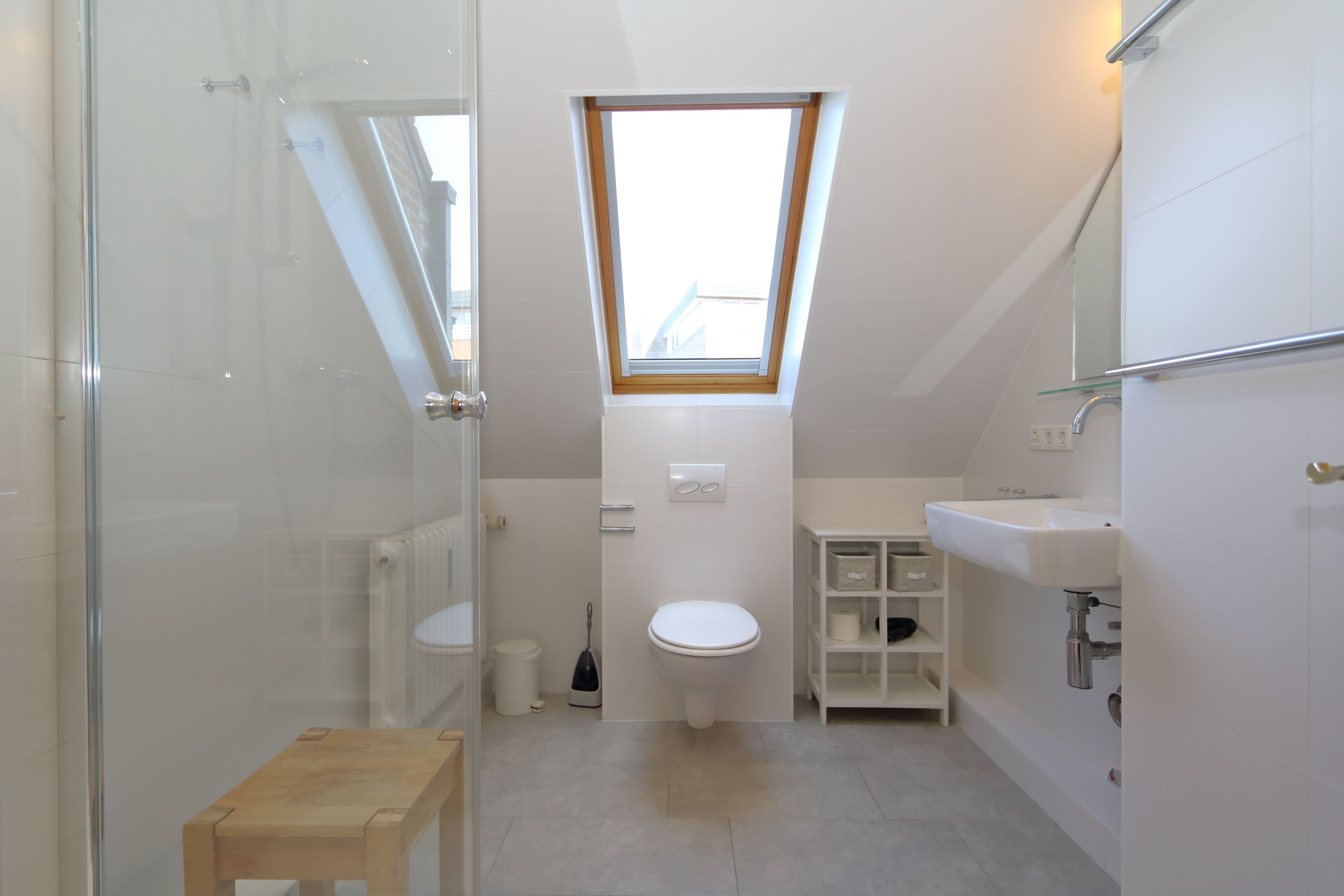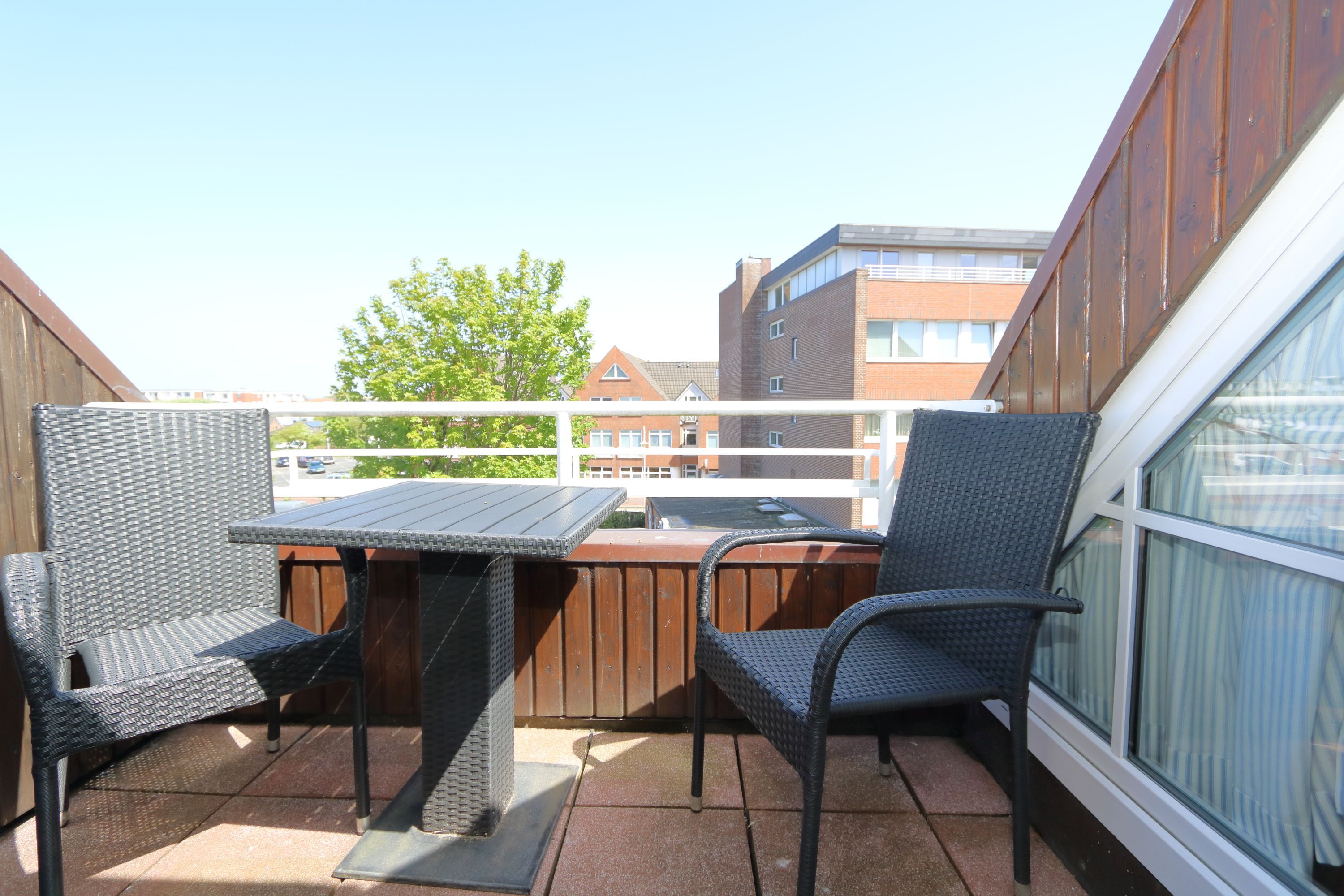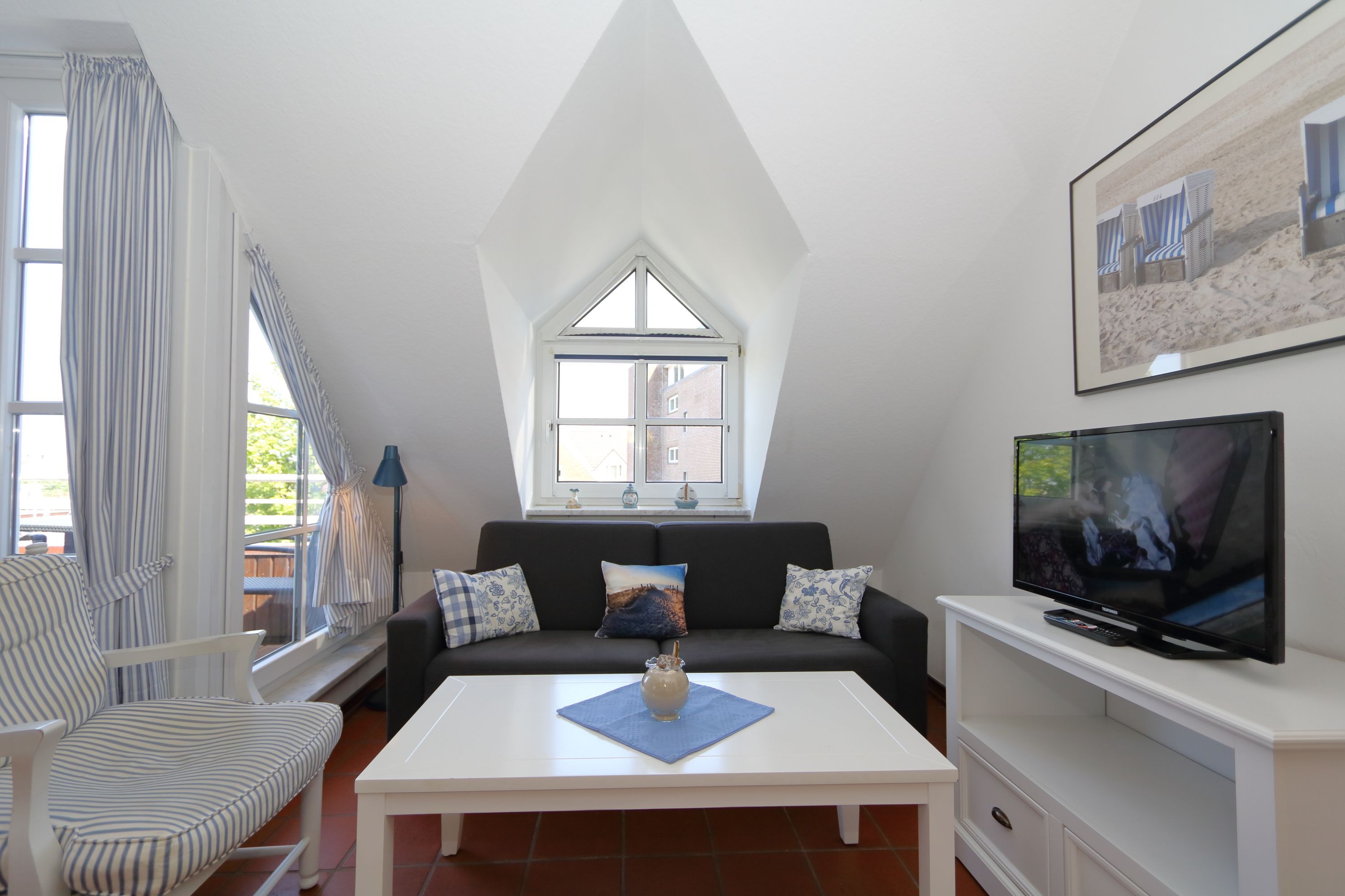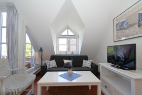 Die niedliche und gut aufgeteilte Ferienwohnung verfügt über einen großzügigen Wohn-und Essbereich, eine Küche und über ein schönes Badezimmer mit einer modernen Dusche (Föhn vorhanden) und einem Velux-Fenster. Es befindet sich unter der Treppe, die nach oben ins Schlafzimmer führt, eine Abstellkammer. Ein Balkon nach Osten ist ebenfalls vorhanden.