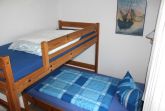Ein Schlafzimmer mit Doppelbett. Ein Schlaf- oder Kinderzimmer mit Etagenbetten.