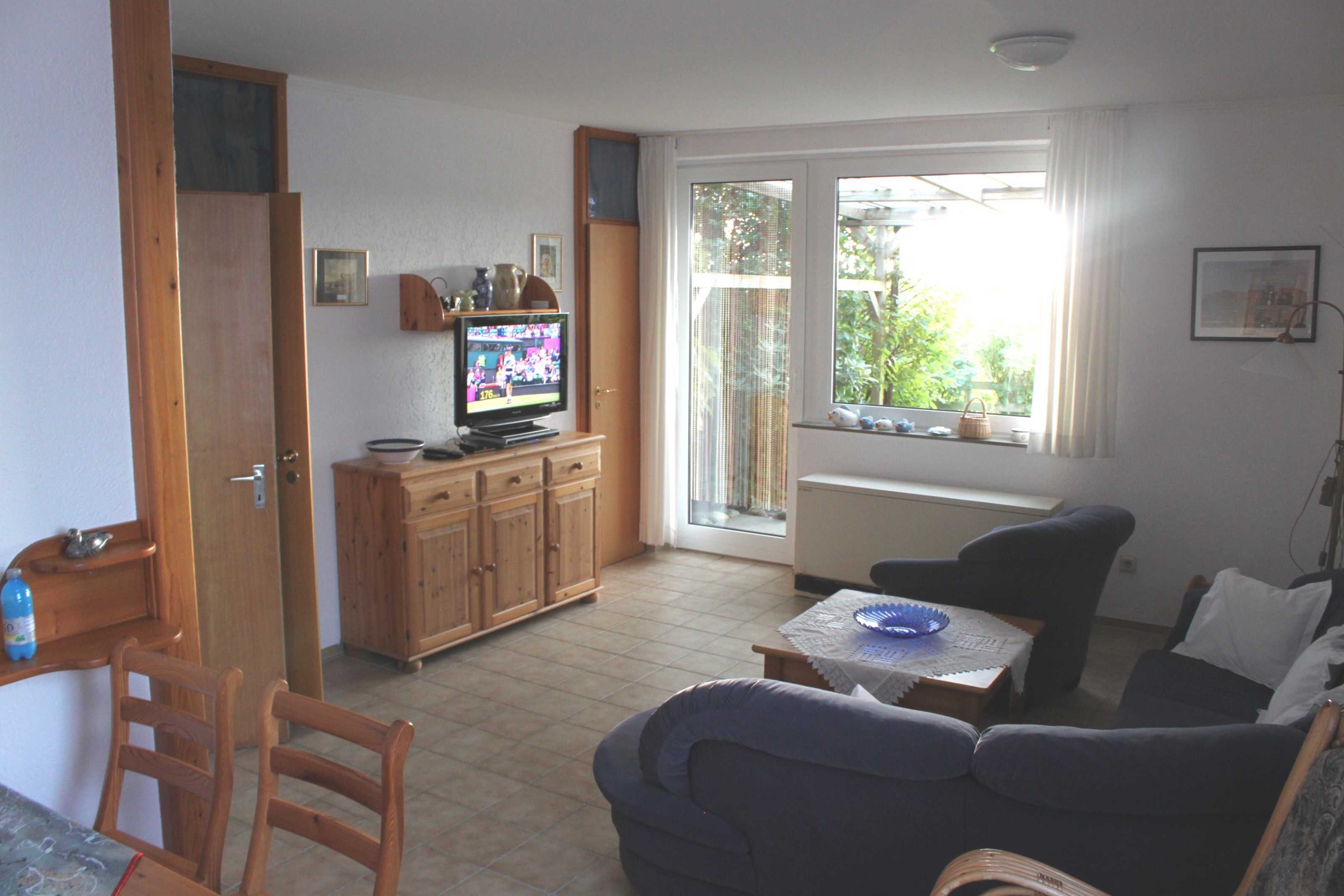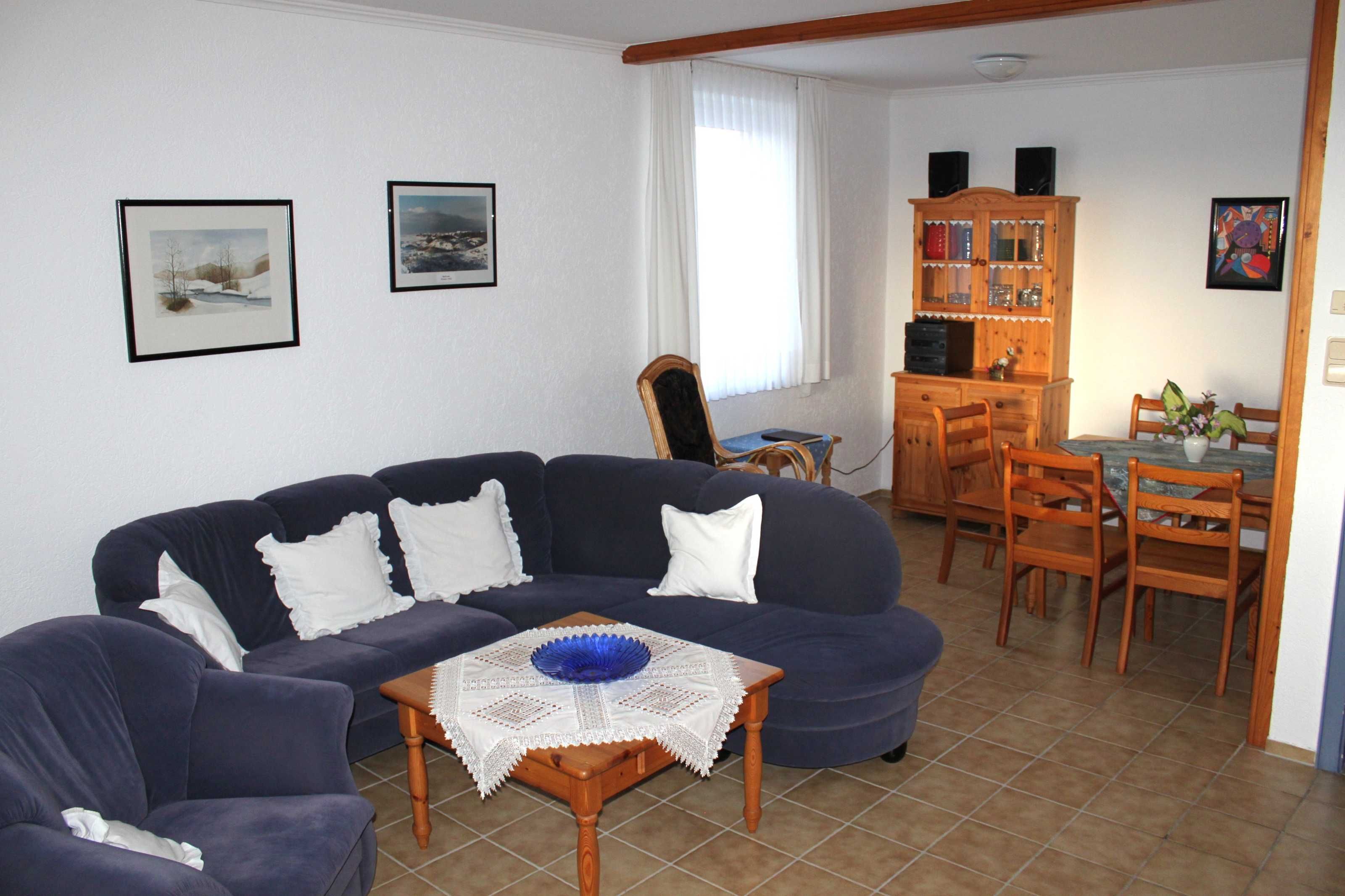 Offenes Wohn- und Esszimmer mit gemütlicher Couchgarnitur und Flachbild-TV, Essplatz mit Bestuhlung. Von hier hat man einen direkten Zugang zur überdachten Terrasse und dem eingewachsenen Garten mit unverbaubarer Fernsicht.