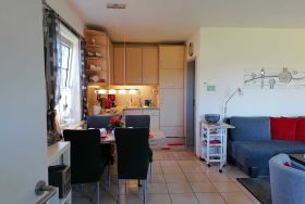 • Ein kombiniertes Wohn-Esszimmer mit offener, komplett ausgestatteter Küche und vollwertiger Schlafcouch für zwei Personen,