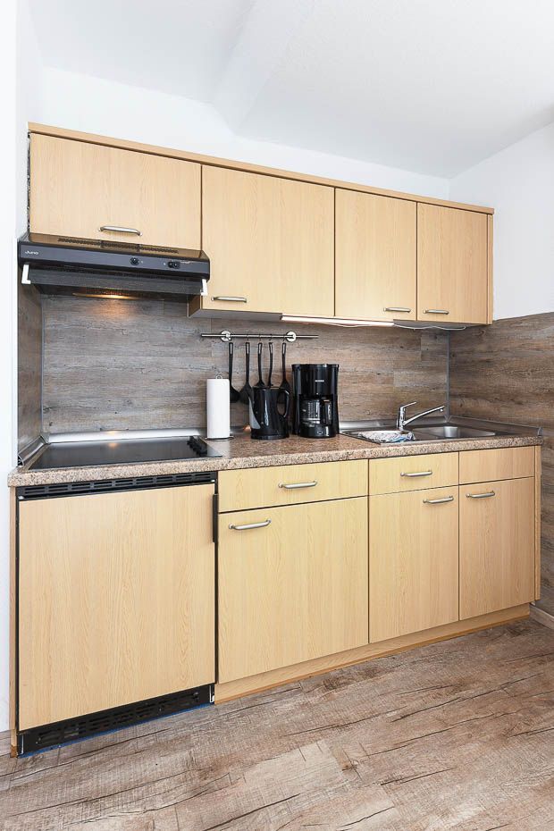 Größe ca. 35 Quadratmeter, Wohnraum mit integrierter Küche, Schlafzimmer, Badezimmer mit Dusche, Waschtisch und WC, Obergeschoss, optimal für 1 bis 3 Personen.