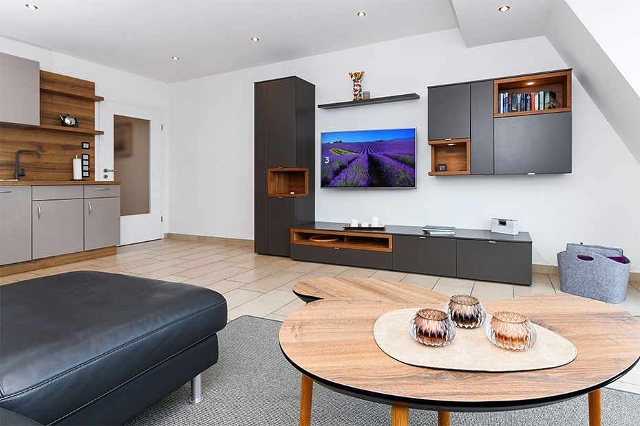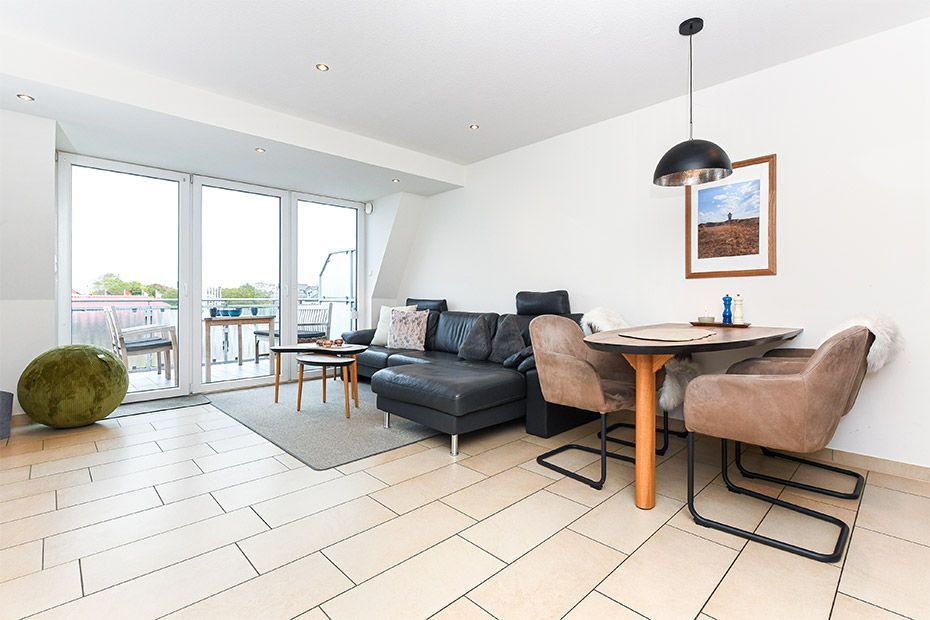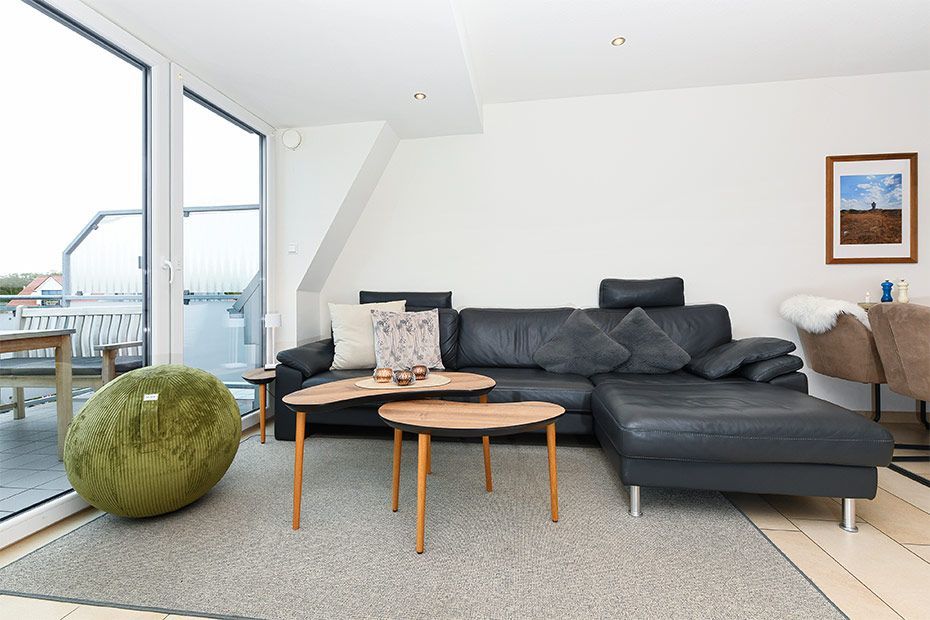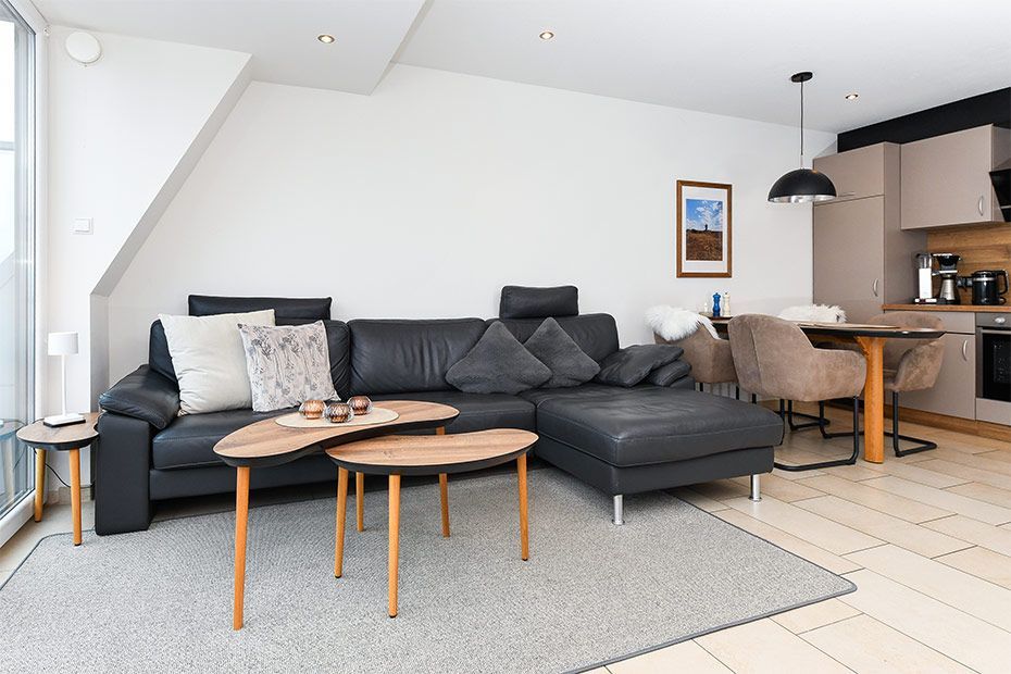 Die großzügige und ungefähr 63 Quadratmeter große „Meerblick-Ferienwohnung Black Pearl“ in der „Residenz am Hafen“ für eine bis vier Personen ist auf Top-Niveau eingerichtet und gemütlich-modern, sehr komfortabel und freundlich gestaltet sowie technisch hervorragend ausgerüstet.