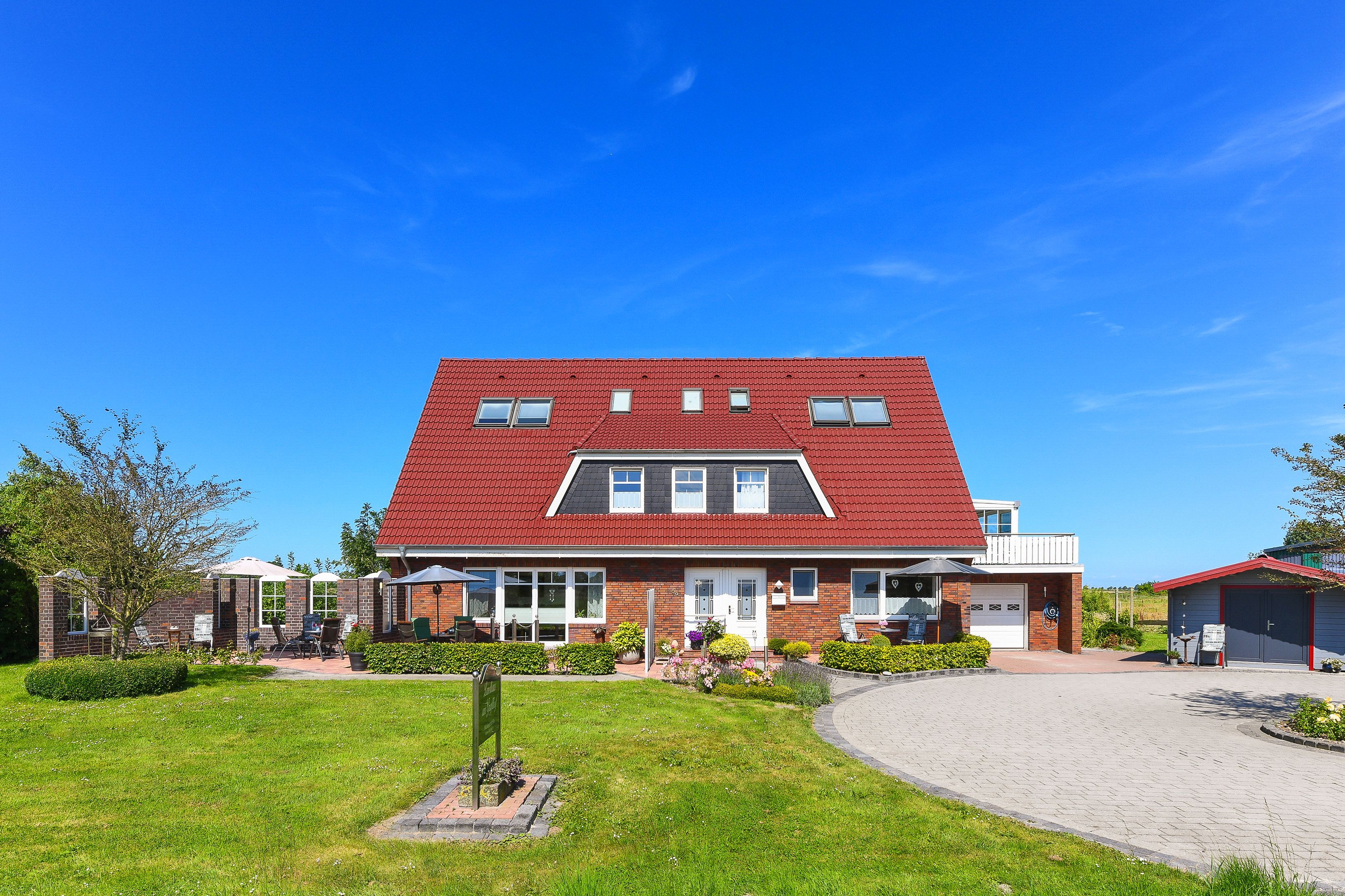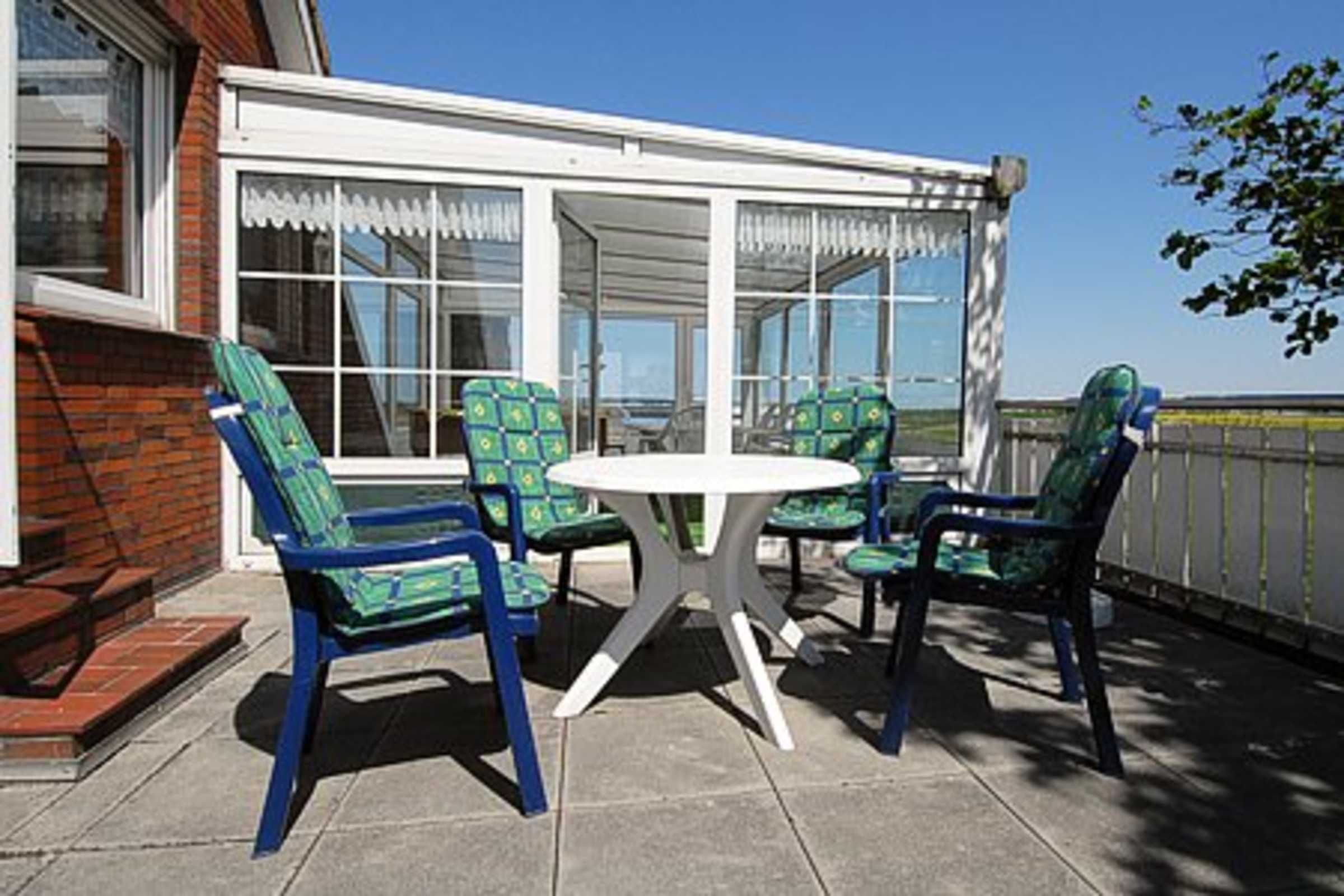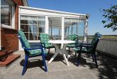 Der Balkon mit Gartenmöbeln ist direkt aus der Wohnung „Landblick“ zugänglich und wird von den Bewohnern dieser Wohnung genutzt; der ebenfalls gartenmöblierte Wintergarten kann über eine Außentreppe auch von den Bewohnern der anderen Wohnungen mitbenutzt werden.