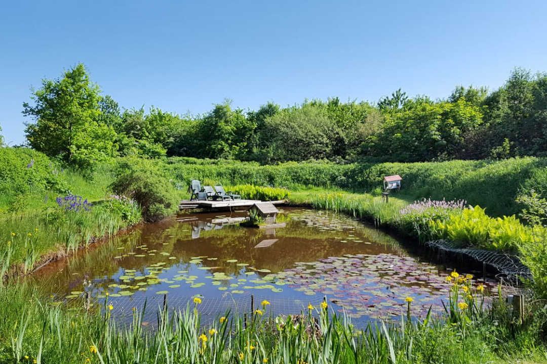 Im hinteren Teil des Gartens befindet sich ein idyllischer großer Gartenteich mit tollem eigenen möblierten Steg komplett eingezäunt mit gesichertem Zugang mit einem Spazierweg drum herum. Hinter dem Teich gibt es noch einen kleinen Wald mit einem kleinen Spazier-Weg, Sitz- und Ruhemöglichkeiten und gemütlichen Ecken.