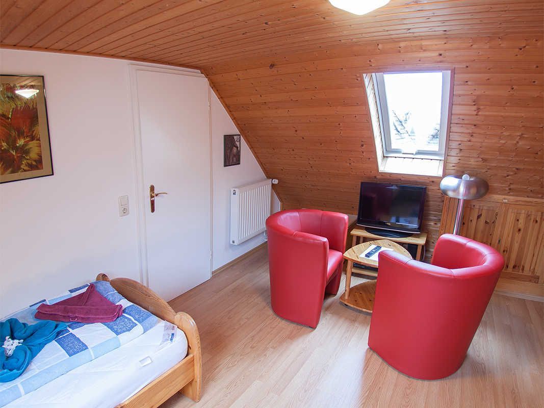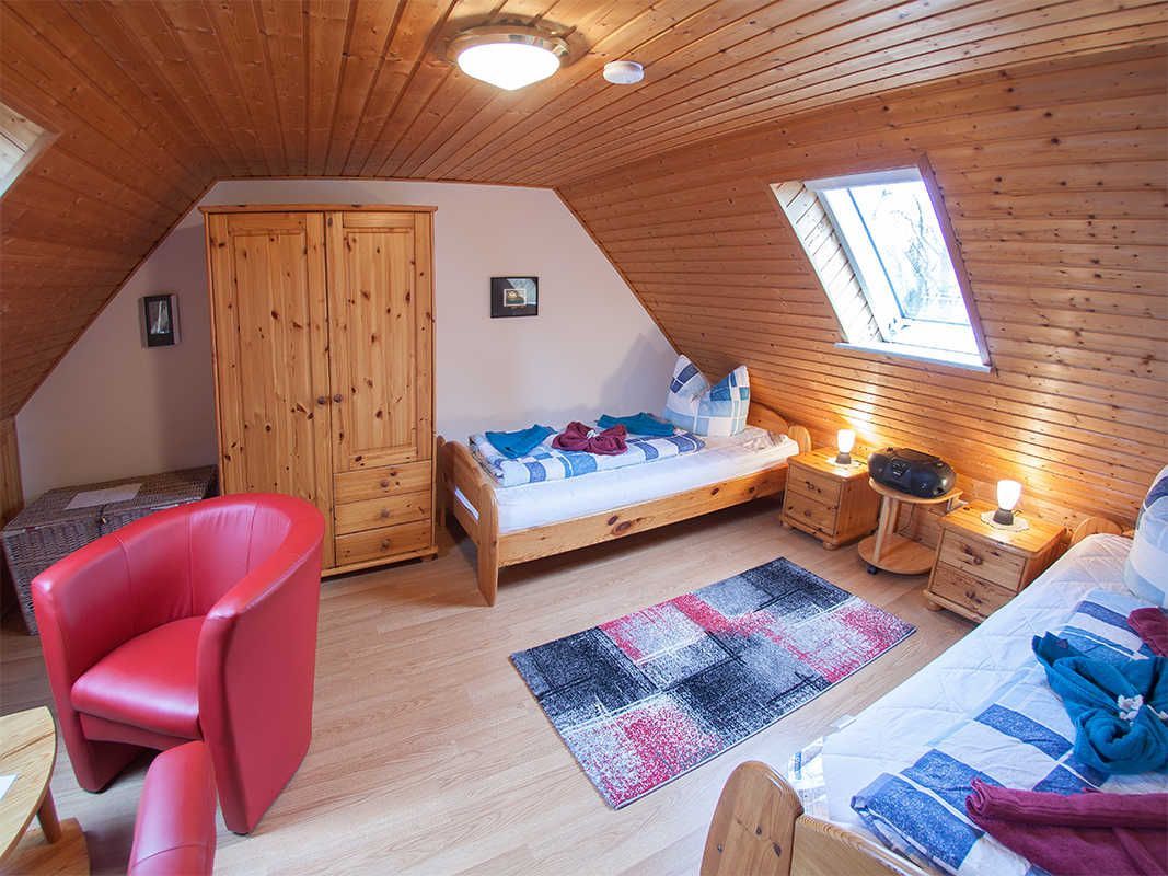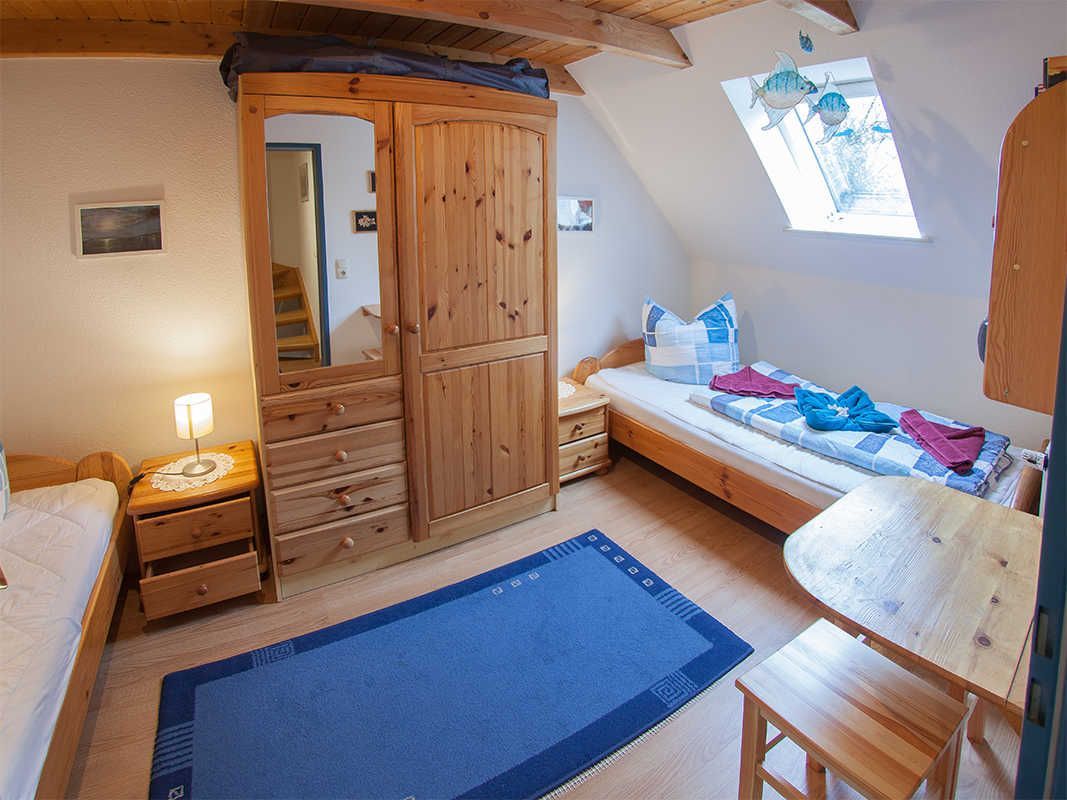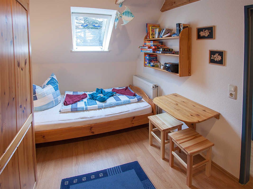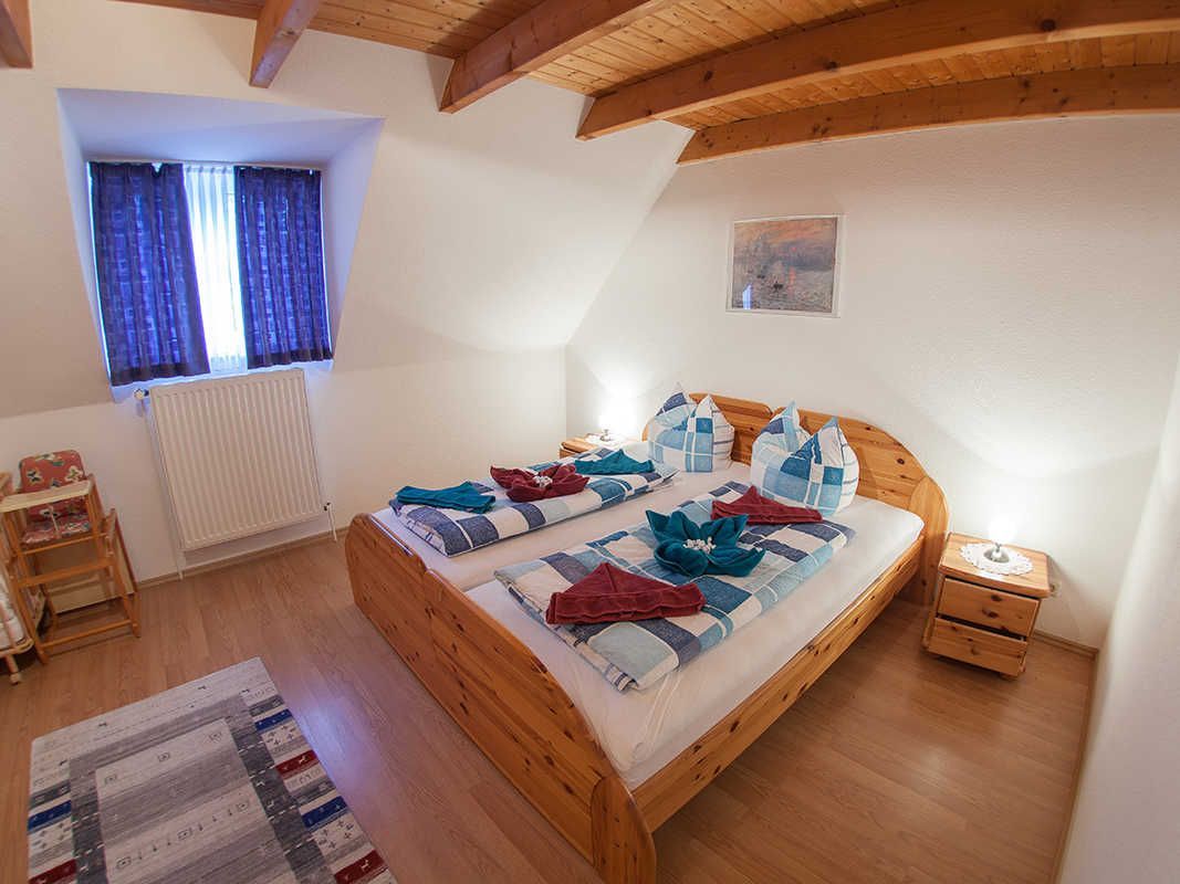 Insgesamt drei Schlafzimmer - eines im Dachgeschoss - bieten Platz für sechs Personen, zusätzlich ist für die kleinsten Gäste ein Kinderbett vorhanden.