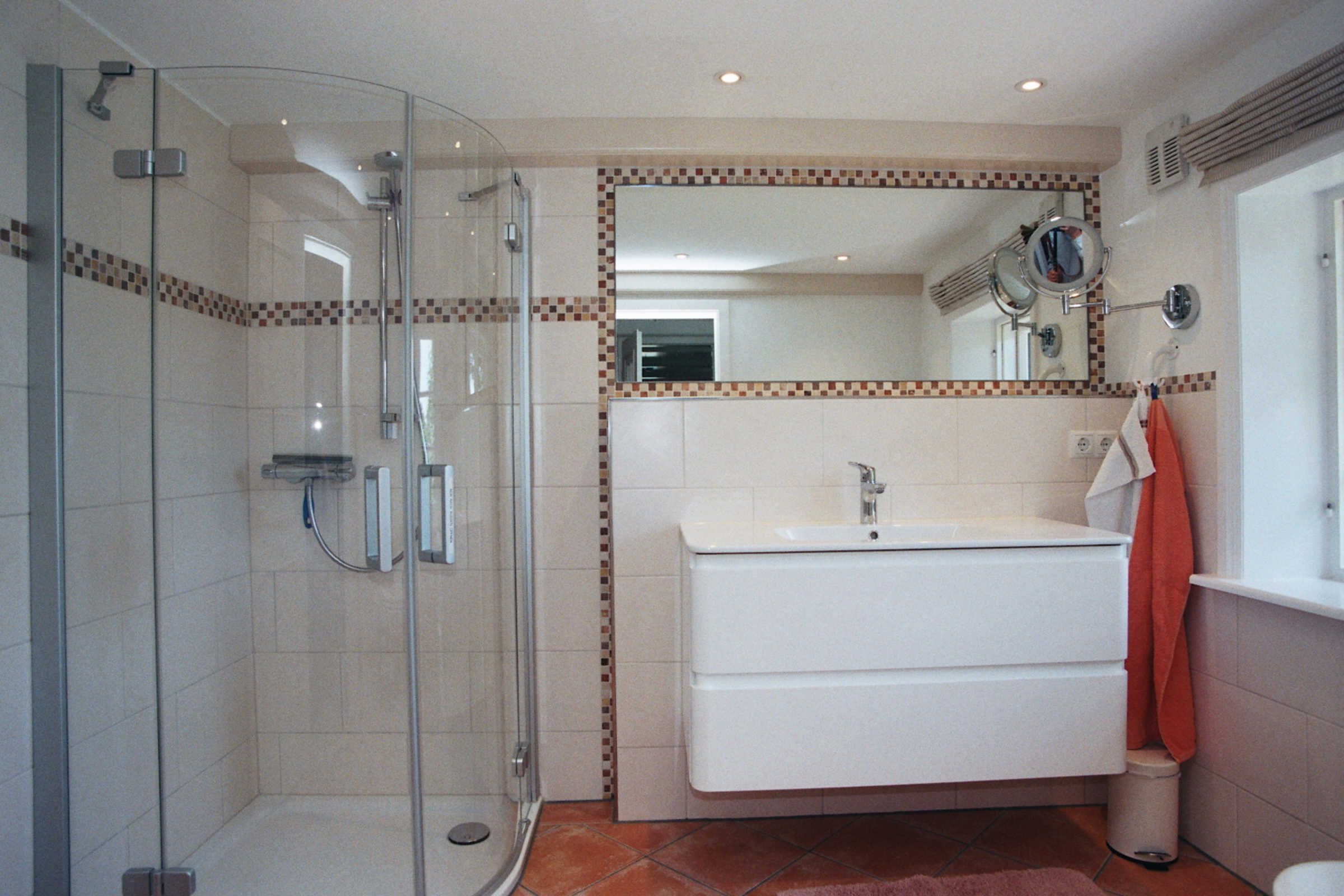 Sanitär: Föhn, Handtuchheizkörper, Schminkspiegel.