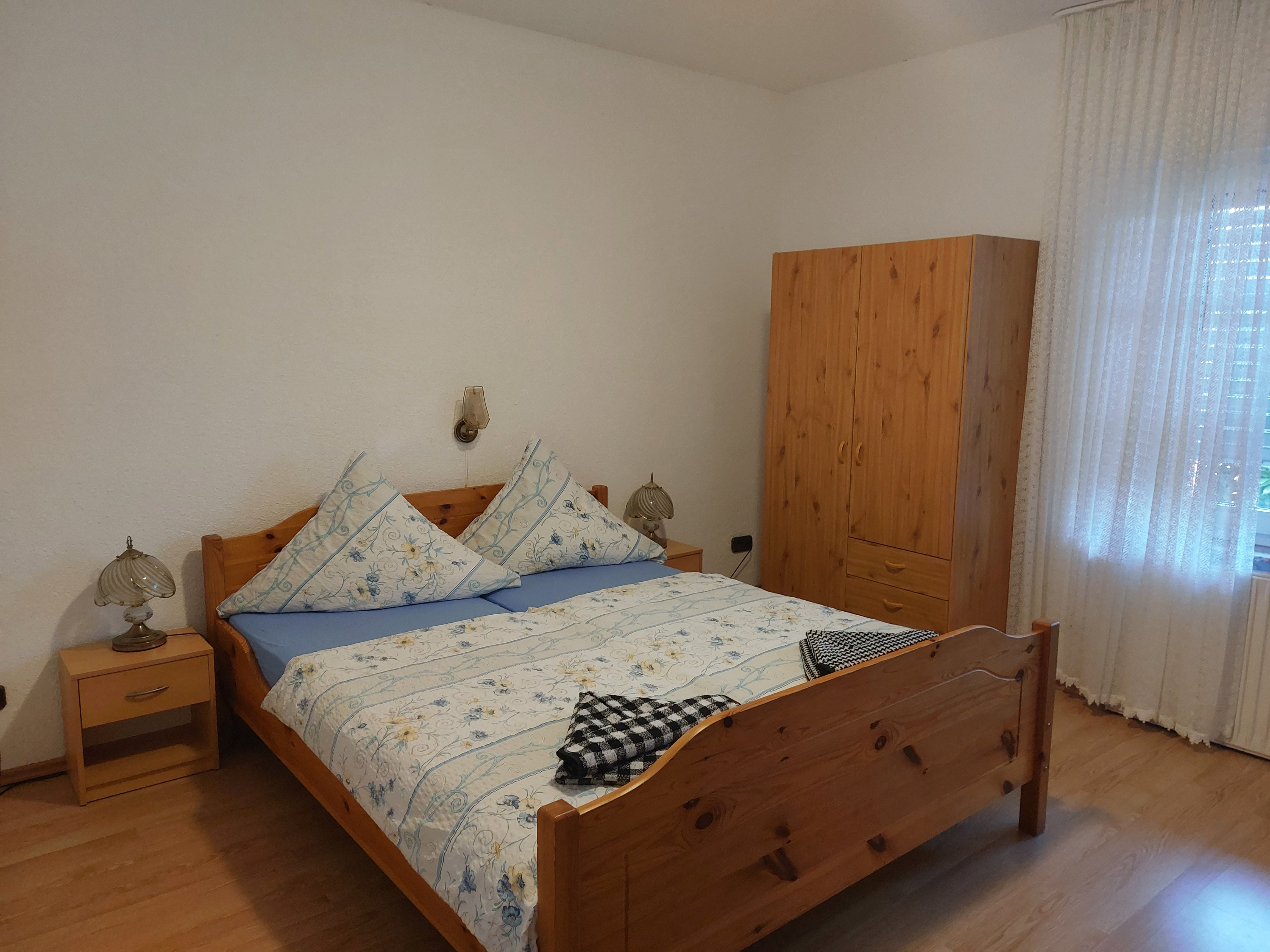 Schlafzimmer mit 2x2 Meter Doppelbett, Nachttischen, Kleiderschrank, zusätzlich eine Schlafcouch und weiteres Sat-TV. Ein schönes Duschbad mit Wohlfühl-Dusche sowie extra WC