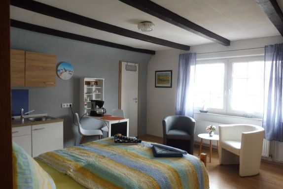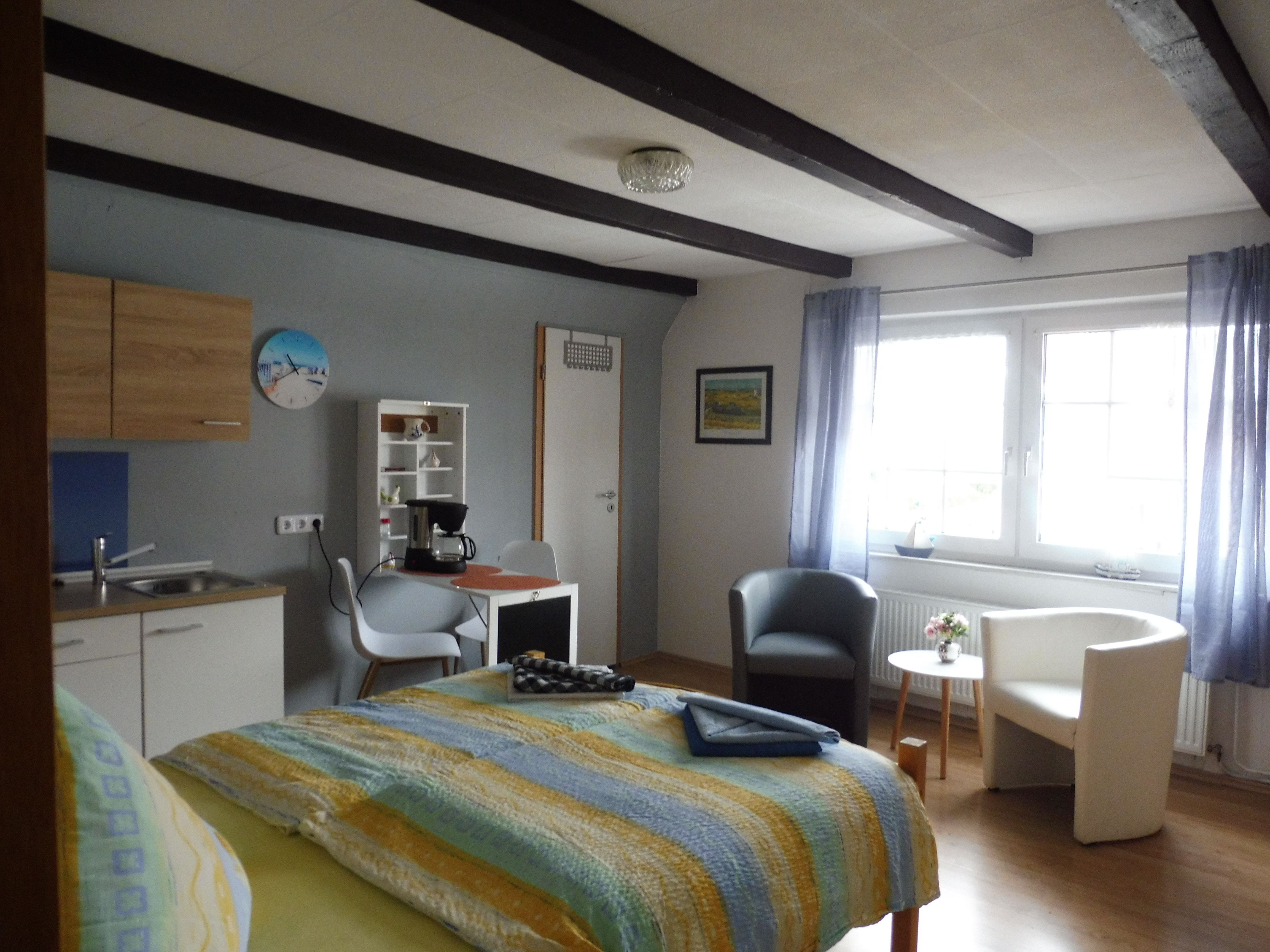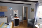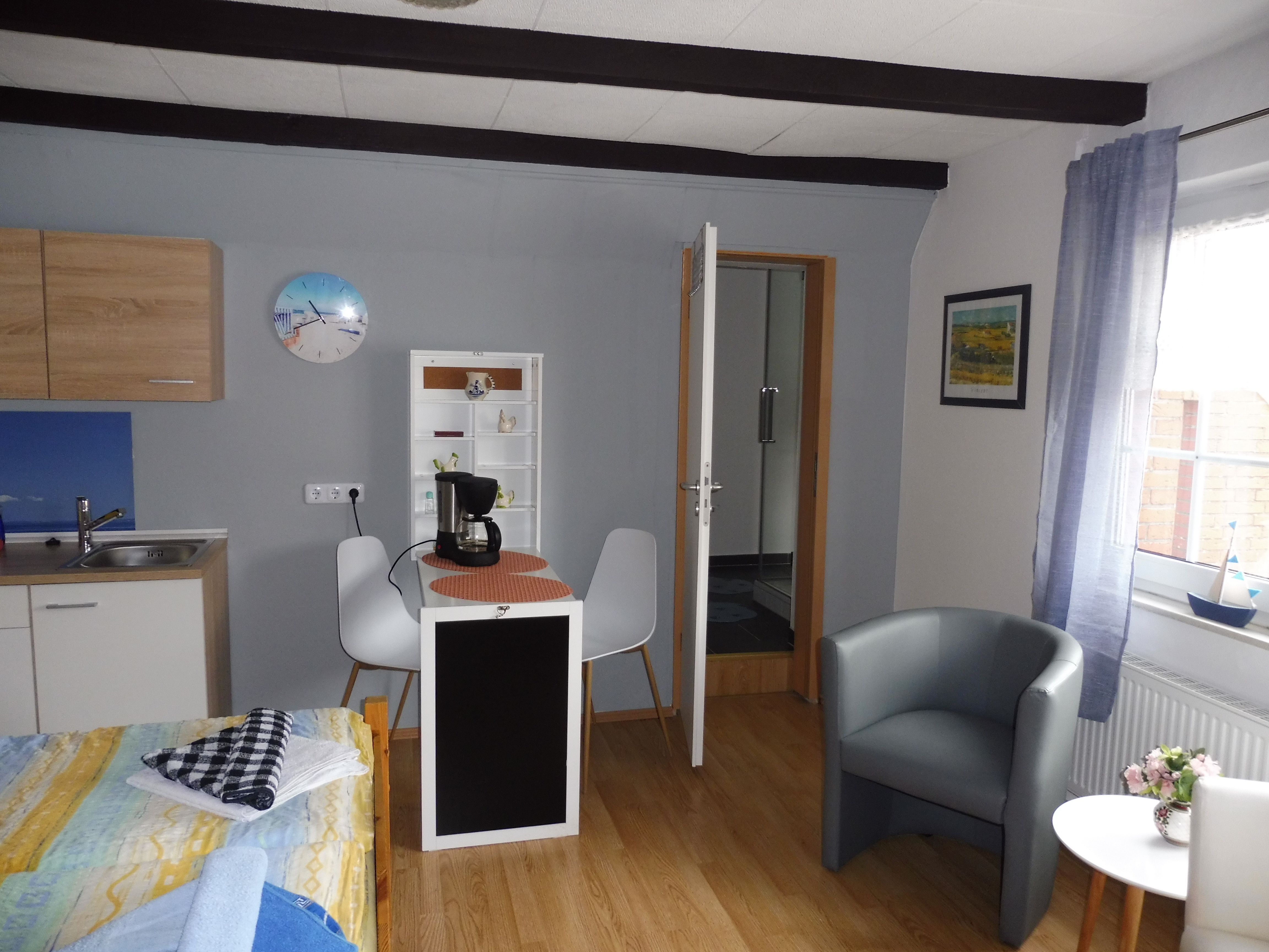 Unser Apartment Ebbe im 1. OG unseres Hauses in der Ortsmitte von Dornumersiel gelegen, bietet auf ca. 33m² Platz für 1 bis 2 Personen. Sie finden hier ein kleines aber sehr schickes Ferienapartment mit komb. Wohn-/Schlafraum mit Futonbett 140x200cm und mit integrierter Kochzeile inkl. 2-Platten-Kochfeld, Kühlschrank, Kaffeemaschine, Wasserkocher, Toaster. und allen üblichen Küchenutensilien.