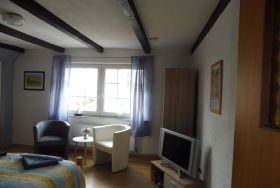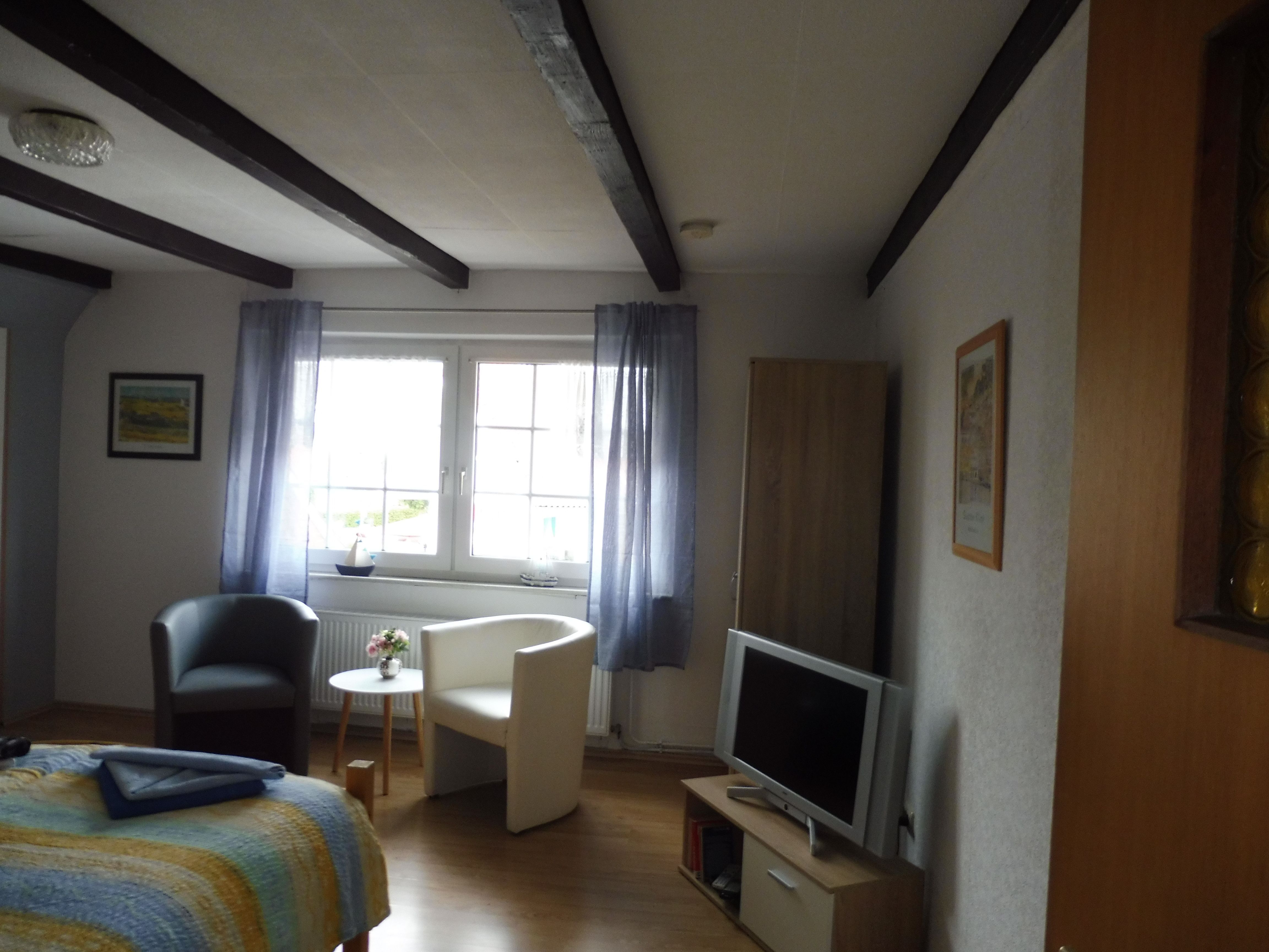 Kleiner separater Eßplatz. 2 Cocktailsessel, Couchtisch, Flatscreen-Sat-TV.