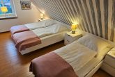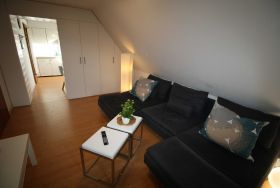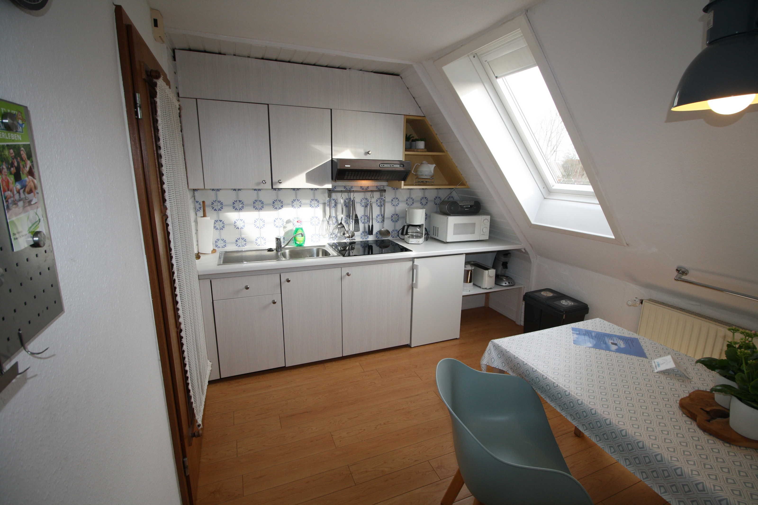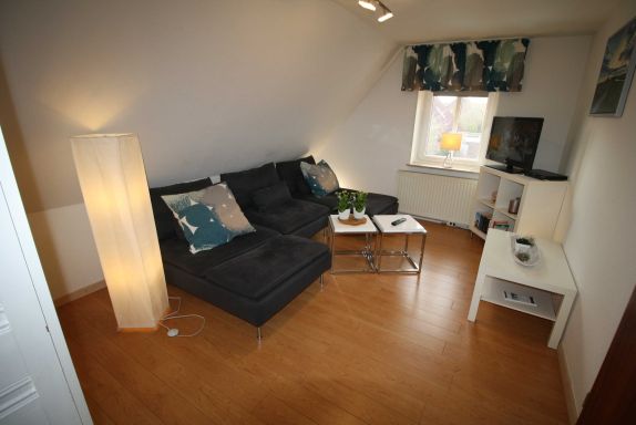 Dieses Appartement kann mit bis zu 3 Personen genutzt werden, es liegt im Obergeschoss. Es hat eine Größe von ca. 38 qm. Es gibt ein Wohnzimmer mit einer schönen großen Couch, Fernsehen und Radio, ein Schlafzimmer mit einem 1,80 m Bett und einem Einzelbett und eine Küche mit Ceranfeld, Mikrowelle, Filtermaschine und Senseo-Kaffeemaschine. Das Tageslichtbad hat Dusche und WC.