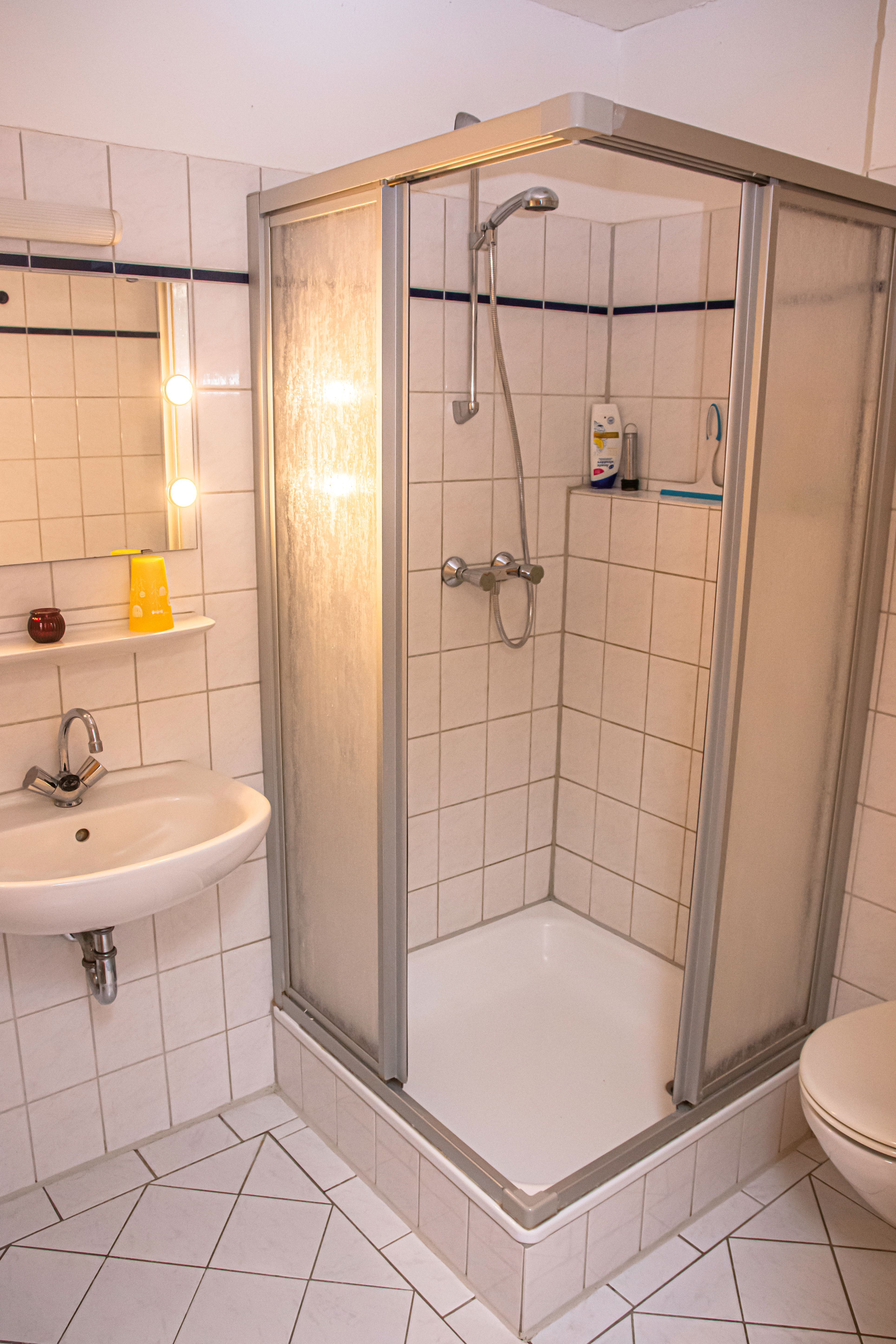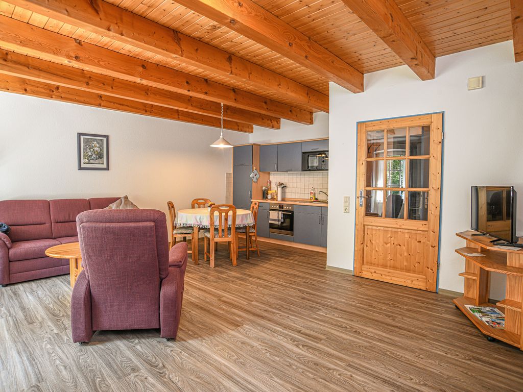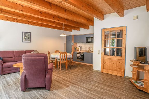 Die Ferienwohnung besteht aus einem Wohnzimmer mit Küche und Esstisch. Im Obergeschoss befinden sich das Schlafzimmer mit drei Betten (Doppelbett und Einzelbett) und dem Bad (Gesamtgröße ca. 53 qm). Die Fußböden wurden mit hochwertigen Vinylboden ausgelegt. Im Wohnzimmer befindet sich ein Schlafsofa für eine Person. Ein Kind bis 2 Jahre kann zusäzlich in einem Kinderbett schlafen. Die Wohnung ist für maximal drei Erwachsene und ein Kind bis 2 Jahren geeignet.