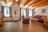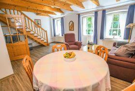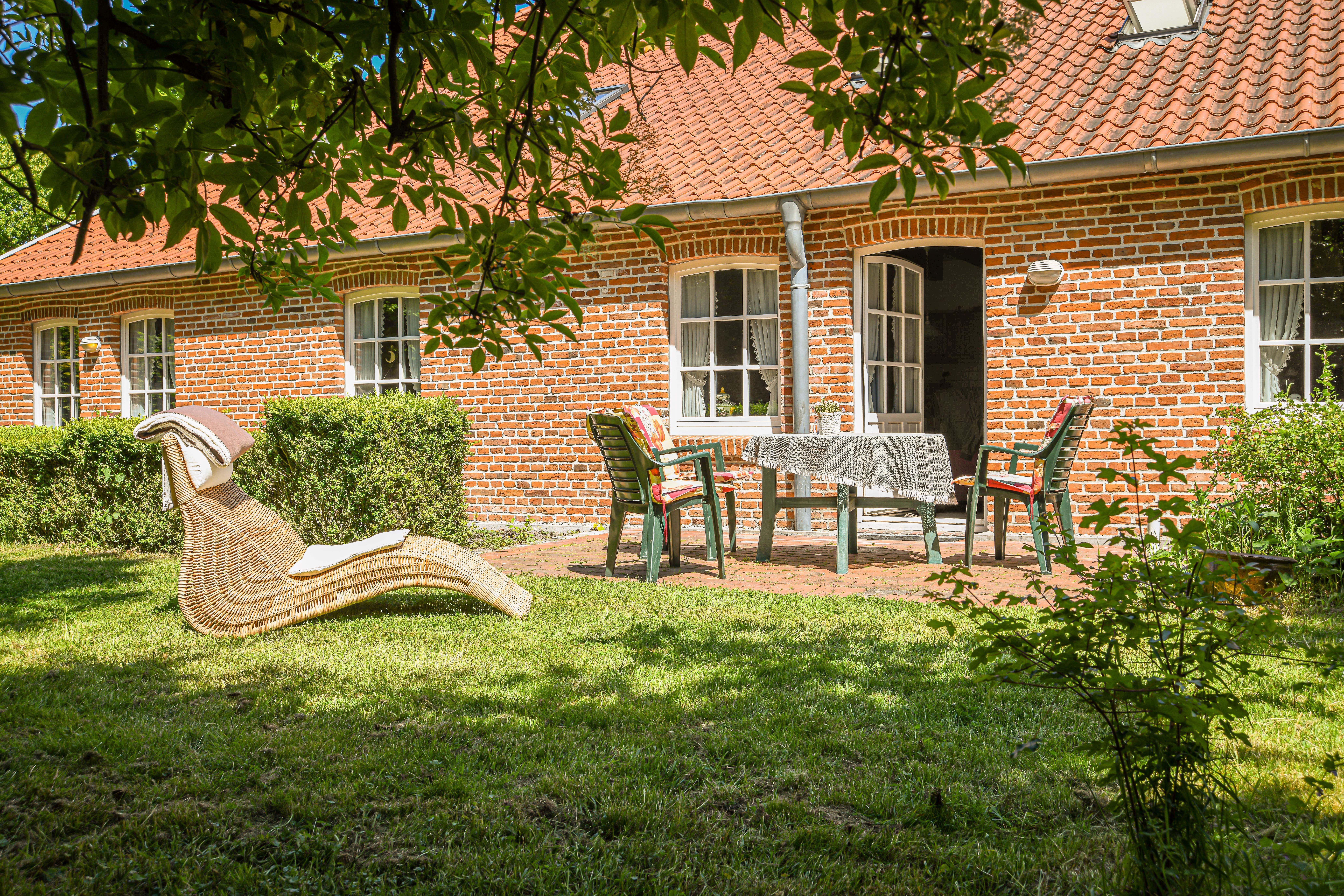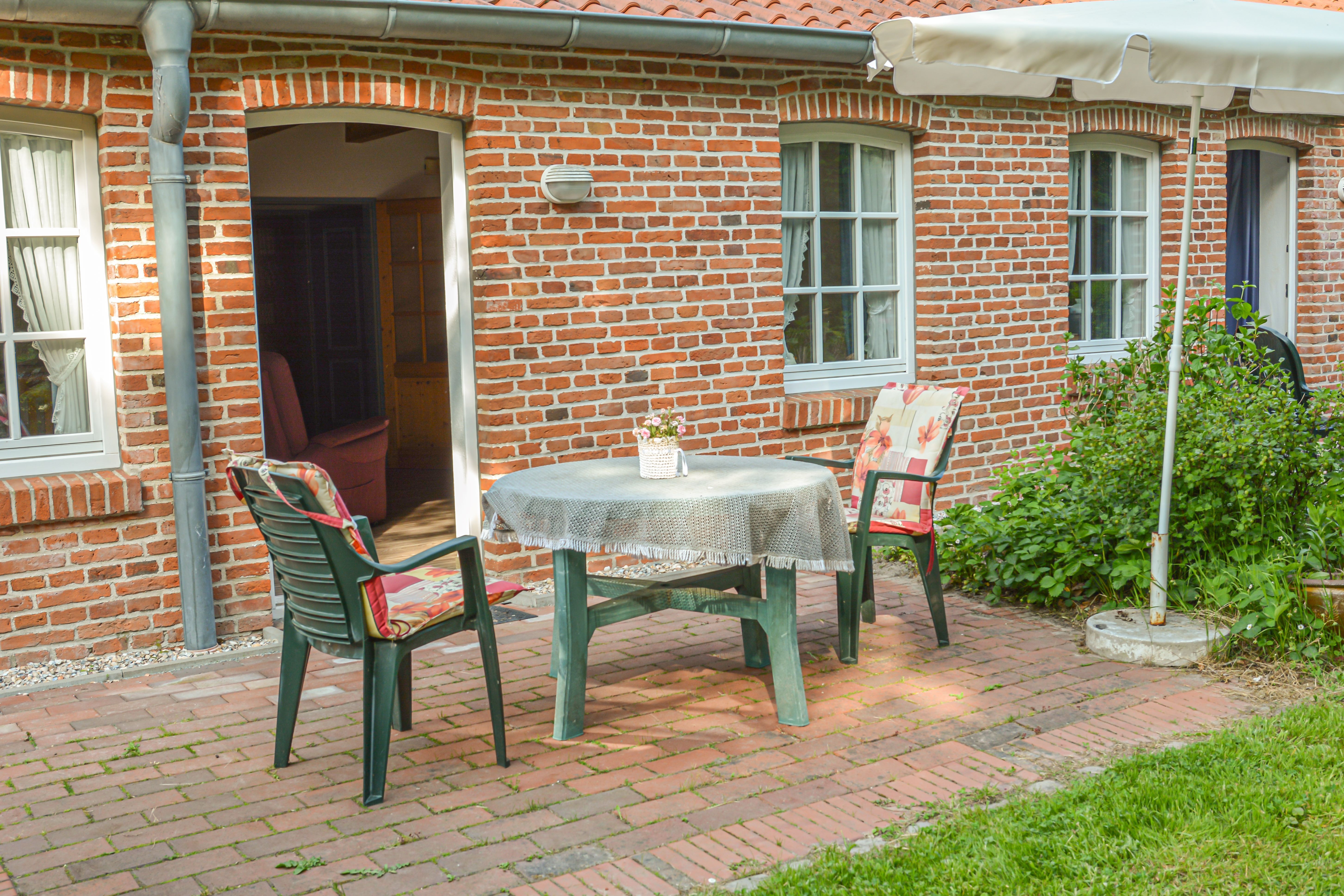Geräumiger Wohn-/Essbereich im Erdgeschoss im ehemaligen Stallgebäude eines friesischen Gulfhofes mit Zugang zu eigener Terrasse/Bauerngarten und Grillstelle. Über eine Treppe gelangt man zum Bad und zum Schlafzimmer mit einem Doppekbett und einem Einzelbett. Im Wohnzimmer befindet sich ein Schlafsofa für eine Person. Ein Kleinkind bis 2 Jahre kann in einem Kinderbett schlafen. Die Wohnung ist für maximal 3 Erwachsene und 1 Kleinkind geeignet.