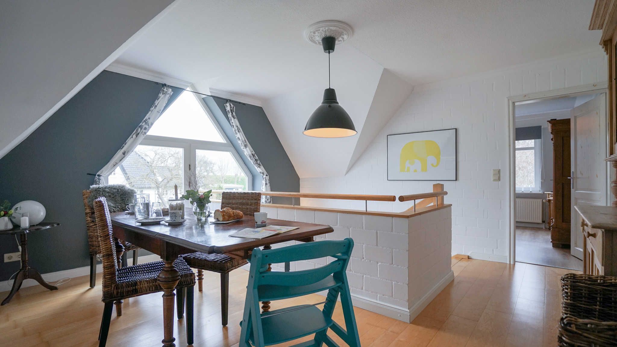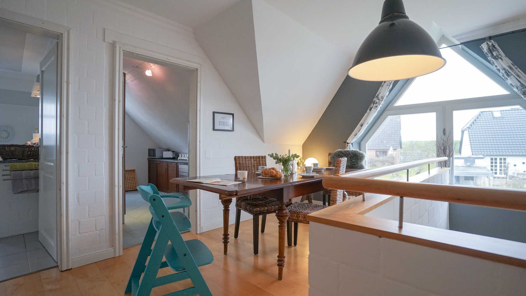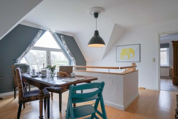 Unsere im Obergeschoss liegende 92 qm Ferienwohnung für bis zu 6 Personen liegt keine 5 Minuten Spaziergang vom Nordseedeich entfernt.