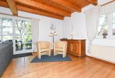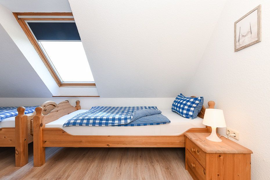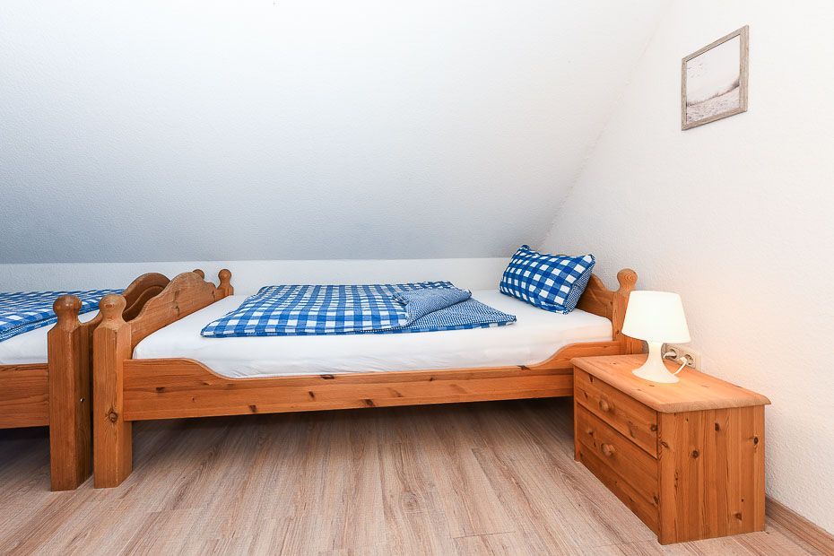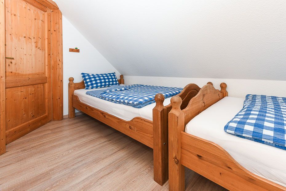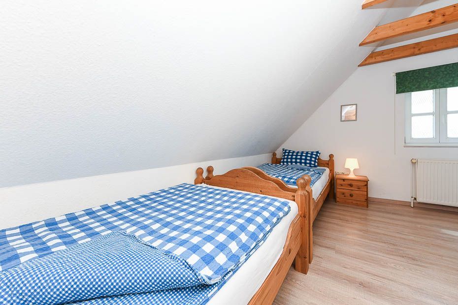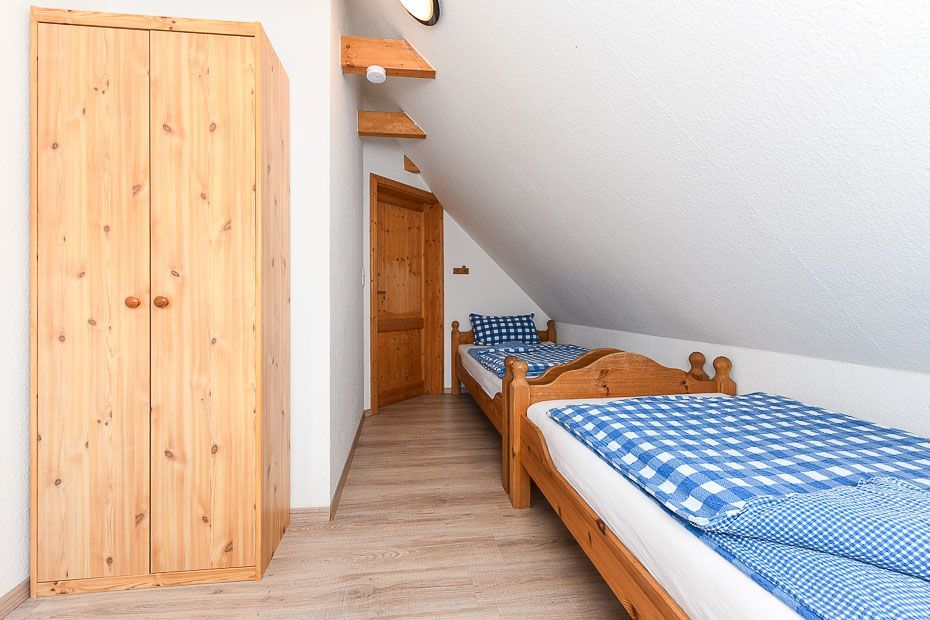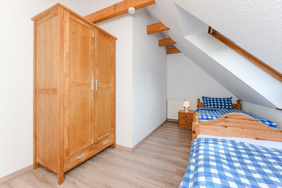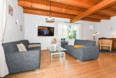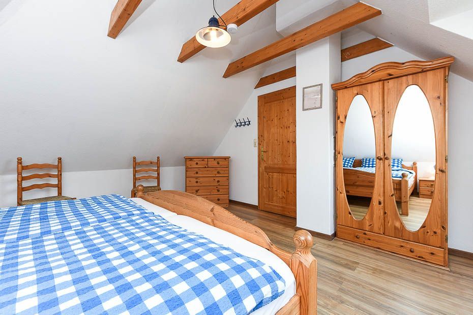 Die Ferienwohnung „Taubenschlag“ ist mit 70 Quadratmetern Wohnfläche auch sehr großzügig und für zwei bis fünf Personen leicht groß genug. Hier gibt es ein Wohnzimmer mit räumlich abgeteilter Küche und Ausgang zur West-Terrasse sowie ein schönes Badezimmer mit Dusche, Waschtisch und WC und zwei Schlafräume.