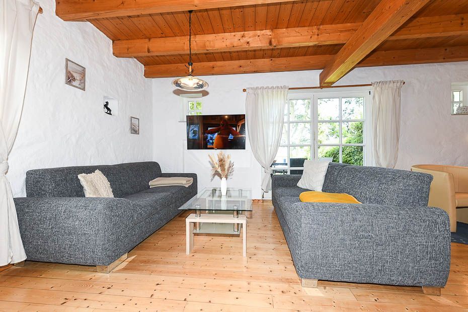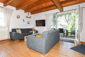 Im und am Ferienhaus gibt es ein sehr großes Wohnzimmer mit Kamin und Ausgang zur großen West-Terrasse nebst hervorragend ausgestatteter Küche sowie ein schönes Badezimmer mit Dusche, Waschtisch und WC. Außerdem gibt es drei Schlafräume im Obergeschoss. Rund um das Haus gibt es neben der West-Terrasse weitere Sitzgelegenheiten, zum Beispiel für ein schönes Frühstück im Freien.