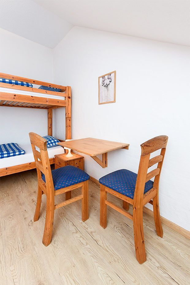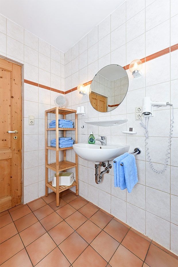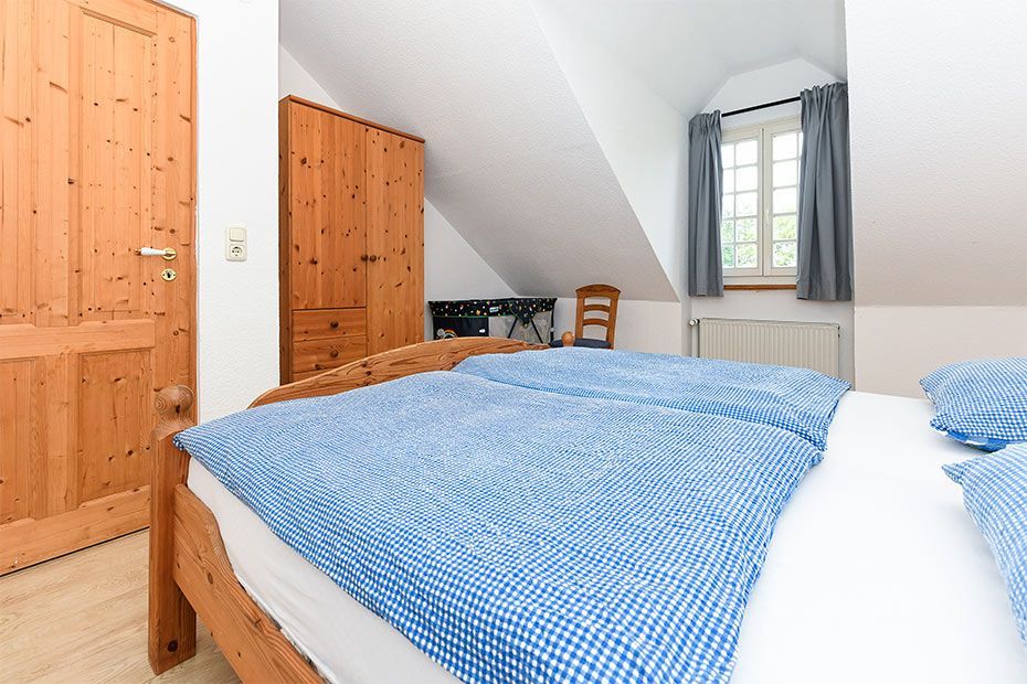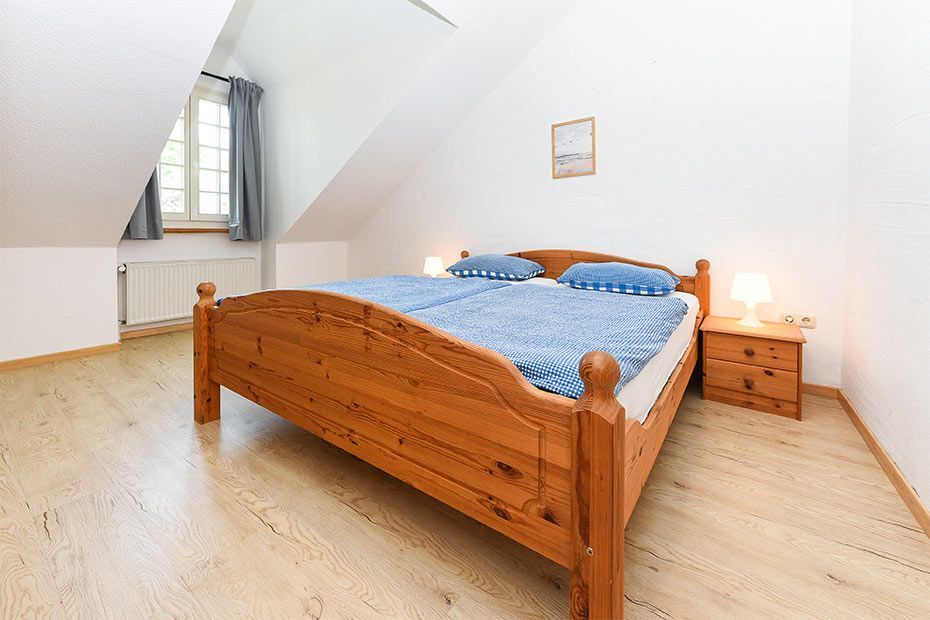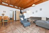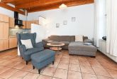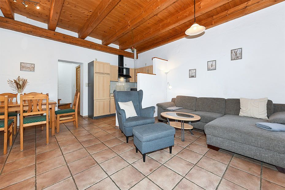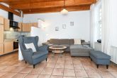 Die Ferienwohnung „Taubenschlag“ ist mit 70 Quadratmetern Wohnfläche auch sehr großzügig und für zwei bis fünf Personen leicht groß genug. Hier gibt es ein Wohnzimmer mit räumlich abgeteilter Küche und Ausgang zur West-Terrasse sowie ein schönes Badezimmer mit Dusche, Waschtisch und WC und zwei Schlafräume.