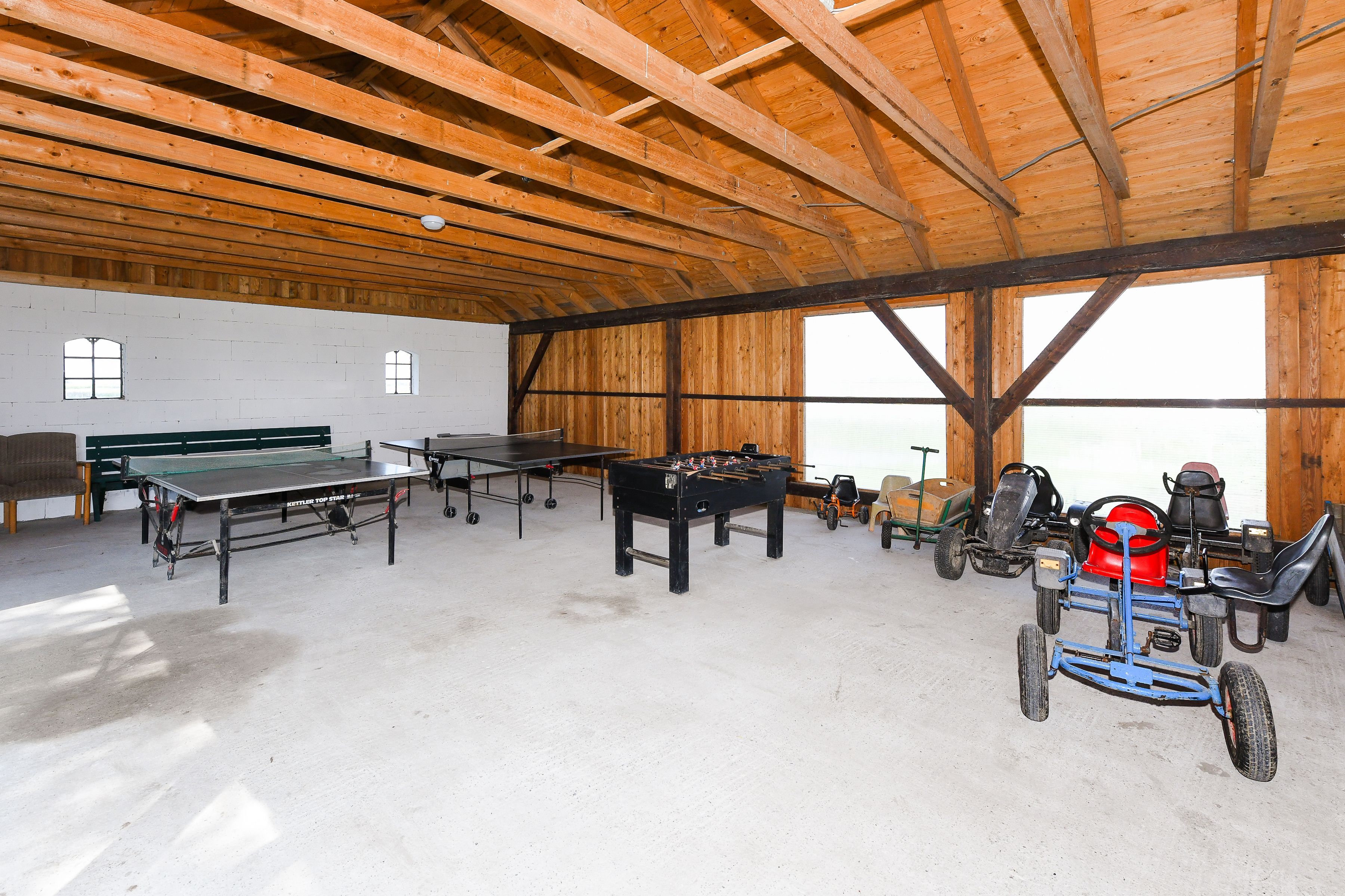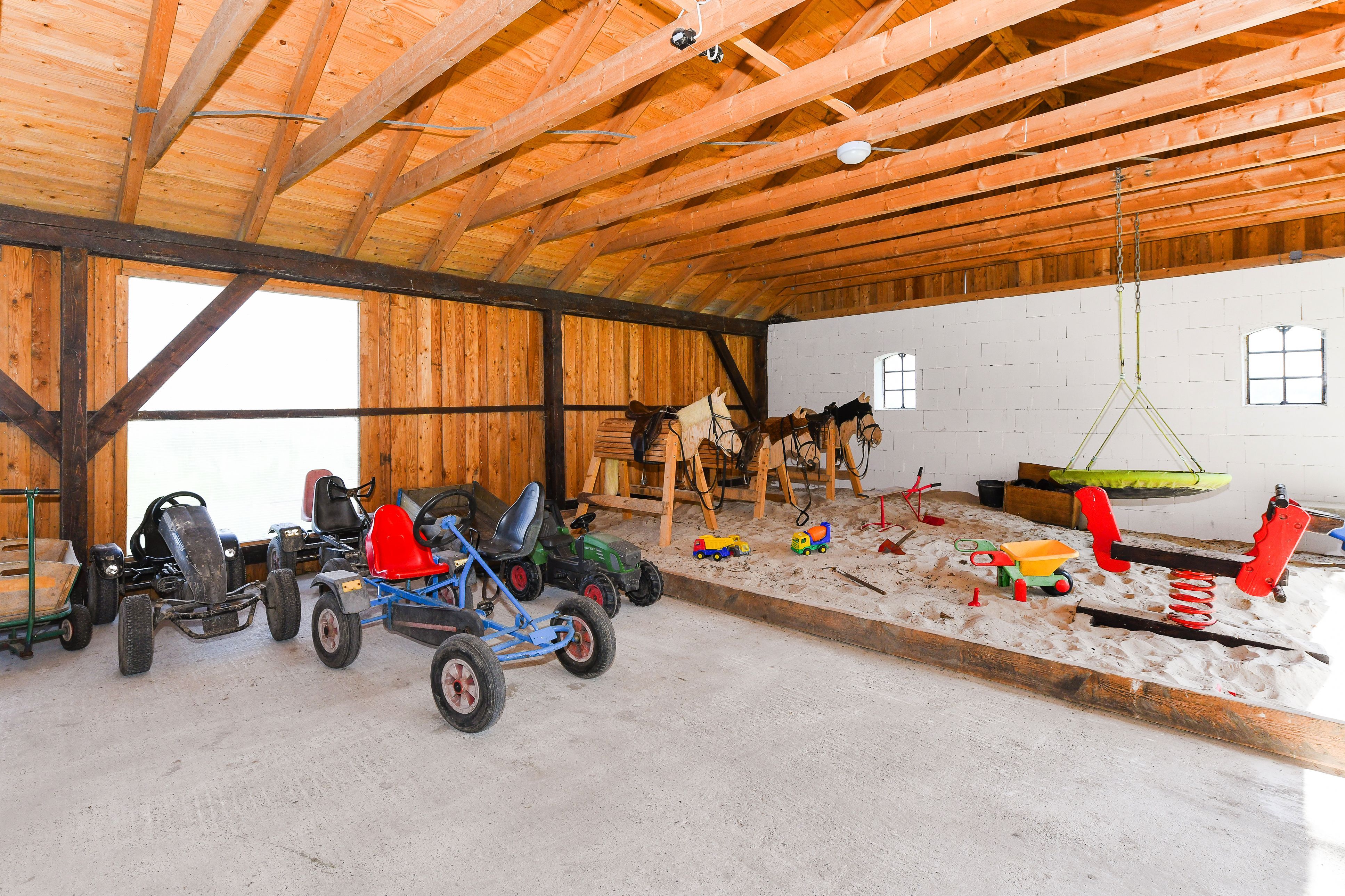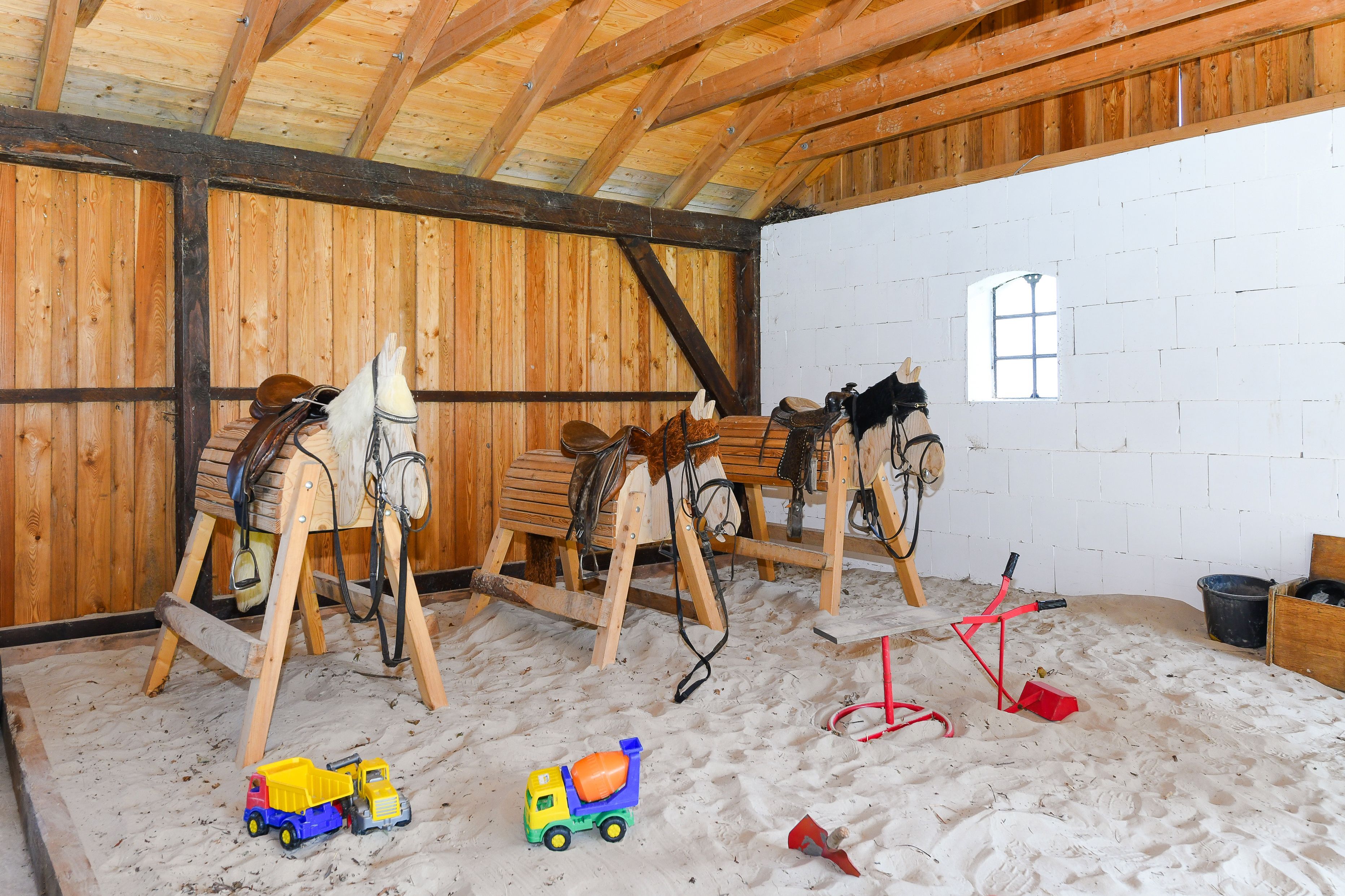 Alle 14 Tage findet unter den uralten großen Linden ein Lagerfeuer statt. Es gibt außerdem mehrere Außenspielplätze und einen Sandspielplatz in der Reithalle. Und dann sind da zum Beispiel noch drei Dino-Cars (also große GoCarts), einer sogar mit Anhänger, eine Strohburg, ein Baumhaus und vieles mehr.