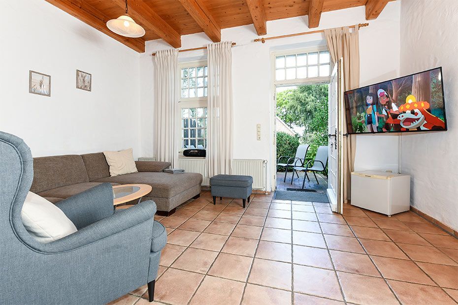 Im und am Ferienhaus gibt es ein sehr großes Wohnzimmer mit Kamin und Ausgang zur großen West-Terrasse nebst hervorragend ausgestatteter Küche sowie ein schönes Badezimmer mit Dusche, Waschtisch und WC. Außerdem gibt es drei Schlafräume im Obergeschoss. Rund um das Haus gibt es neben der West-Terrasse weitere Sitzgelegenheiten, zum Beispiel für ein schönes Frühstück im Freien.
