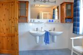 Naturholzmöbel und Parkettfußboden. Badezimmer mit 2 Waschbecken, Dusche, WC und Badewanne.