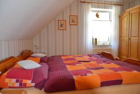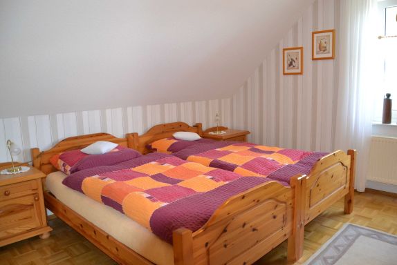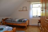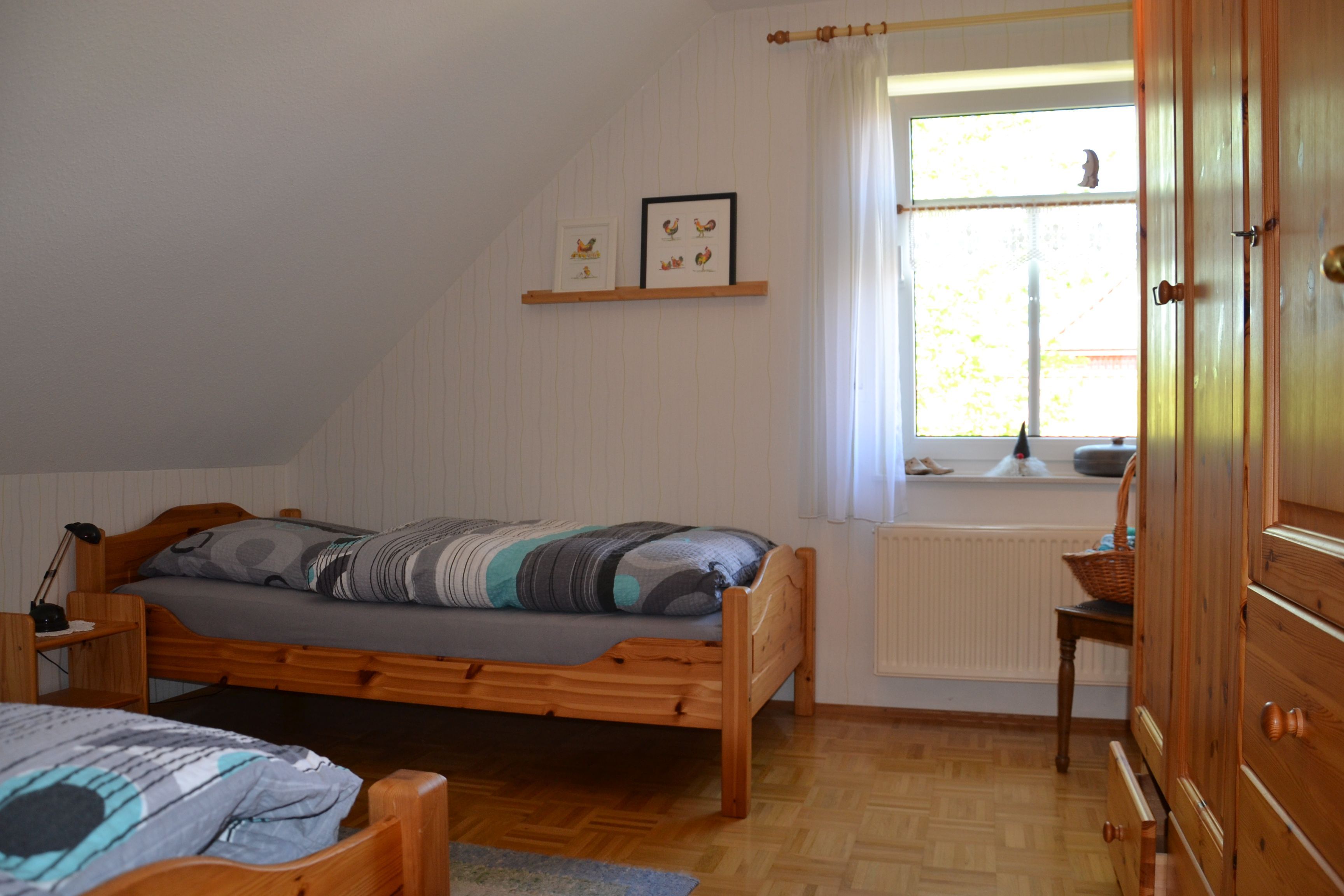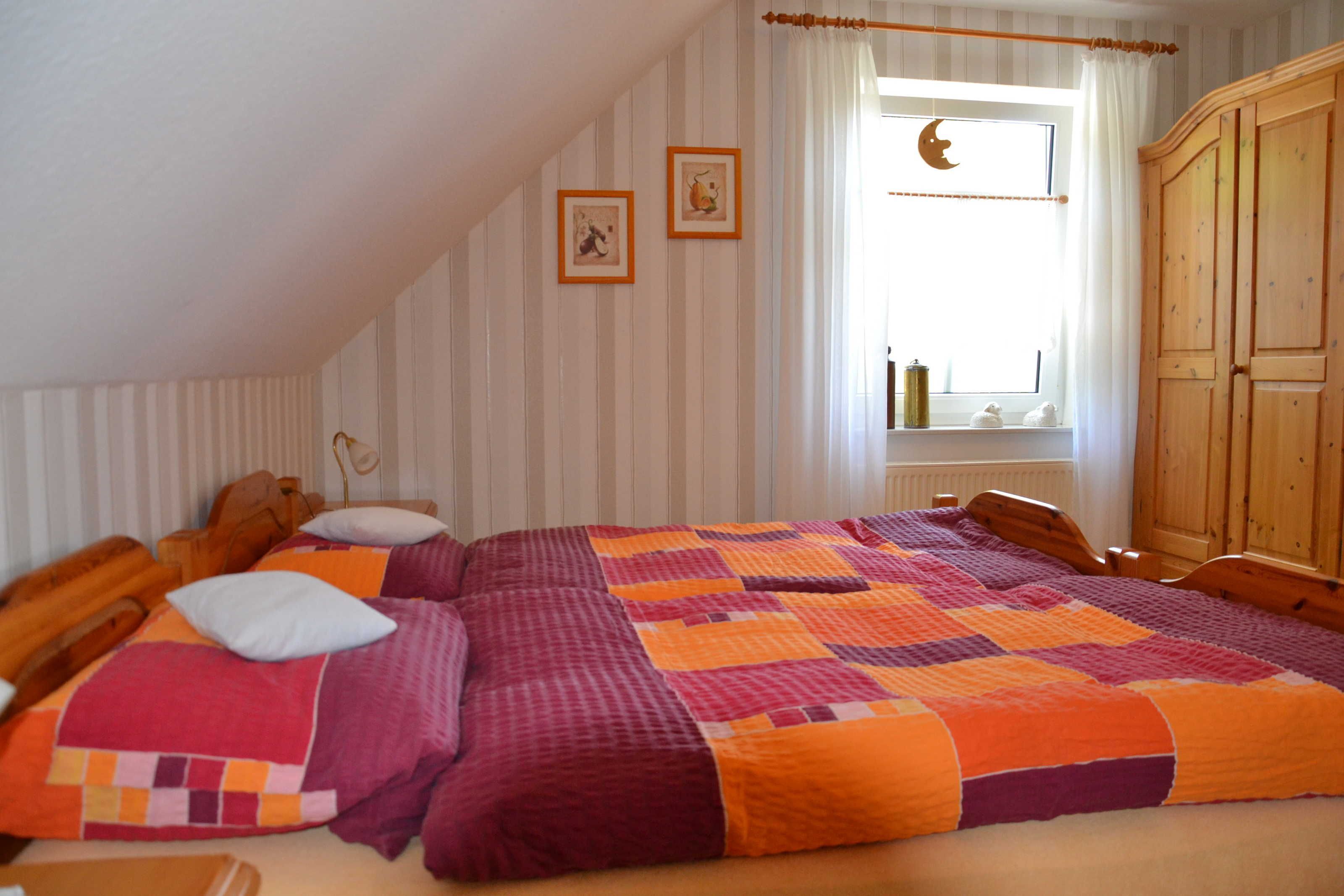 Helles Zimmer mit Doppelbett, 2 Nachttischen und Kleiderschrank. Das zweite Zimmer mit zwei Einzelbetten.