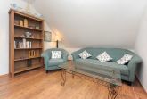 Größe ca. 40 Quadratmeter, Wohnzimmer, Küche, Schlafzimmer, Badezimmer mit Dusche, Waschtisch und WC, Obergeschoss, optimal für 2 Personen.