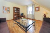 Größe ca. 50 Quadratmeter, Wohnzimmer, Küche, Schlafzimmer, Badezimmer mit Dusche, Waschtisch und WC, Obergeschoss, optimal für 2 Personen.