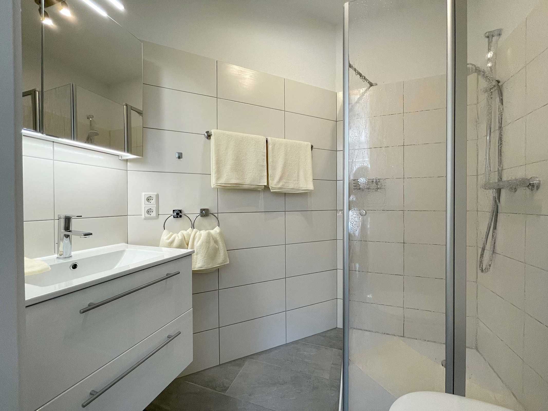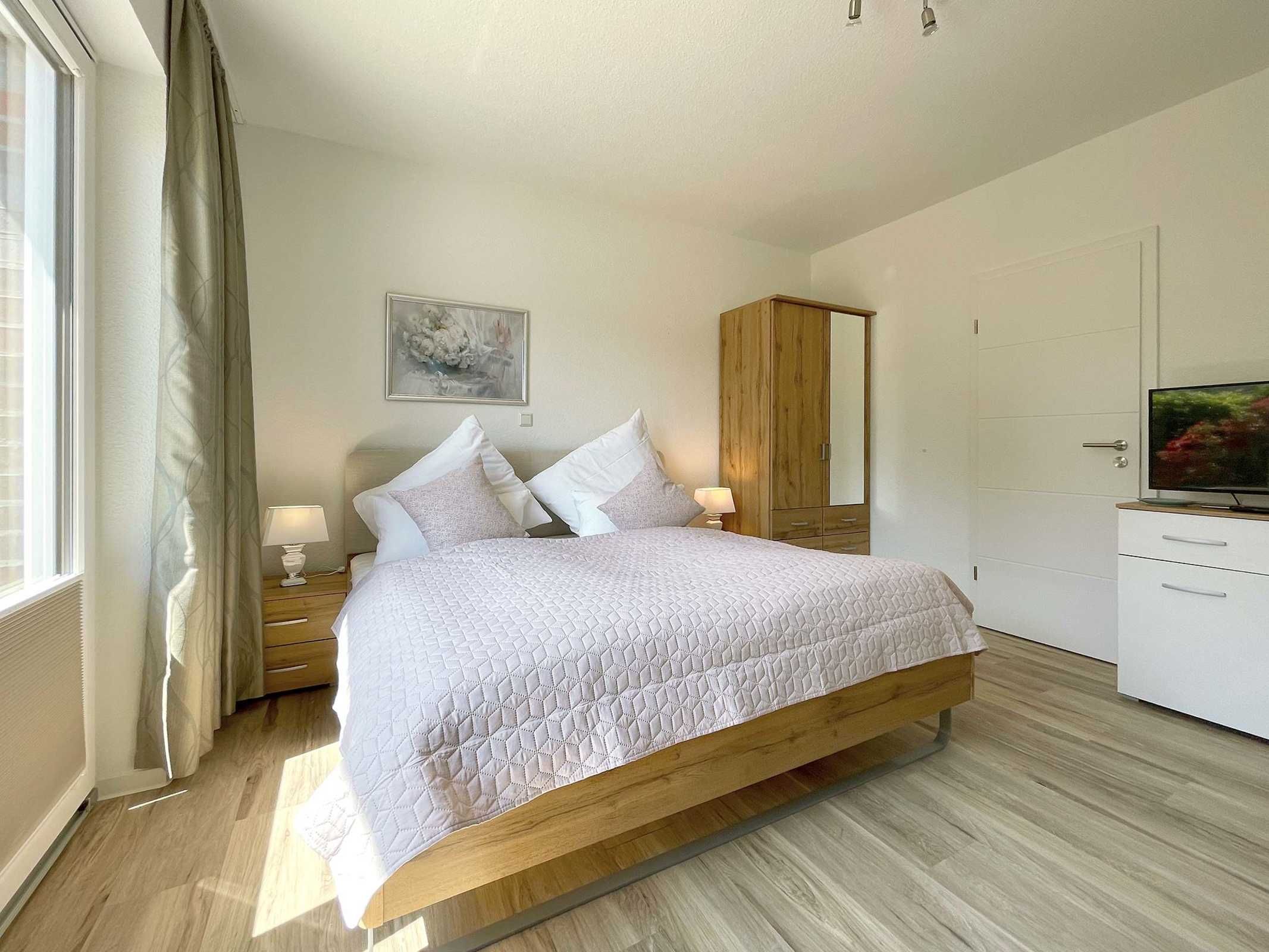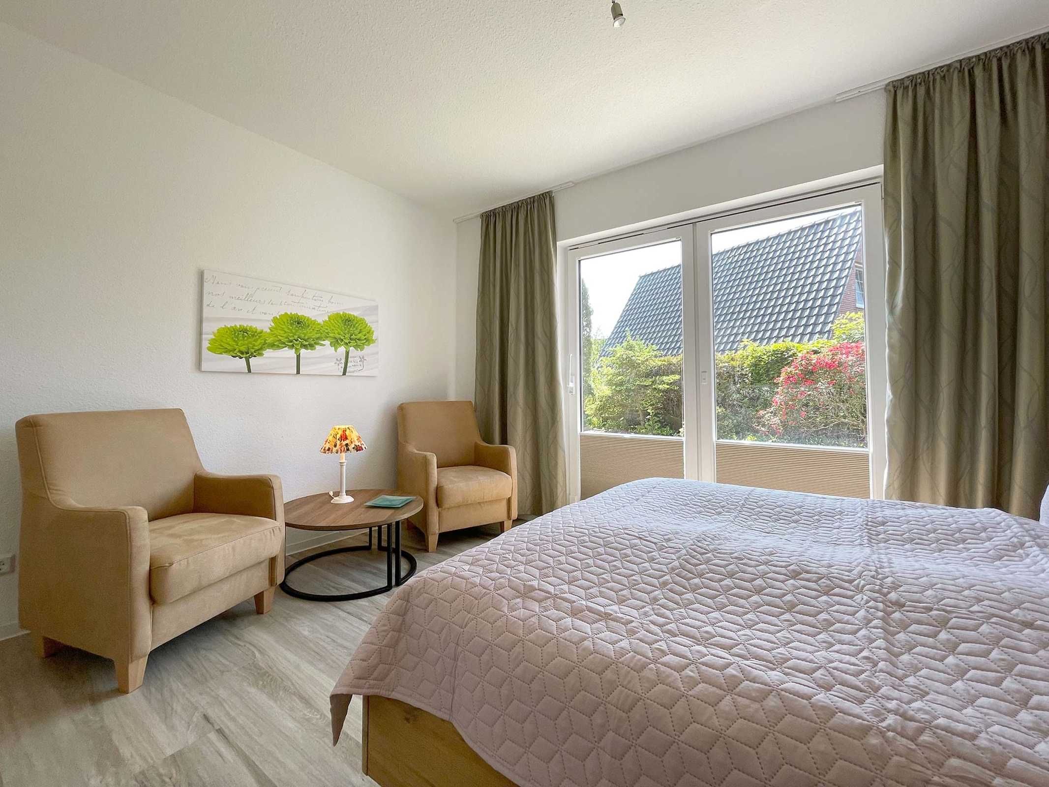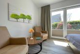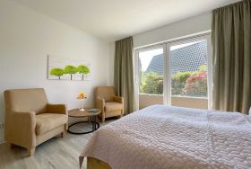 Komfortabel und hell ausgestattetes Doppelzimmer im Erdgeschoss mit eigener Terrasse. Große Fenster und Terrassenschiebetüren lassen viel Licht und Sonne in den Raum. Auf der eigenen Terrasse können Sie herrlich entspannen. Ein bequemes Doppelbett mit getrennten Matratzen bietet echten Schlafkomfort. Modernes Bad mit Dusche/WC. Information und Unterhaltung erhalten Sie auf dem großen Smart-TV und das kostenlose WLAN verbindet Sie mit der digitalen Welt. Frühstück inklusive. Kaffeemaschine, Wasserkocher und ein kleiner Kühlschrank stehen im Haus zur Verfügung.