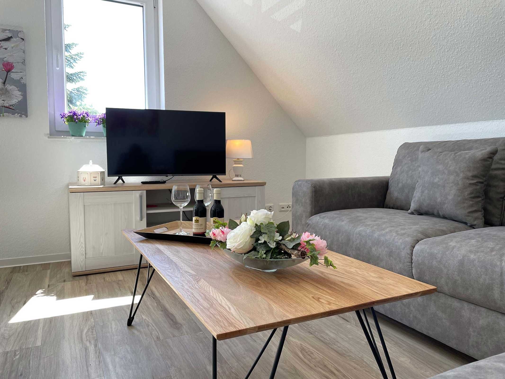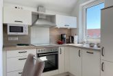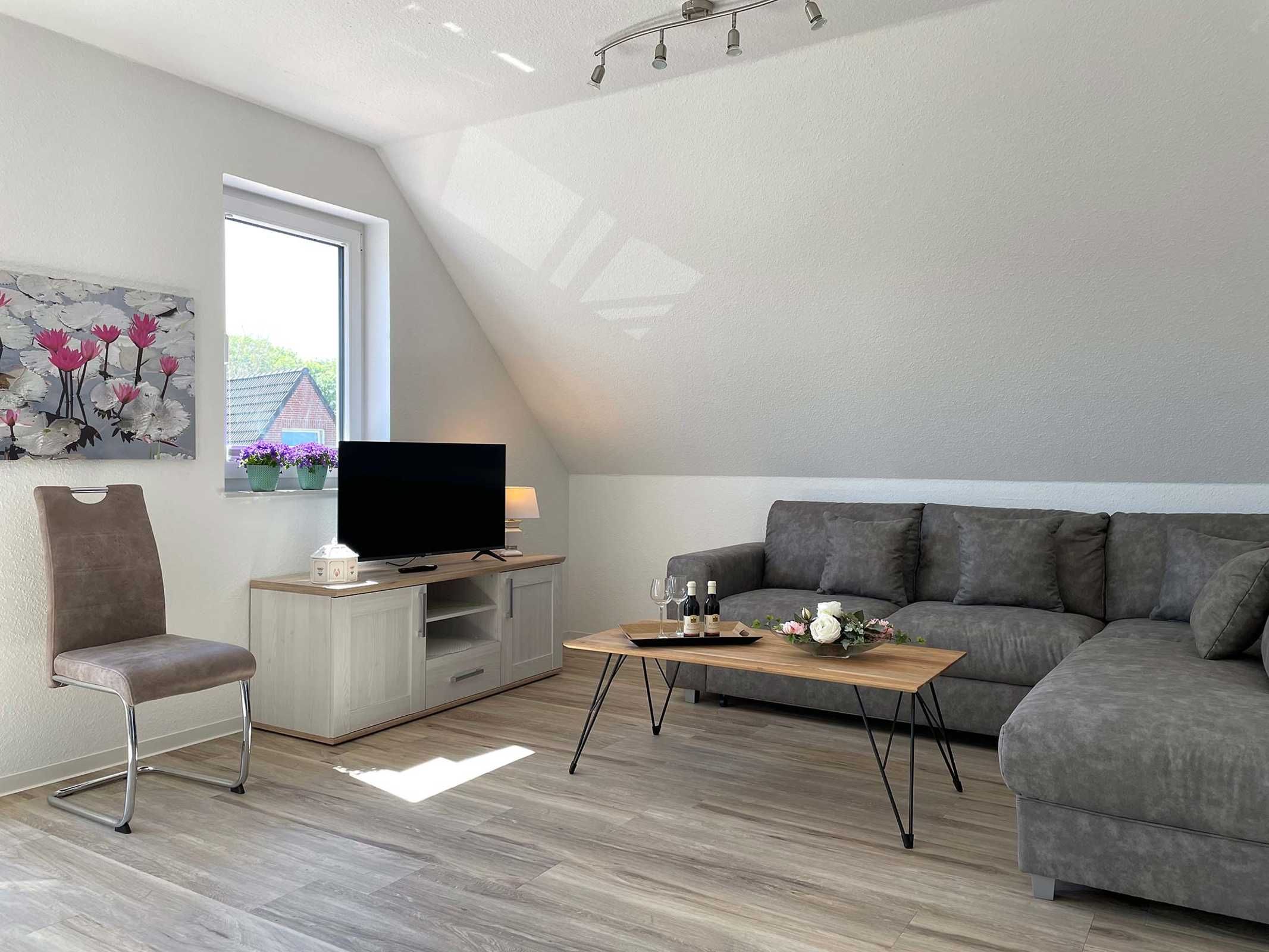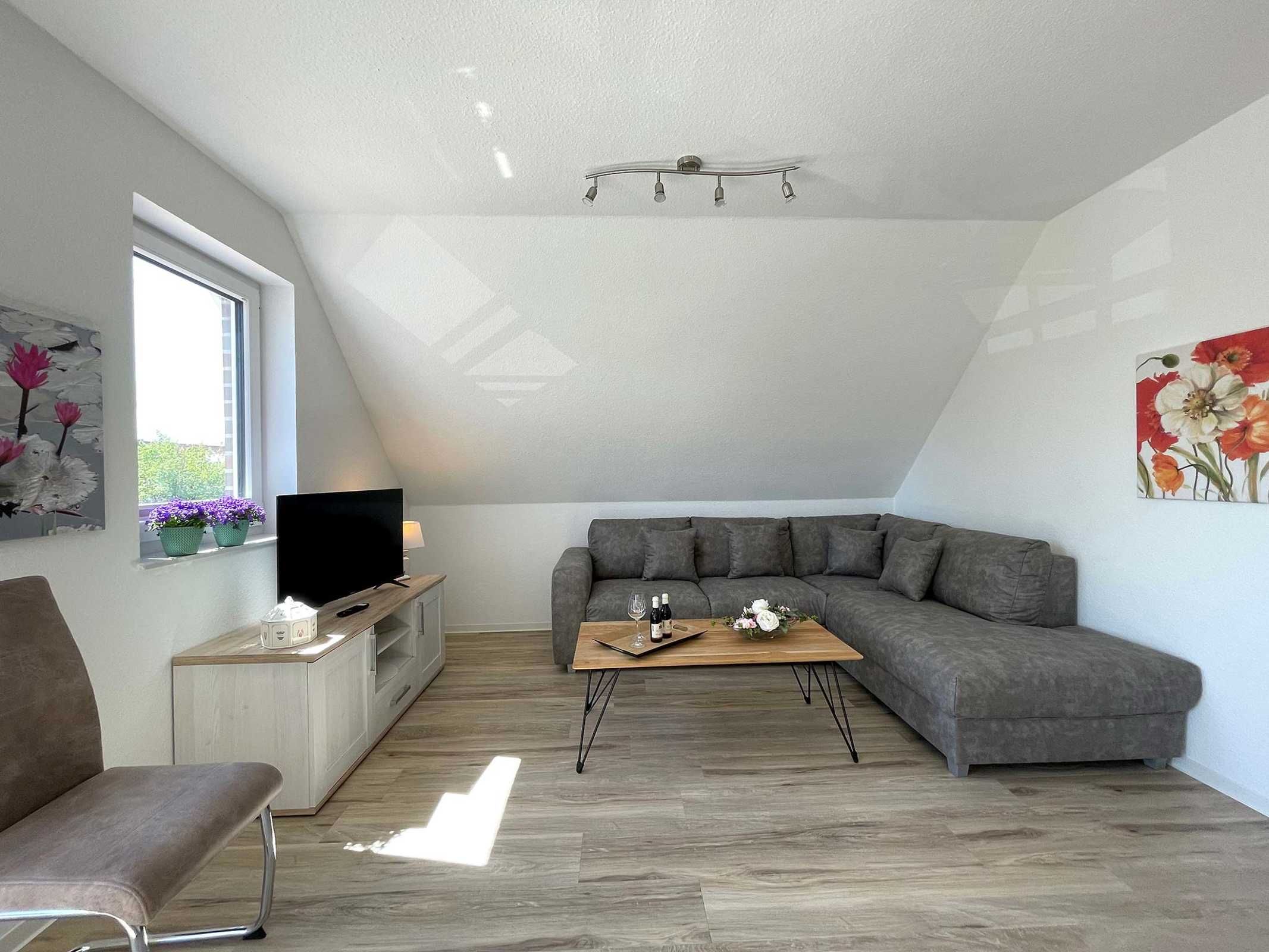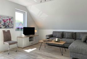 Unsere moderne Ferienwohnung mit Balkon im Obergeschoss bietet viel Platz für 2 Personen. Ein bequemes Doppelbett im separaten Schlafzimmer bietet echten Schlafkomfort. Im großen Sitzbereich können Sie herrlich entspannen. Mit der offenen Küchenzeile im Wohnbereich, inkl. Backofen und Spülmaschine, können Sie sich entspannt selbst versorgen. Information und Unterhaltung erhalten Sie auf dem großen Smart-TV und das kostenlose WLAN verbindet Sie mit der digitalen Welt. Modernes Bad mit Dusche/WC und Fenster. Frühstück inklusive.