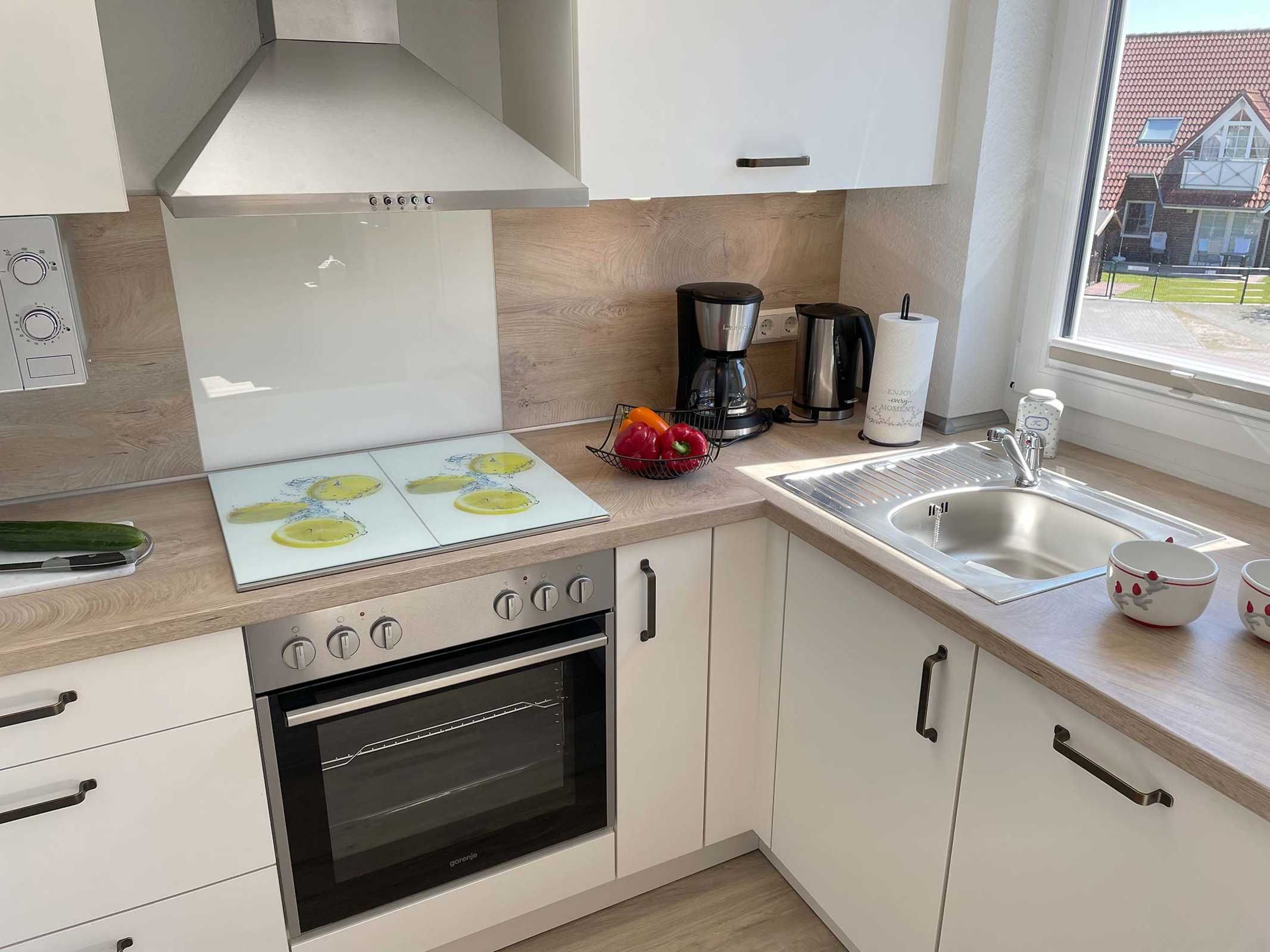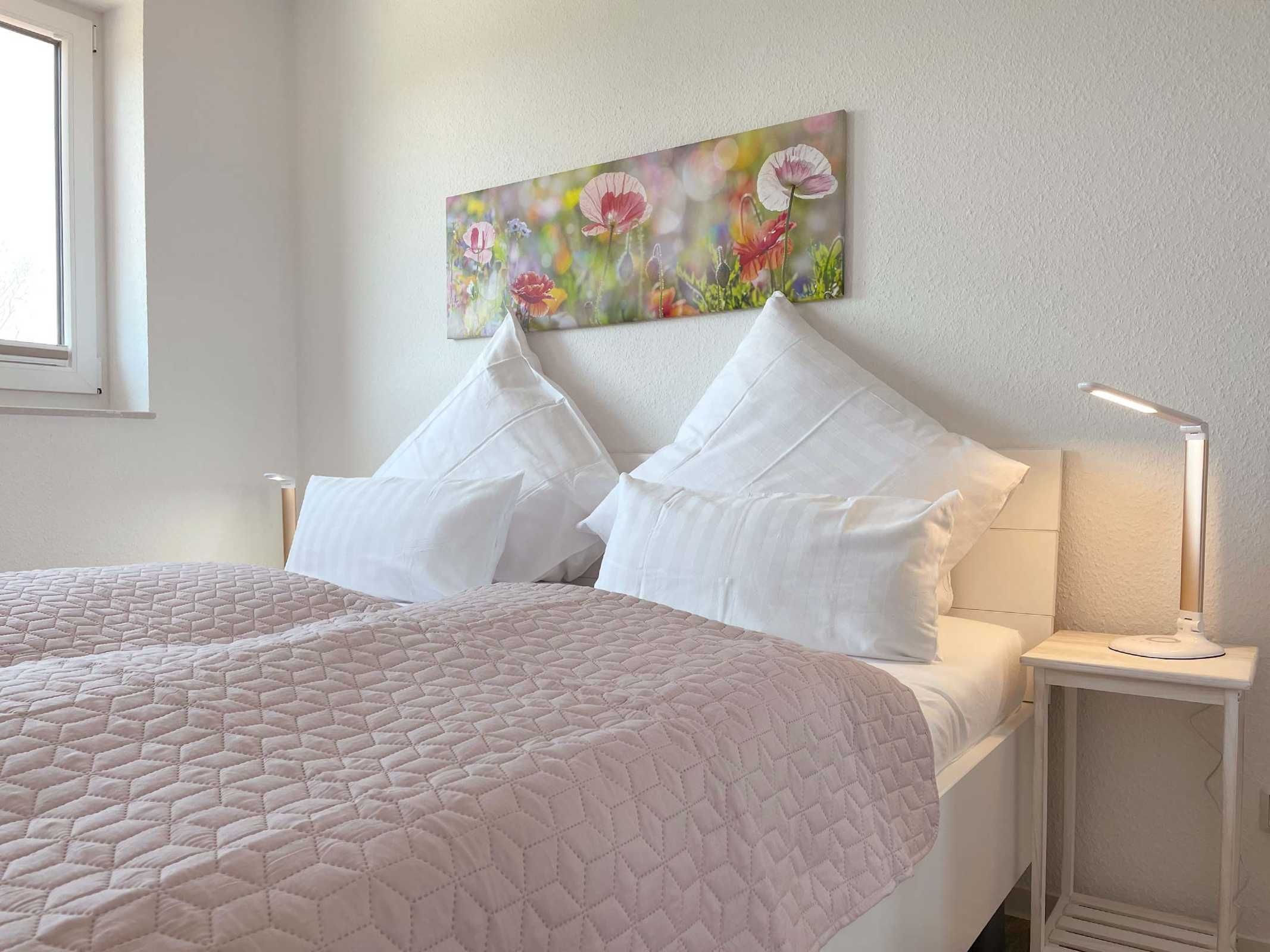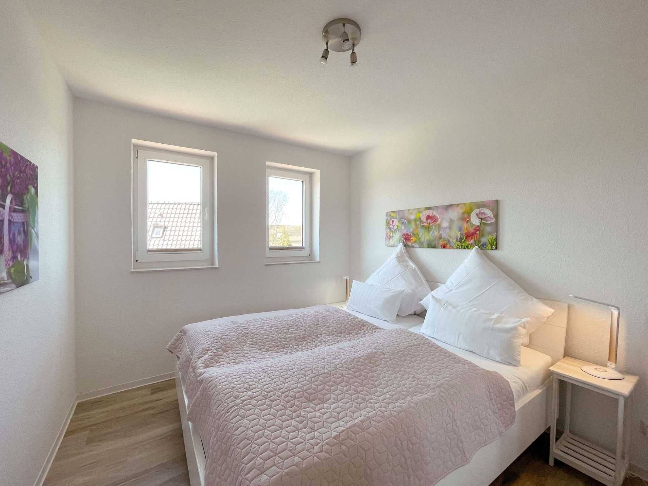 Unsere moderne Ferienwohnung mit Balkon im Obergeschoss bietet viel Platz für 2 Personen. Ein bequemes Doppelbett im separaten Schlafzimmer bietet echten Schlafkomfort. Im großen Sitzbereich können Sie herrlich entspannen. Mit der offenen Küchenzeile im Wohnbereich, inkl. Backofen und Spülmaschine, können Sie sich entspannt selbst versorgen. Information und Unterhaltung erhalten Sie auf dem großen Smart-TV und das kostenlose WLAN verbindet Sie mit der digitalen Welt. Modernes Bad mit Dusche/WC und Fenster. Frühstück inklusive.