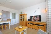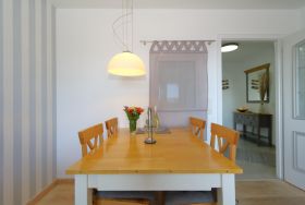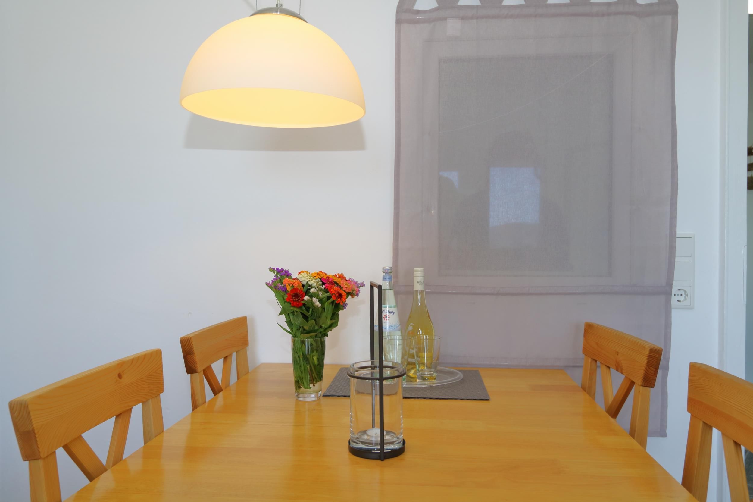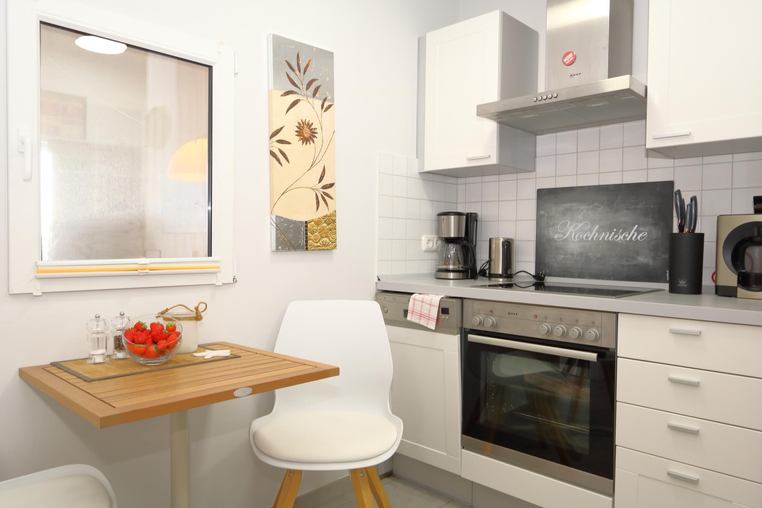 Die Küche ist sehr umfangreich ausgestattet. Das Geschirr ist für 4 Personen ausgelegt. Ein Backofen, Spülmaschine, Kühl- Gefrierschrank, Mikrowelle, Toaster, Filterkaffeemaschine, Padmaschine (Krupps Dolce-Gusto), viele weitere Utensilien zum Kochen/ Backen und vieles mehr gehören hier zum Standard .Ein kleiner Tisch mit Stühlen erweitert den Arbeitsbereich oder lädt zum Essen.