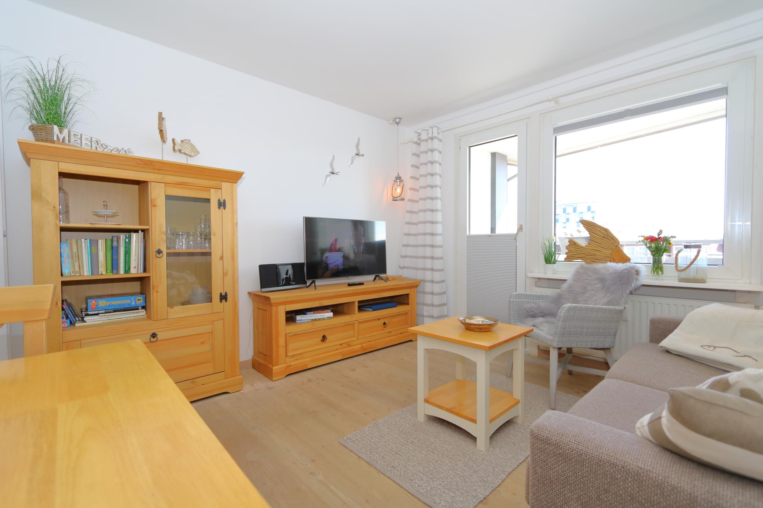 Das gemütliche Wohnzimmer, mit Balkon, Echtholzfußboden, Massivholz Möbeln, großem, 43 Smart- TV, Grundig Kompaktanlage mit Radio, W'Lan, CD- Player und Bluetooth, Esstisch mit Stühlen für 4 Personen und einer hochwertigen Schlafcouch (mit Lattenrost) warten hier auf euch. Von hier können Sie auch den möblierten Balkon erreichen.