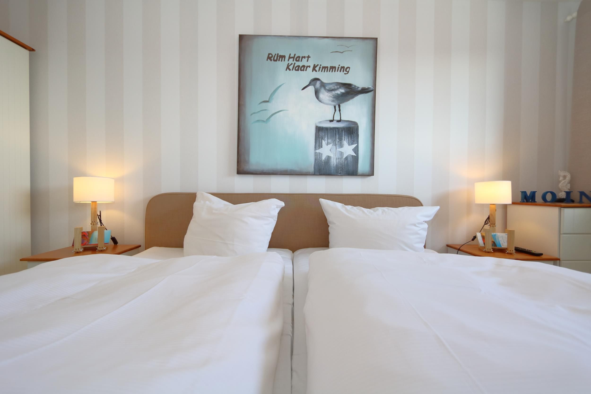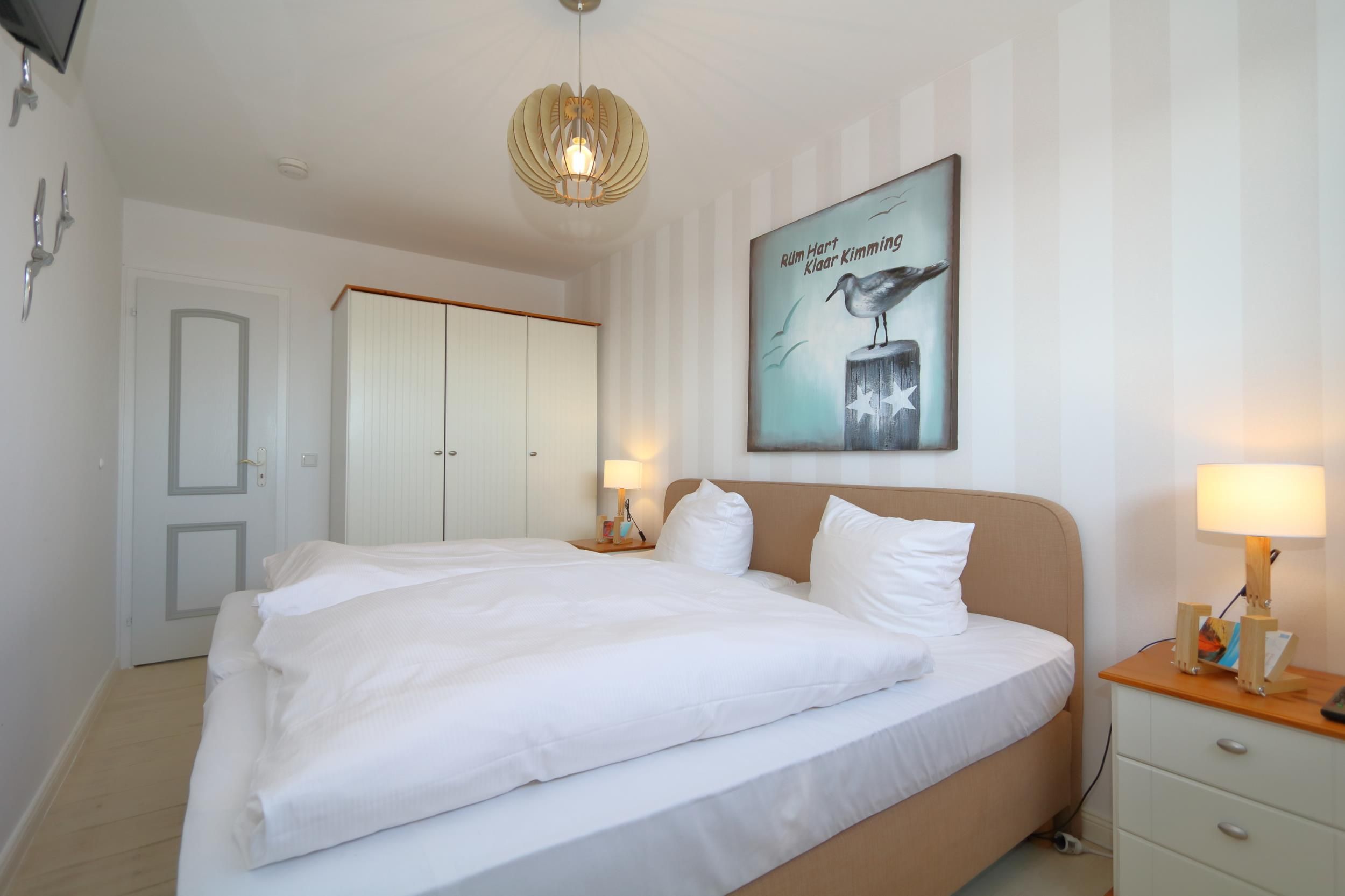Das Schlafzimmer, ebenfalls mit einem Echtholzfußboden ausgestattet, komfortablen Boxspringbett (2,0x 2,0m) und LED- Fernseher sorgen für erholsame Nächte nach ausgedehnten Strandspaziergängen oder einer durchgefeierten Nacht. Ein Bettchen für die kleinsten ist natürlich auch da und kann bei Bedarf aufgestellt werden.