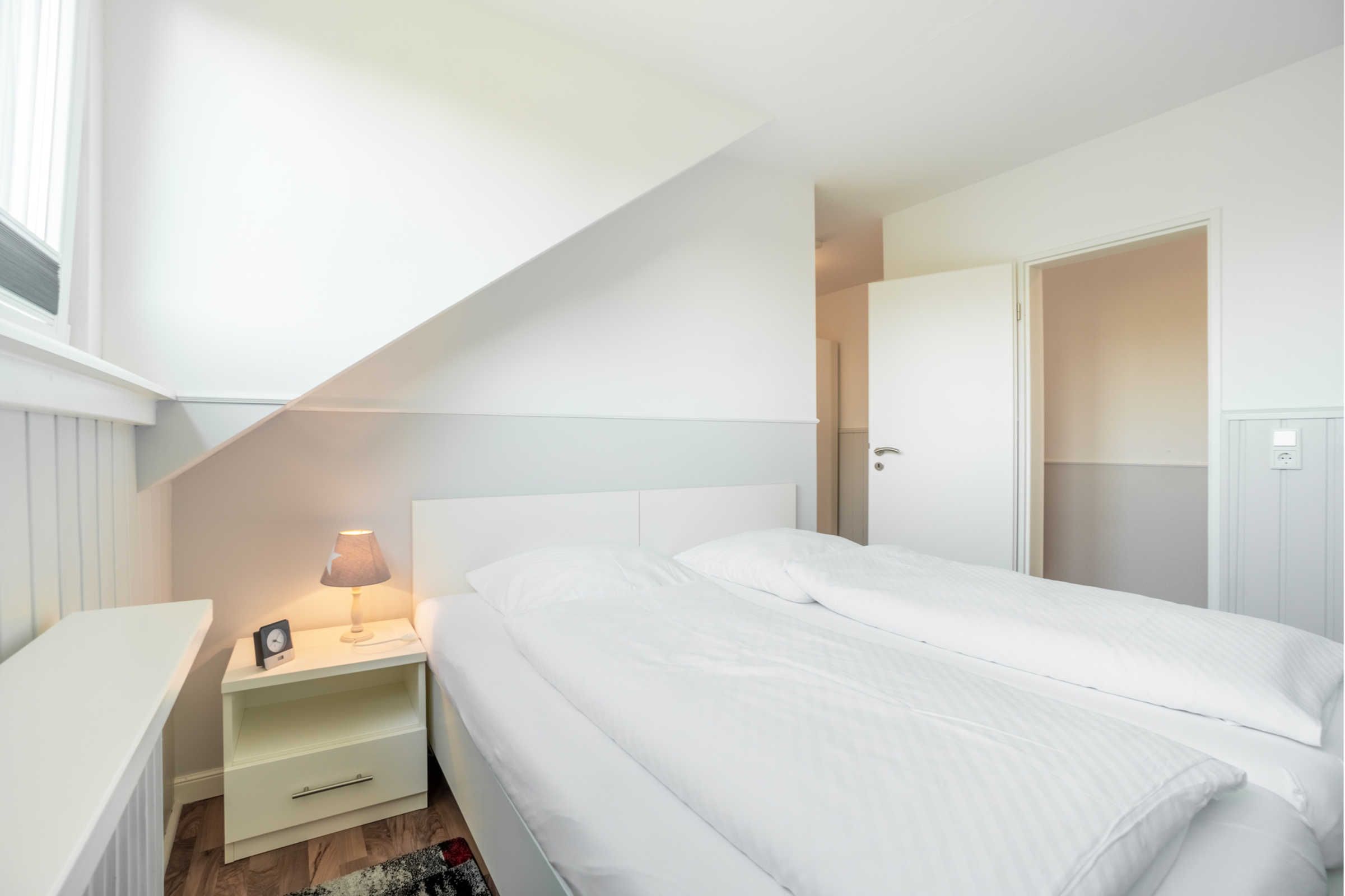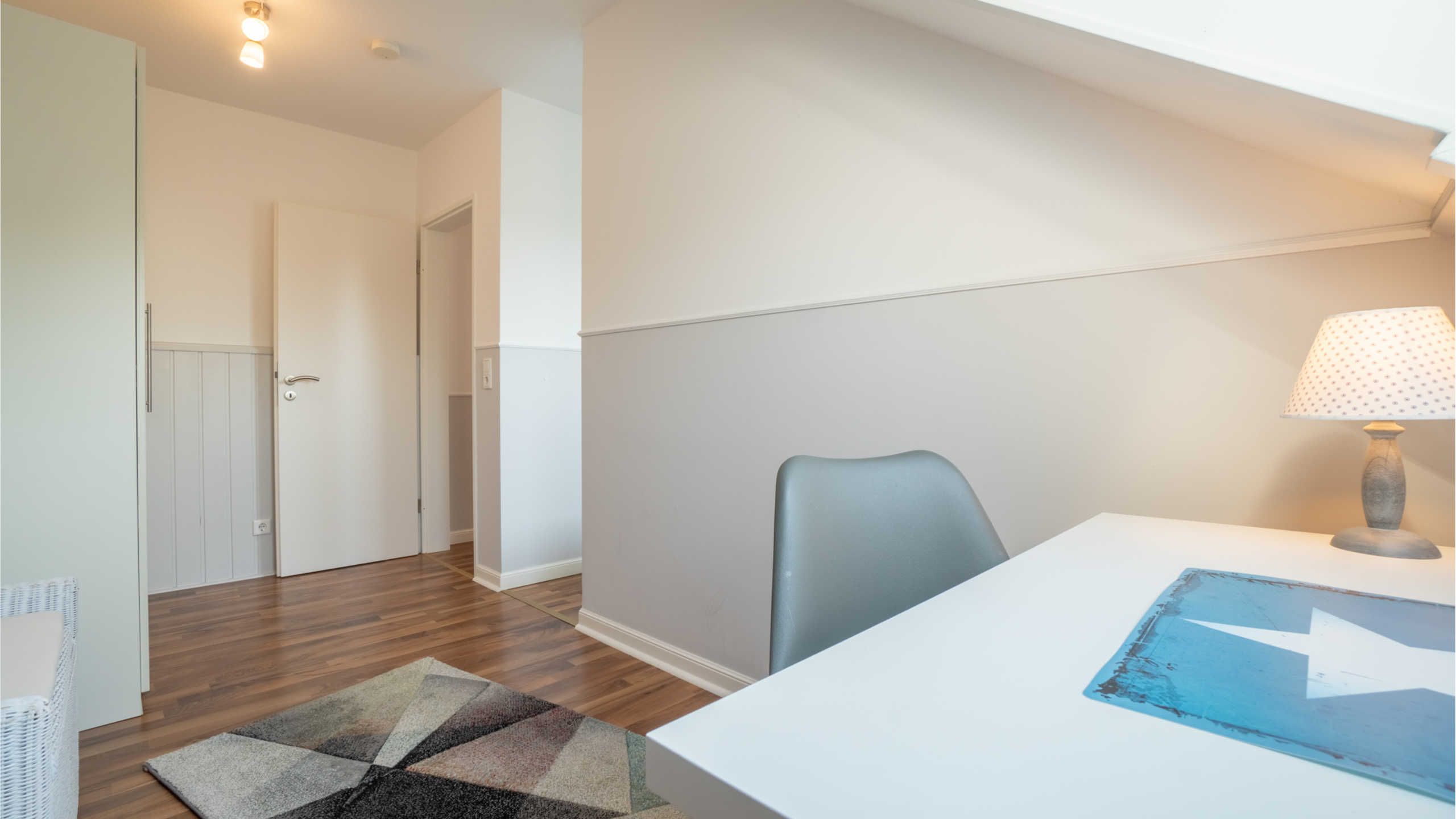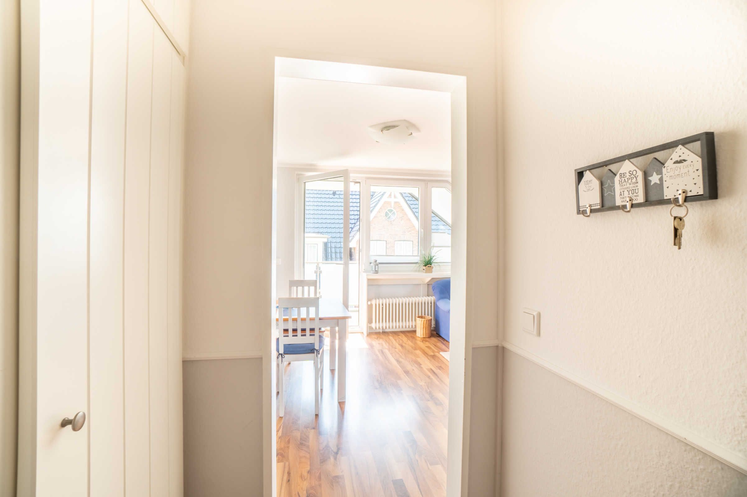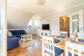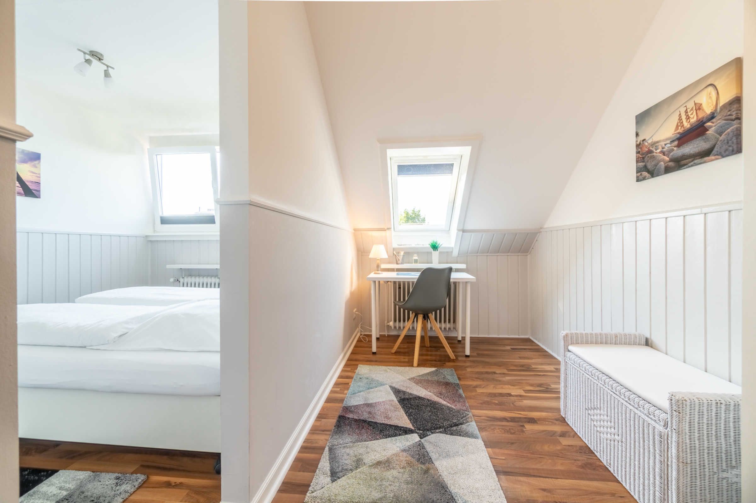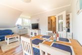 Die Wohnung liegt im Obergeschoss rechts und bietet Platz für bis zu 2 Personen mit Kleinkind. Sie hat einen Zugang zum Westbalkon.
