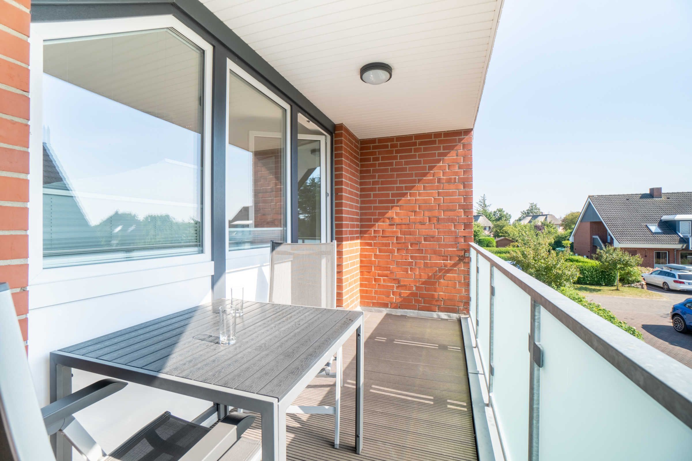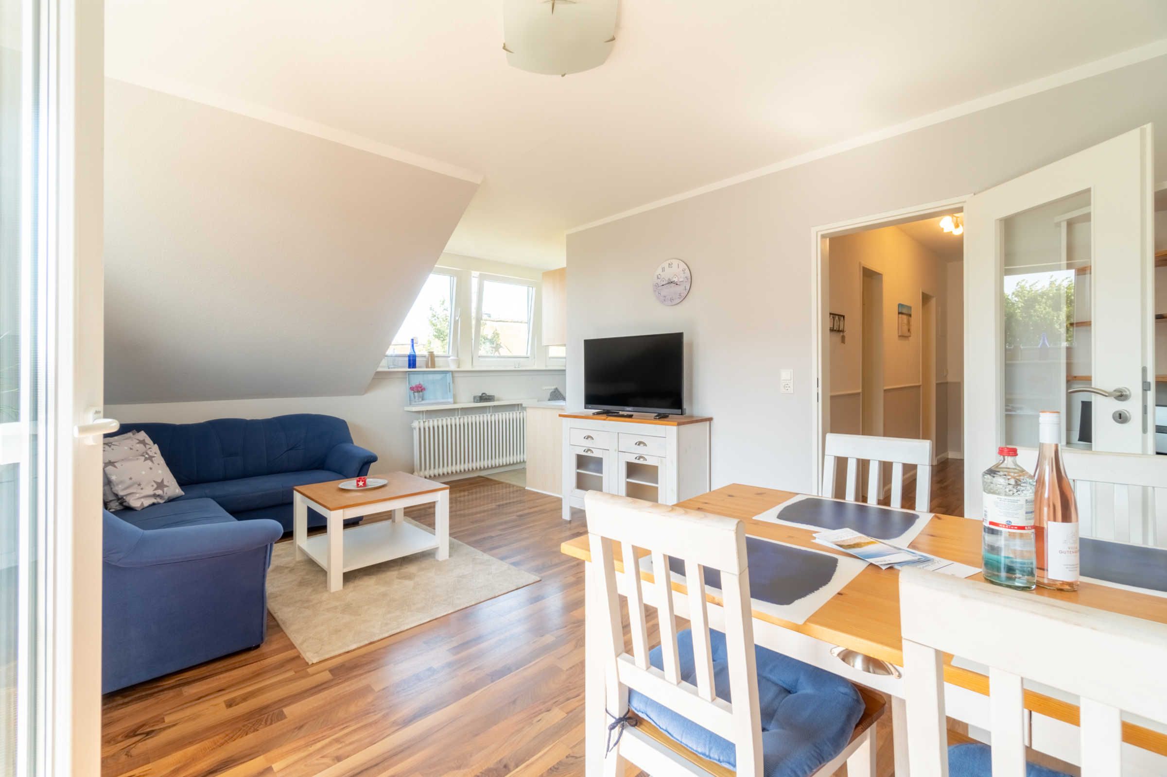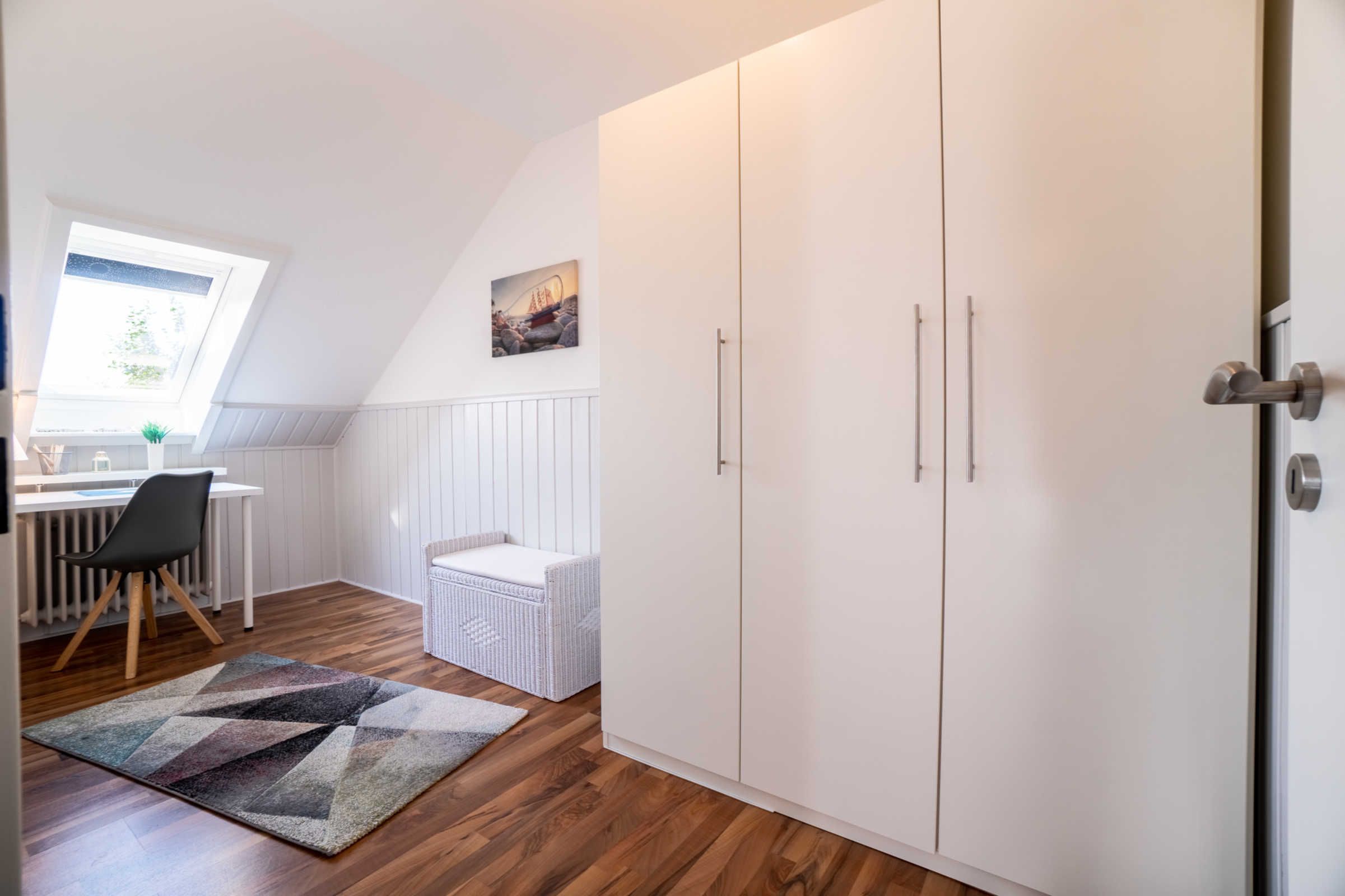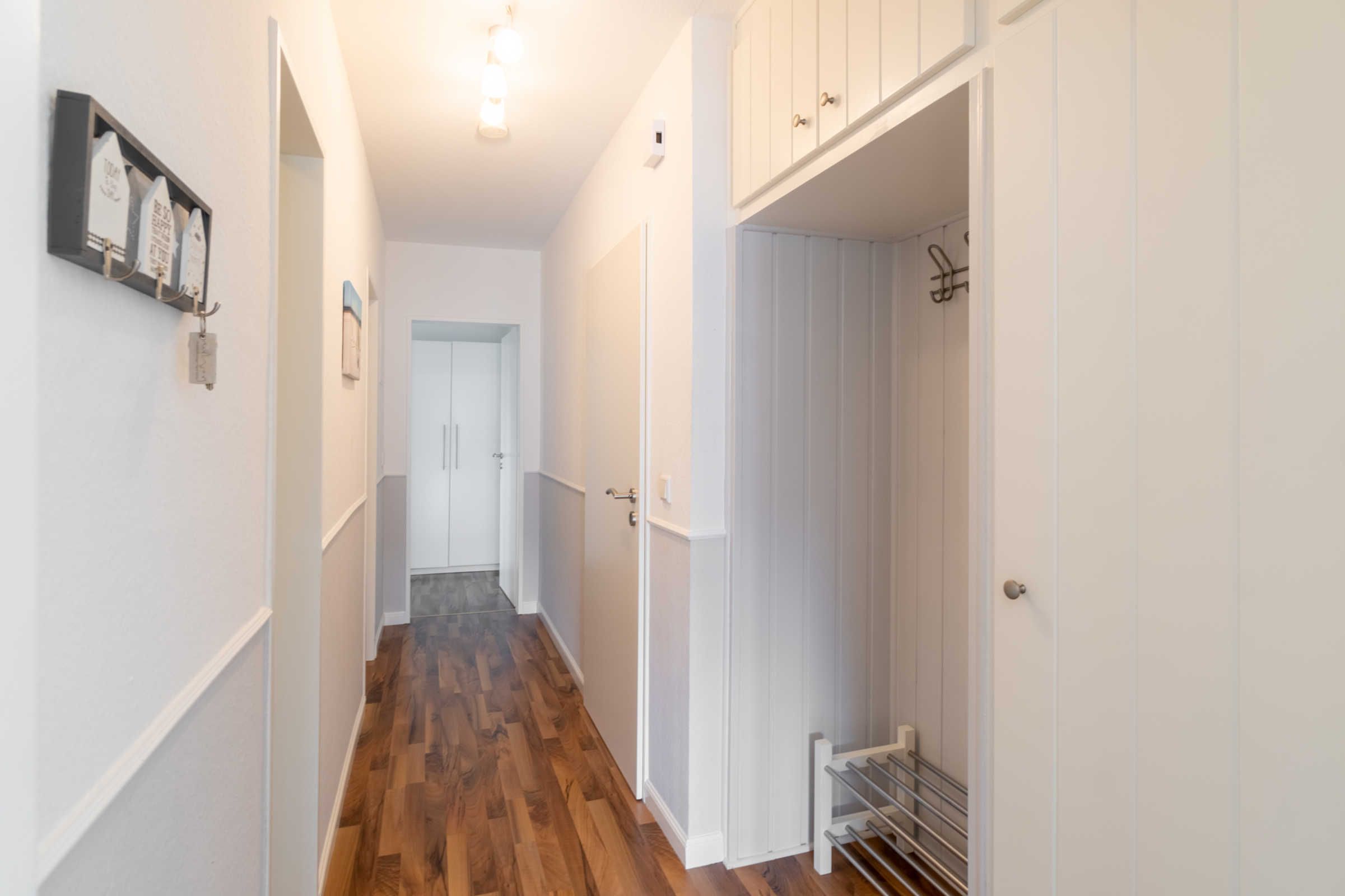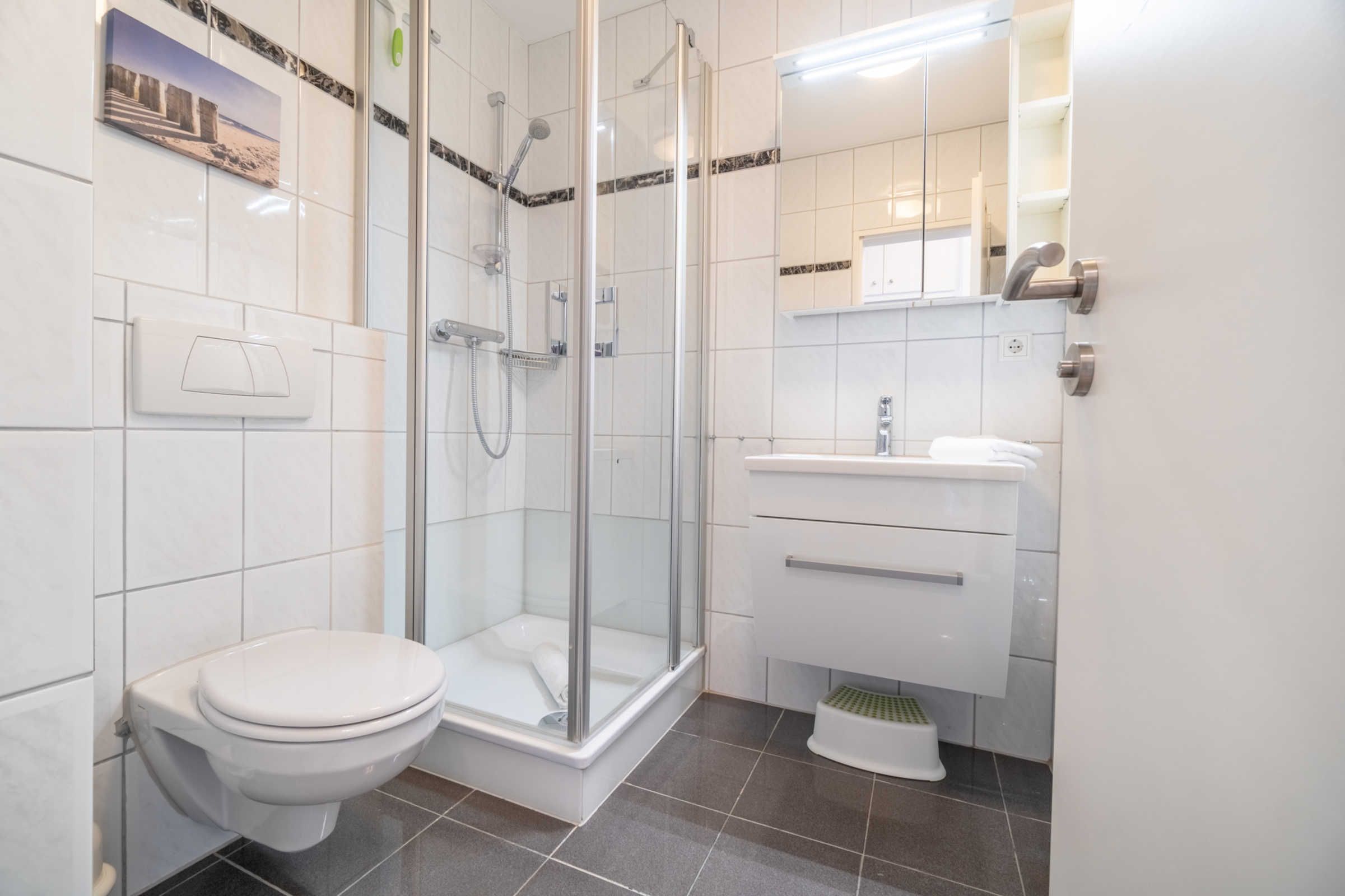 Die Wohnung liegt im Obergeschoss rechts und bietet Platz für bis zu 2 Personen mit Kleinkind. Sie hat einen Zugang zum Westbalkon.