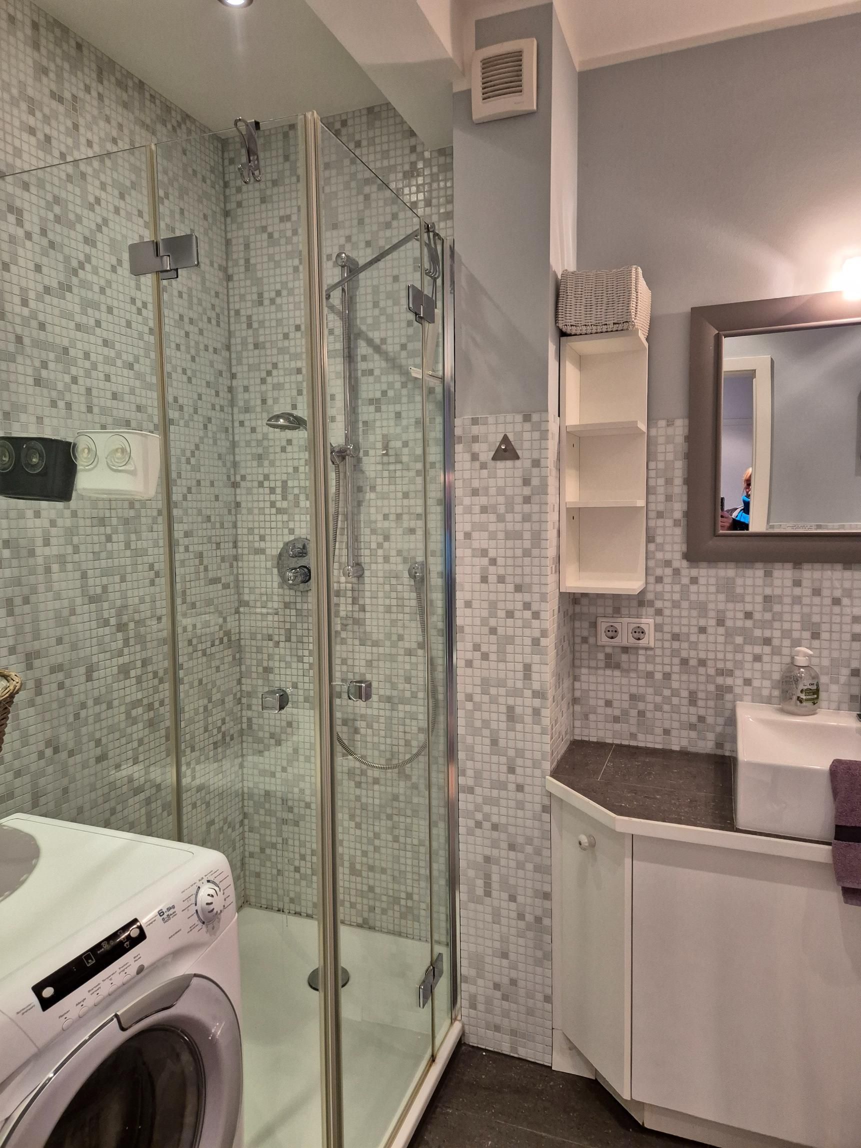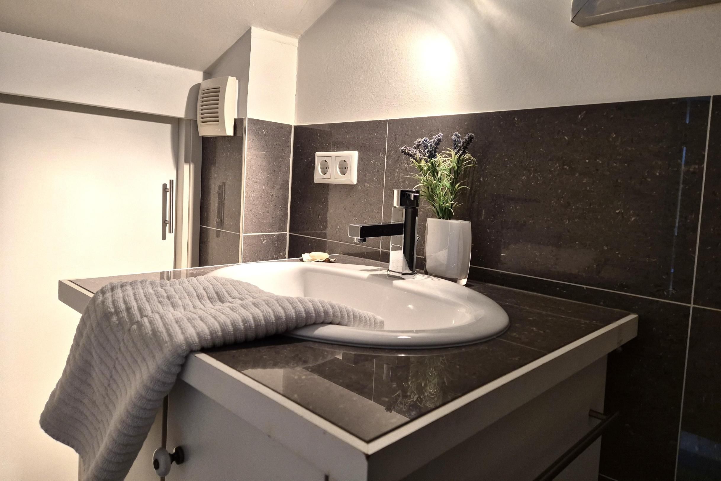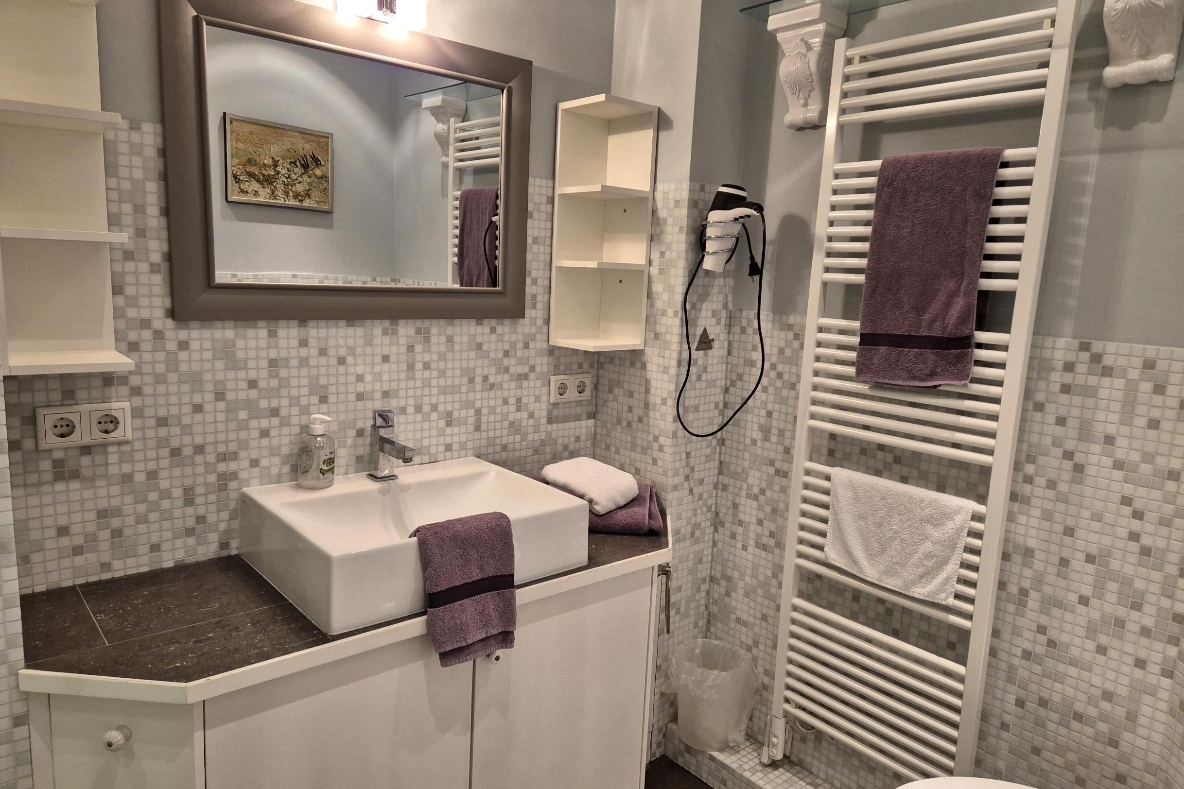 Sanitär: bodenebene Dusche, Föhn, Handtuchheizkörper, Schminkspiegel.