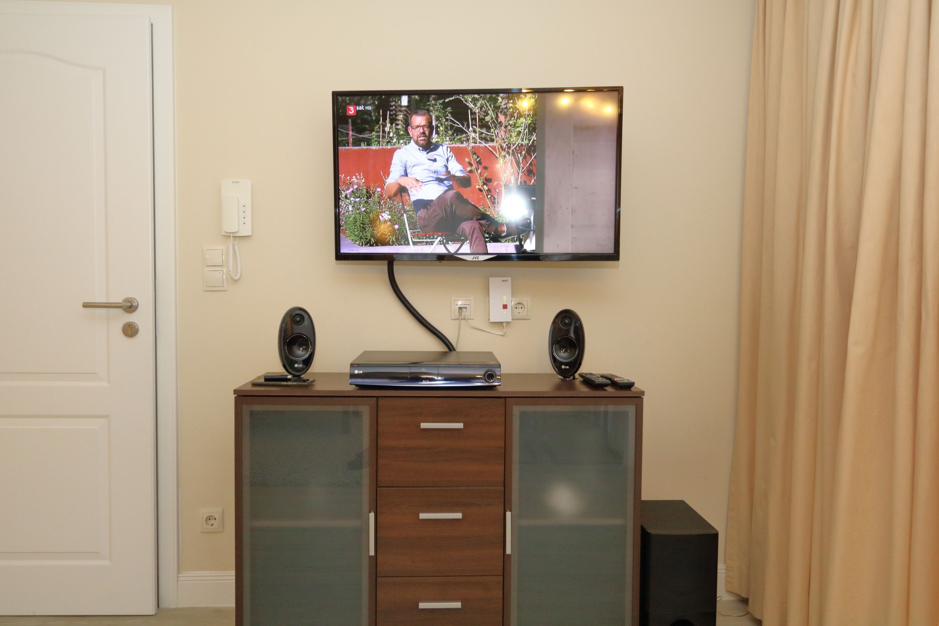 Ein großer Fernseher mit Smart-TV und ein kleines Stereoradio sorgen für Unterhaltung.