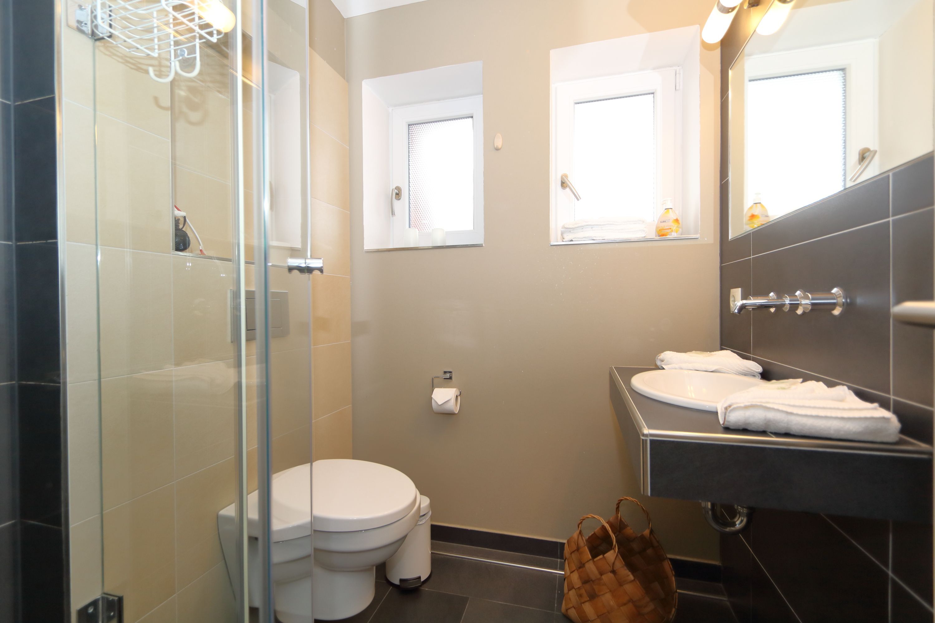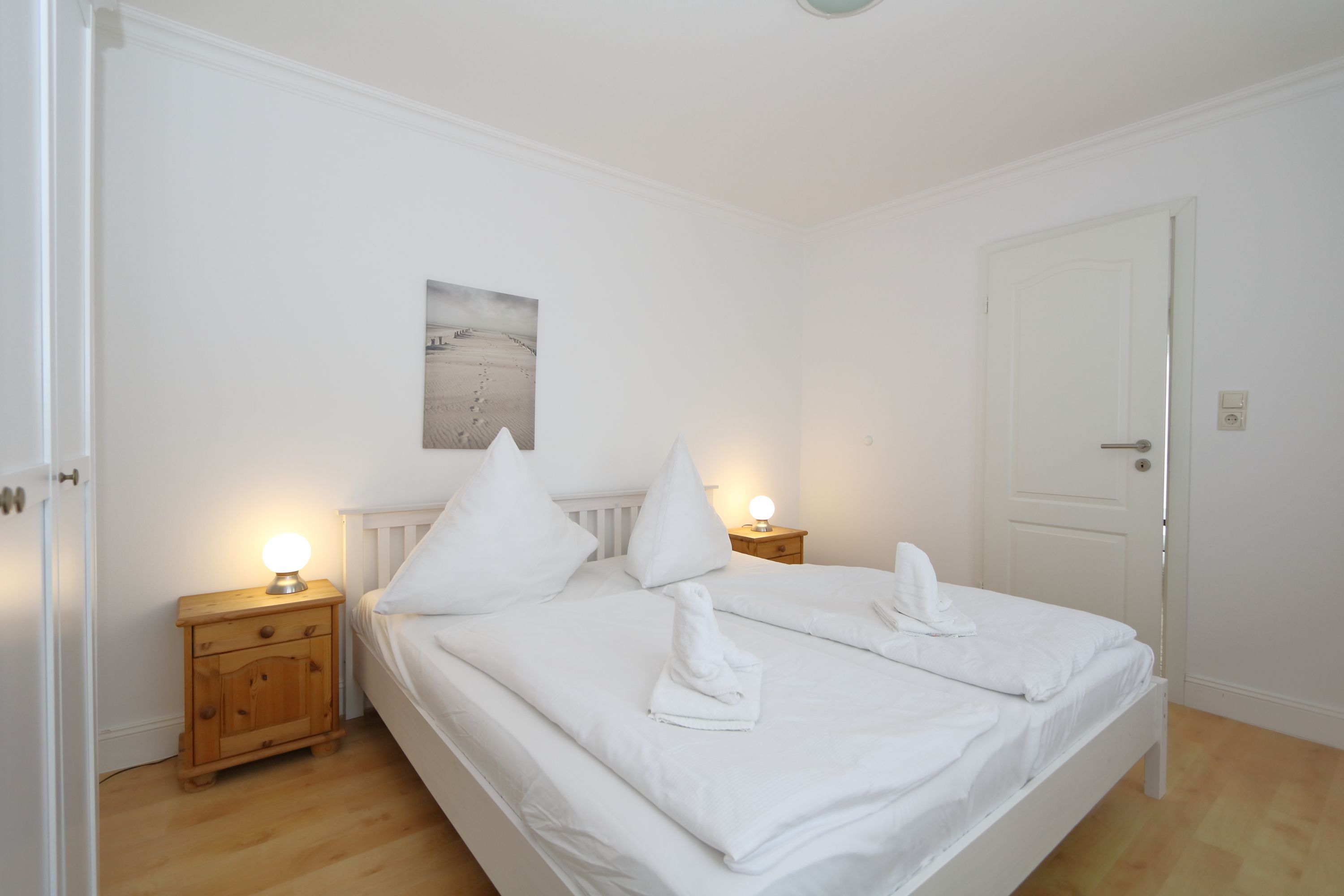 Im Flur befindet sich eine Garderobe. Von hier aus kommen Sie in das moderne Duschbad oder in das neue Schlafzimmer mit Doppelbett und großem Kleiderschrank.