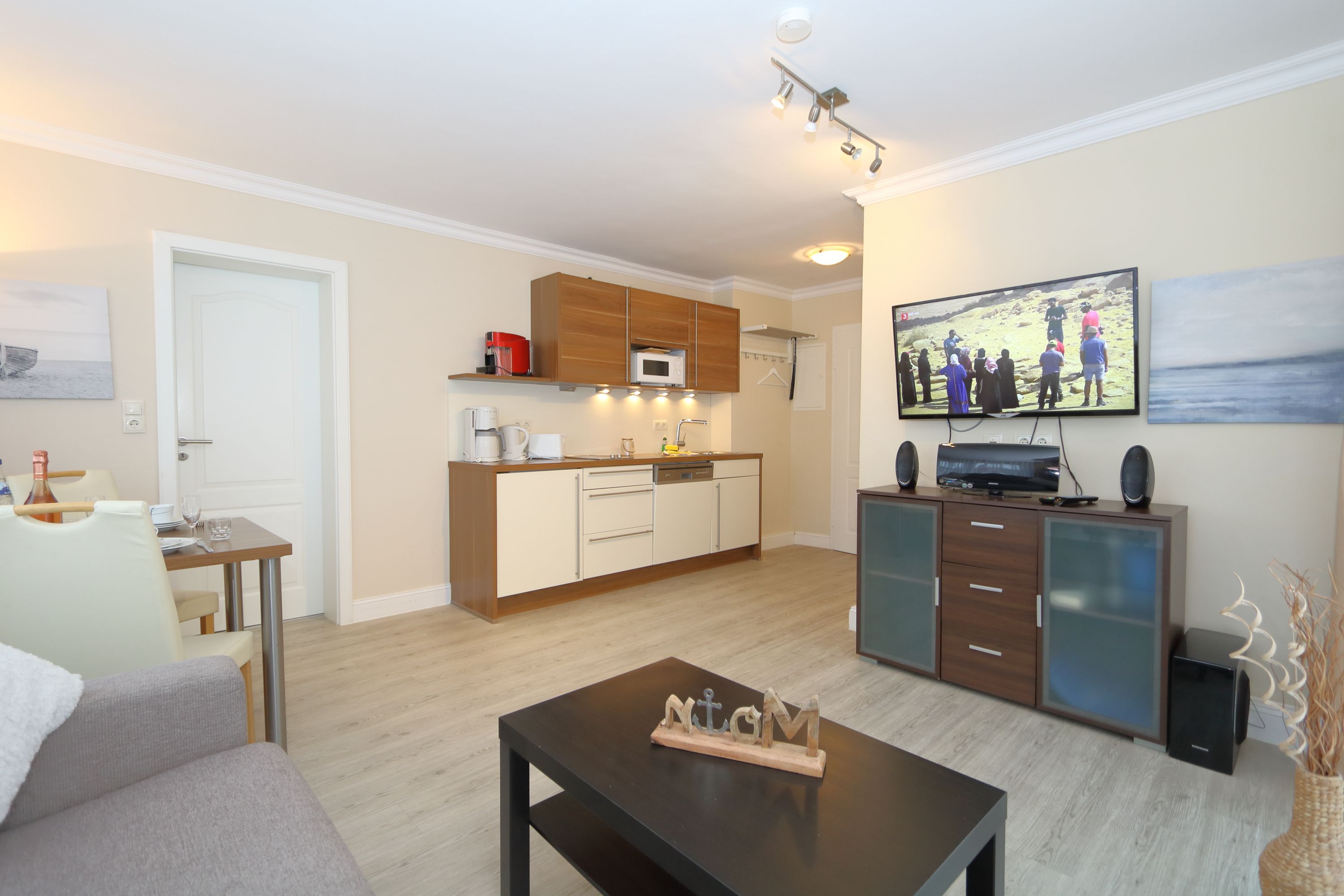 Ein großer Fernseher mit Smart-TV und ein kleines Stereoradio sorgen für Unterhaltung.