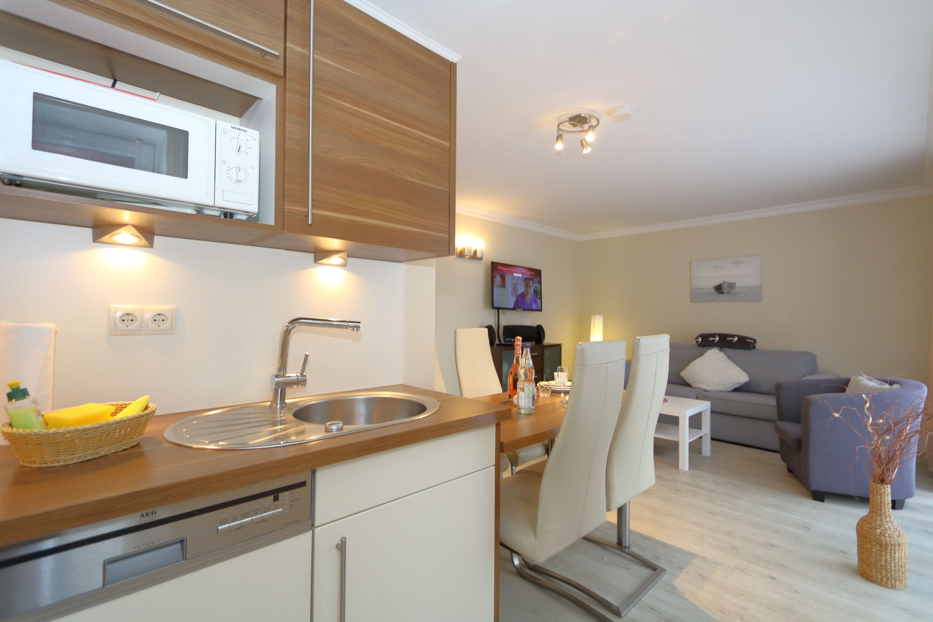 Die Küchenzeile ist mit Spülmaschine und Toaster, Microwelle und Kaffeemaschine sowie Wasserkocher und allen erforderlichen Küchenutensilien komplett ausgestattet.