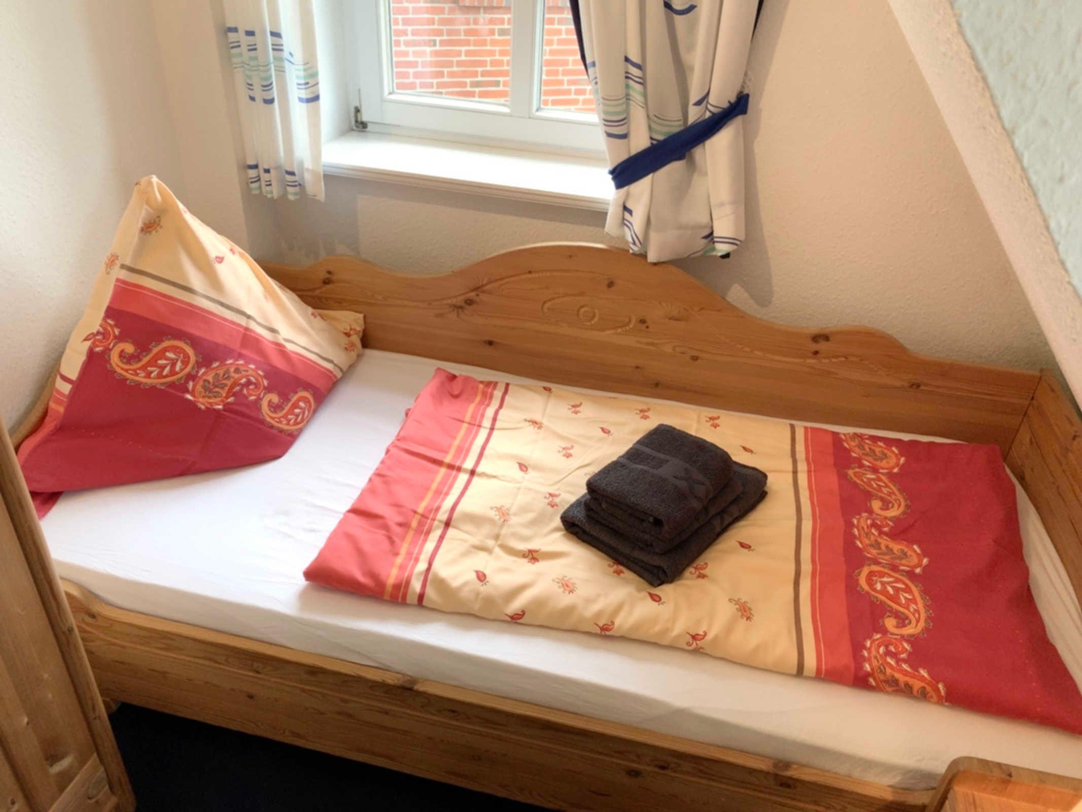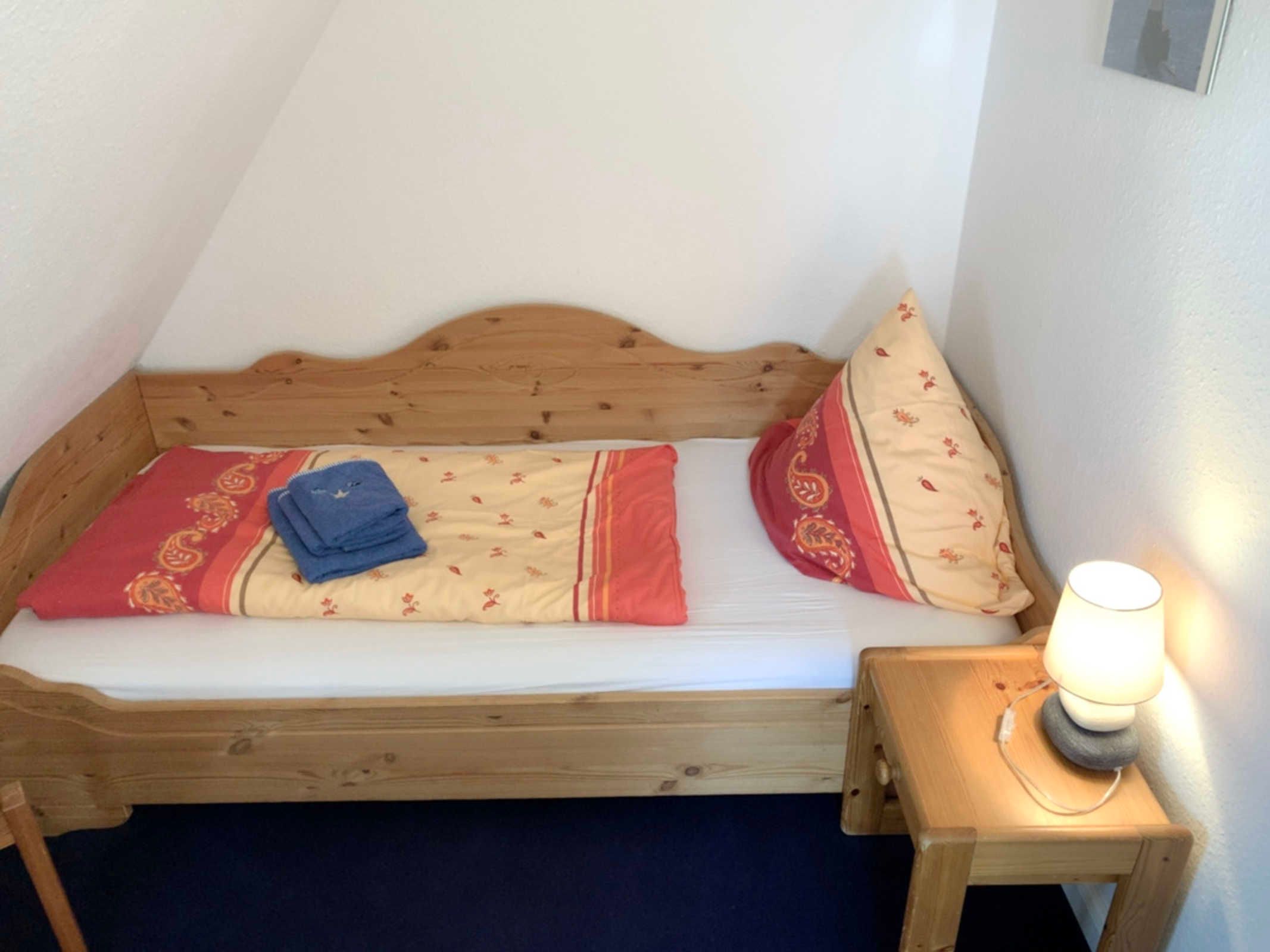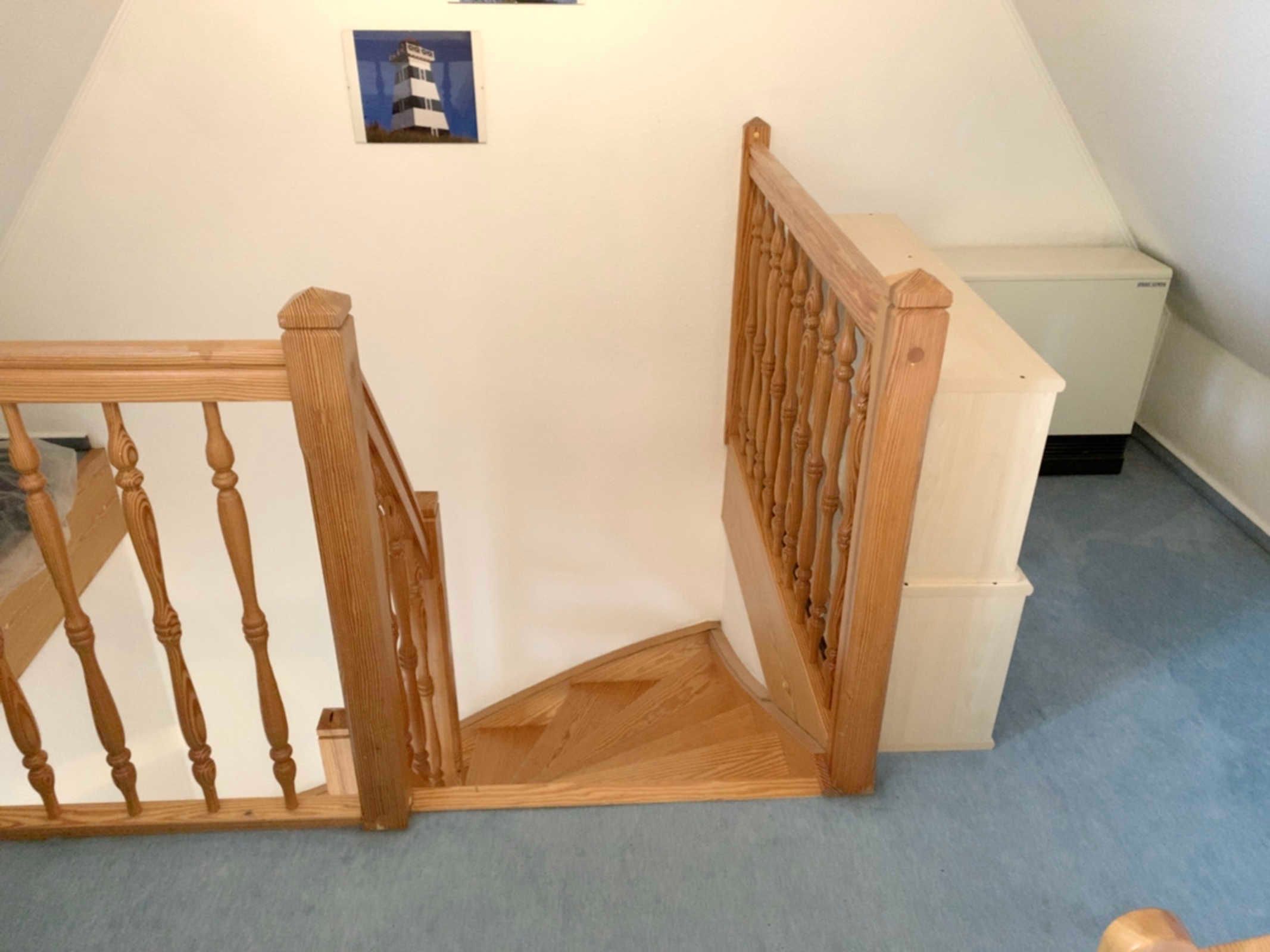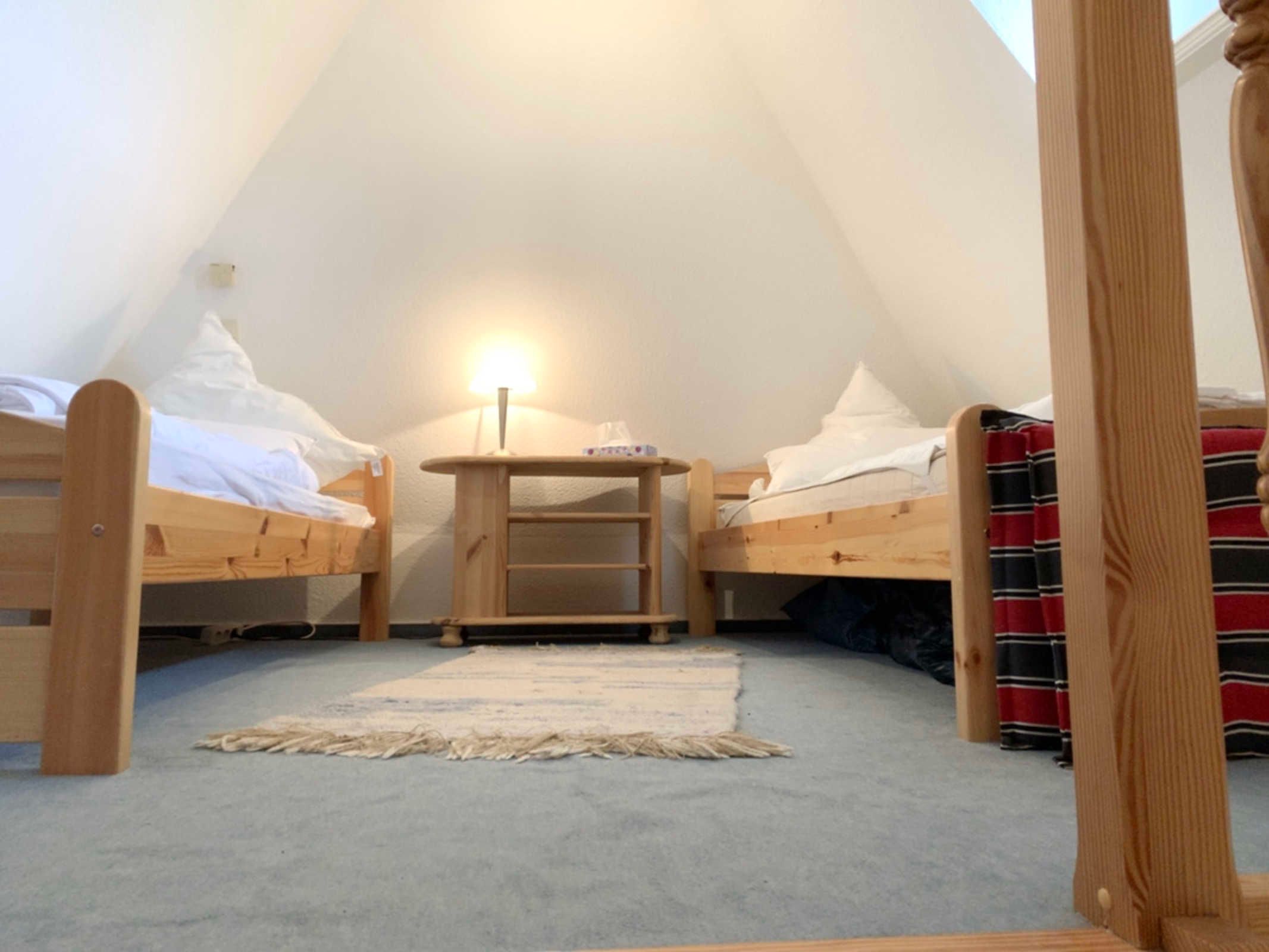 Zwei Schlafzimmer, eines mit einem Doppelbett und ein weiteres mit zwei Einzelbetten, sowie Dusche/WC befinden sich im 1. Stock, ein drittes Schlafzimmer mit ebenfalls zwei Einzelbetten im oberen, als Galerie ausgebauten Giebelzimmer. Zum Ferienhaus gehört ein PKW-Stellplatz.